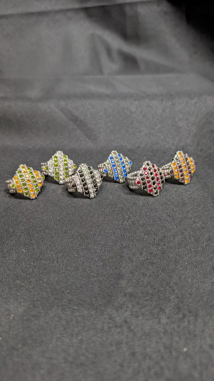 crisscross diagonal rows of sparkling rhinestones set in silver-tone Flexible fit across multiple finger sizes 1990-2000