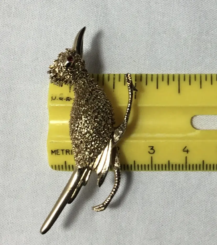 2.25 inches long by 1 inch high, gold tone metal roadrunner with red rhinestone eye. Bird is in running position with legs stretched out. Feathers are textured into the metal. Clasp has rotating safety closure. Very good condition, gold tone on tips of some feathers is worn off, but very hard to see.