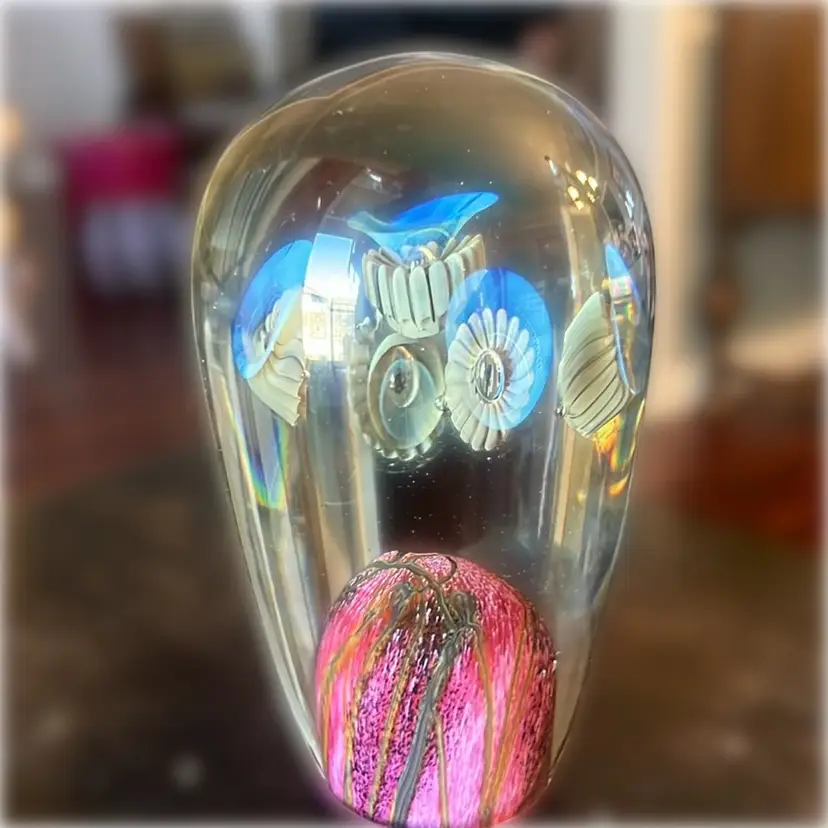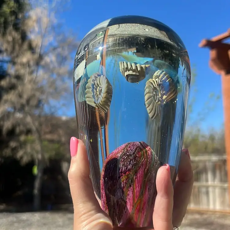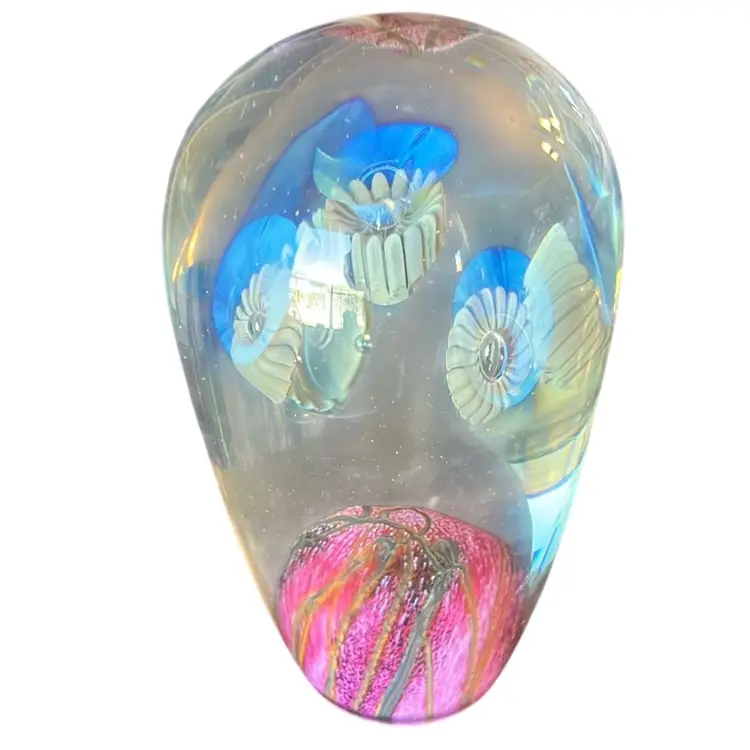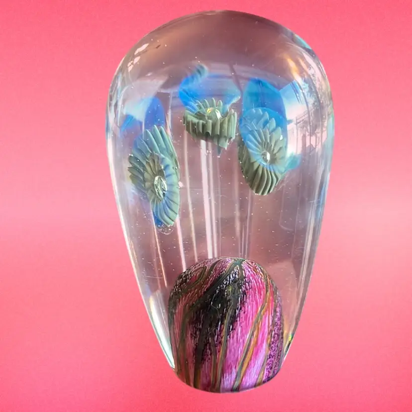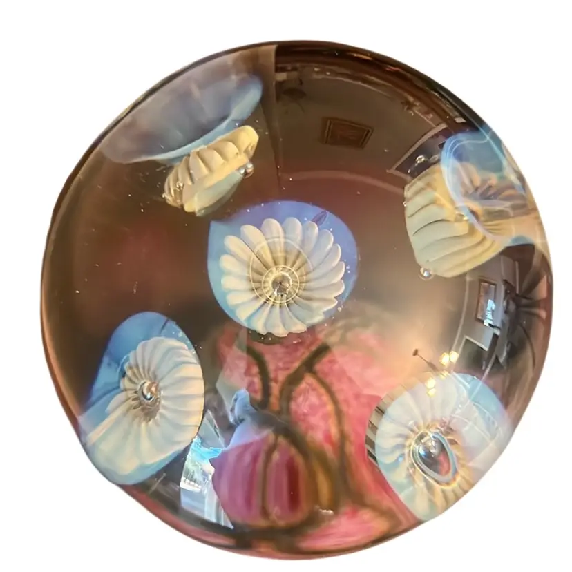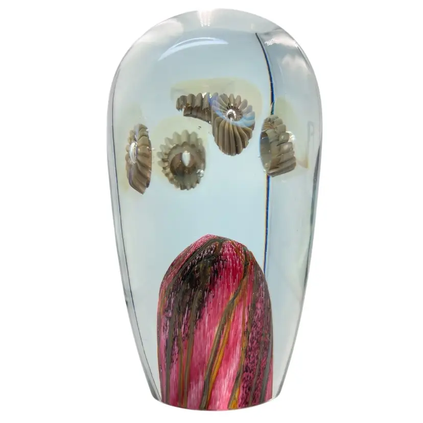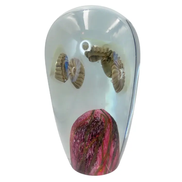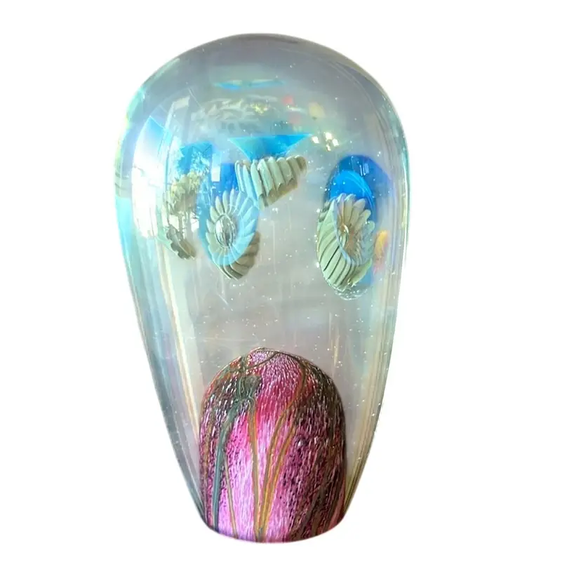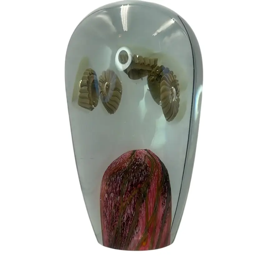 An absolute stunner! This 5.12 pound 7” tall Eickholt is mesmerizing. The gorgeous pink coral and floating sea urchins are clearly seen in the crystal clear sea! Come to the Paperweight Extravaganza to see it live, along with many other best of show paperweights! April 18 & 19. No damage, no chips, cracks, or bruises. She will be traveling on her own and double boxed! Etched signature along with original sale sticker!