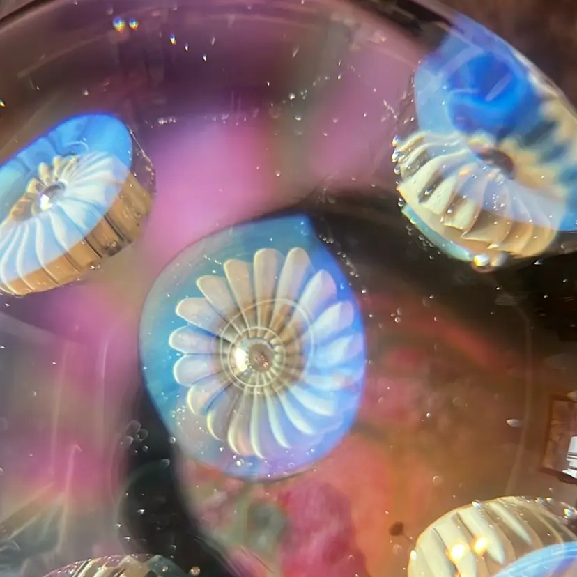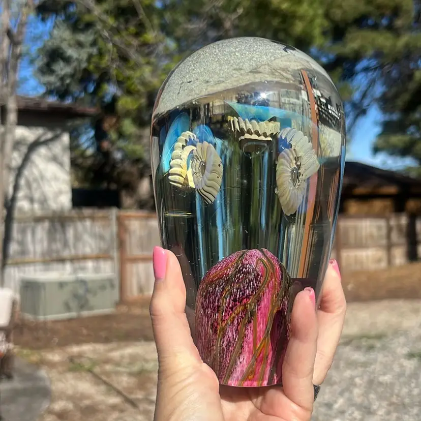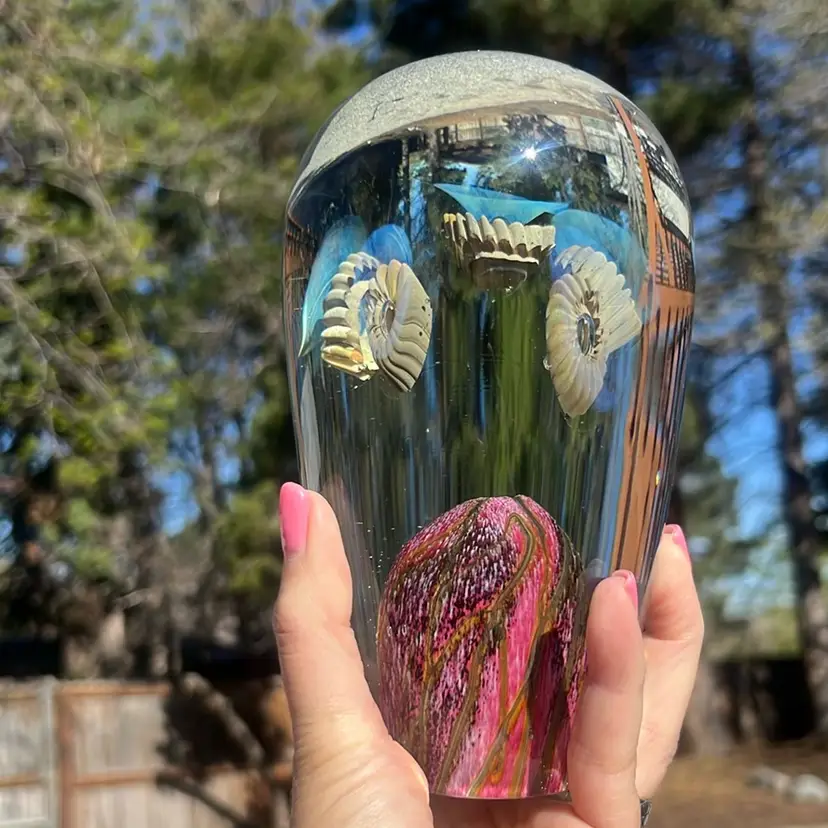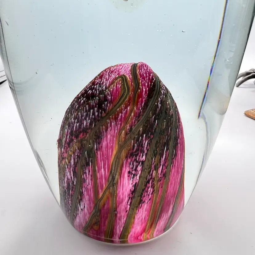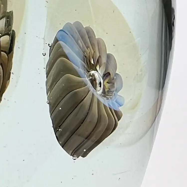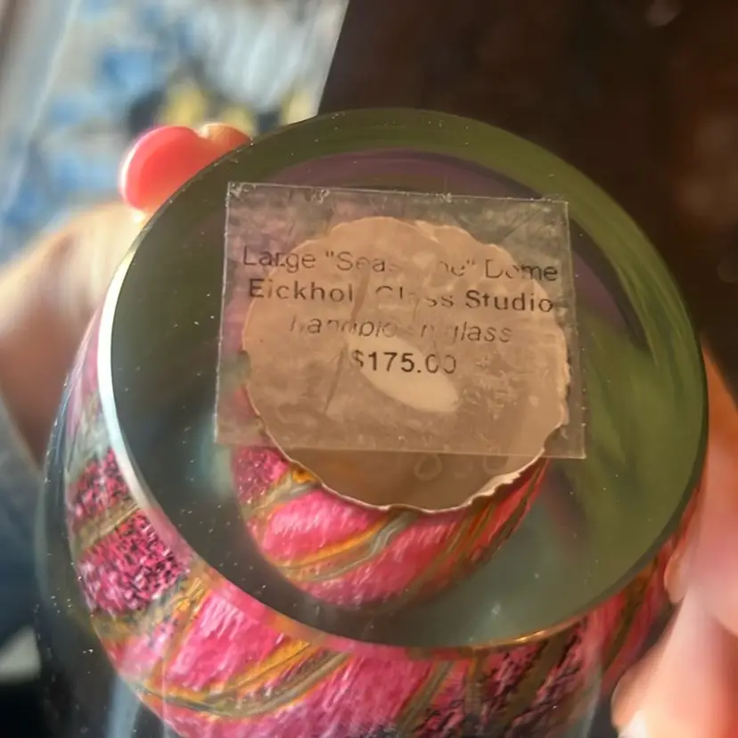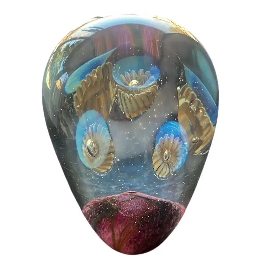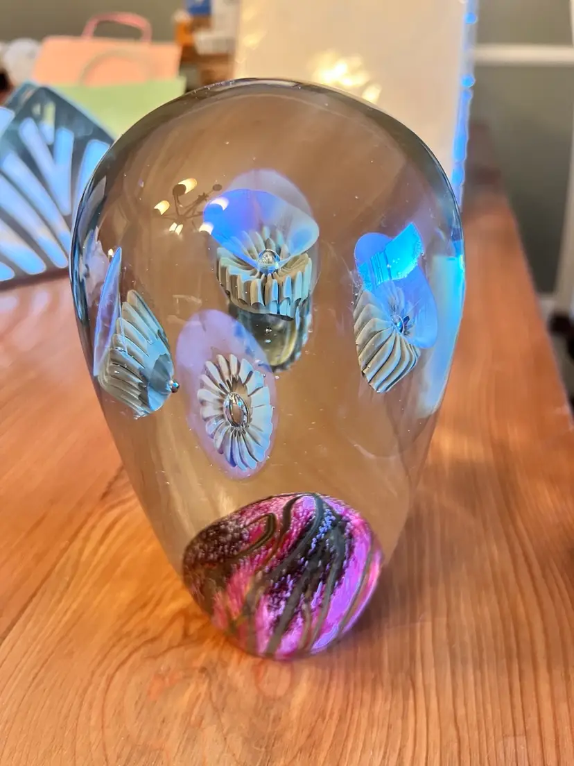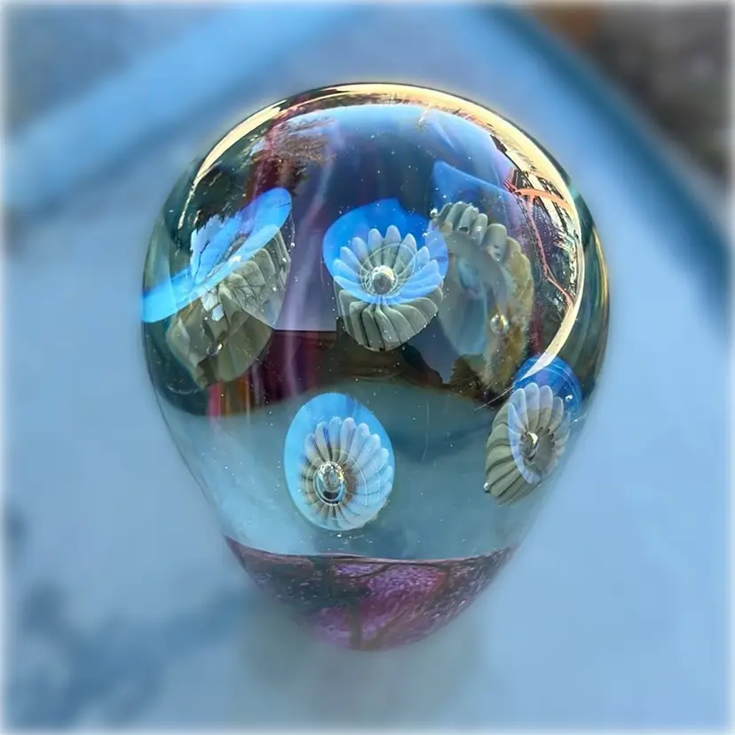 An absolute stunner! This 5.12 pound 7” tall Eickholt is mesmerizing. The gorgeous pink coral and floating sea urchins are clearly seen in the crystal clear sea! Come to the Paperweight Extravaganza to see it live, along with many other best of show paperweights! April 18 & 19. No damage, no chips, cracks, or bruises. She will be traveling on her own and double boxed! Etched signature along with original sale sticker!