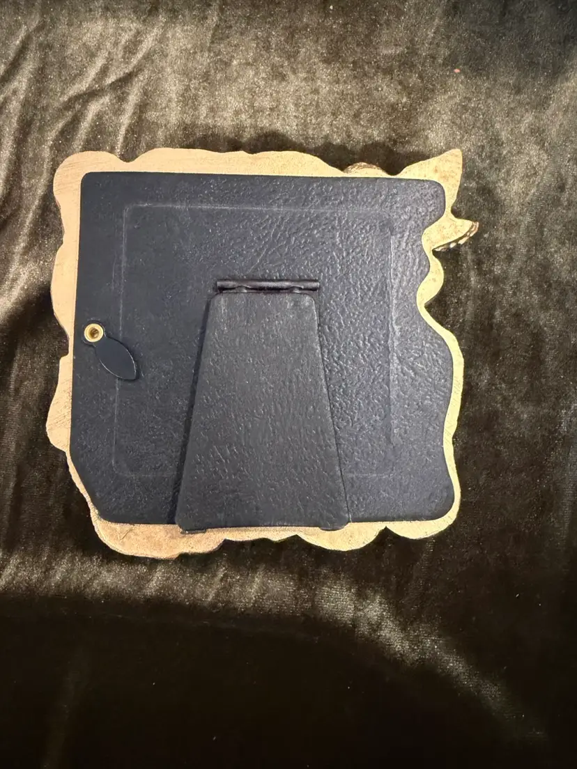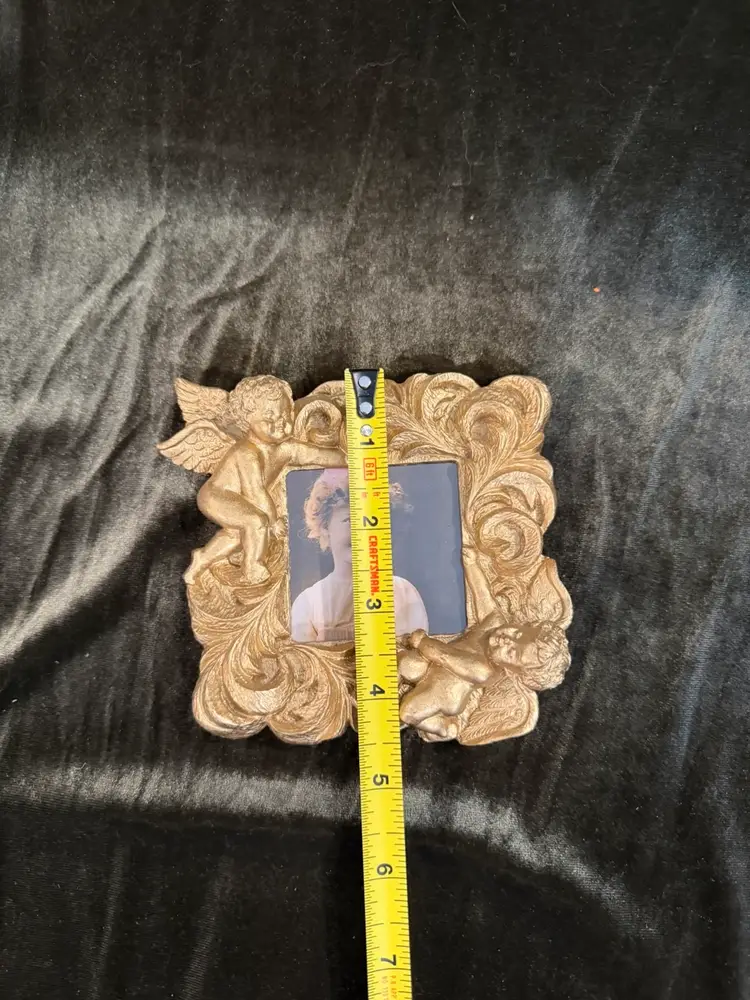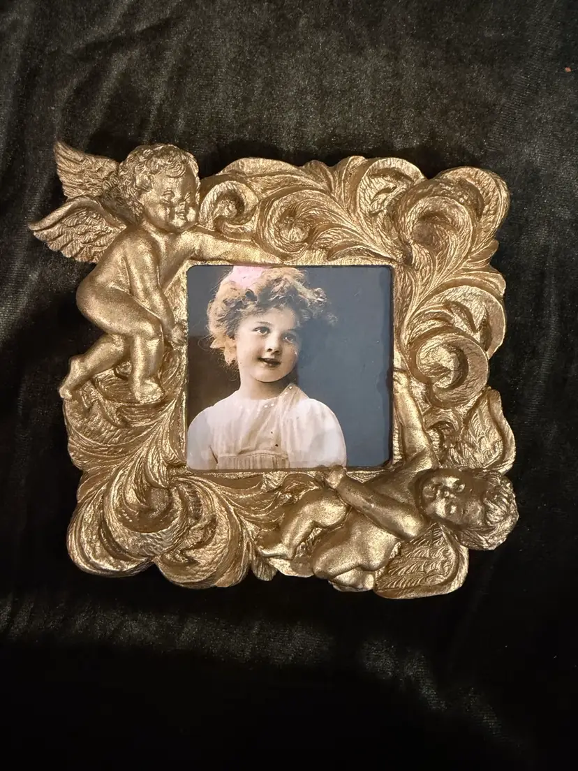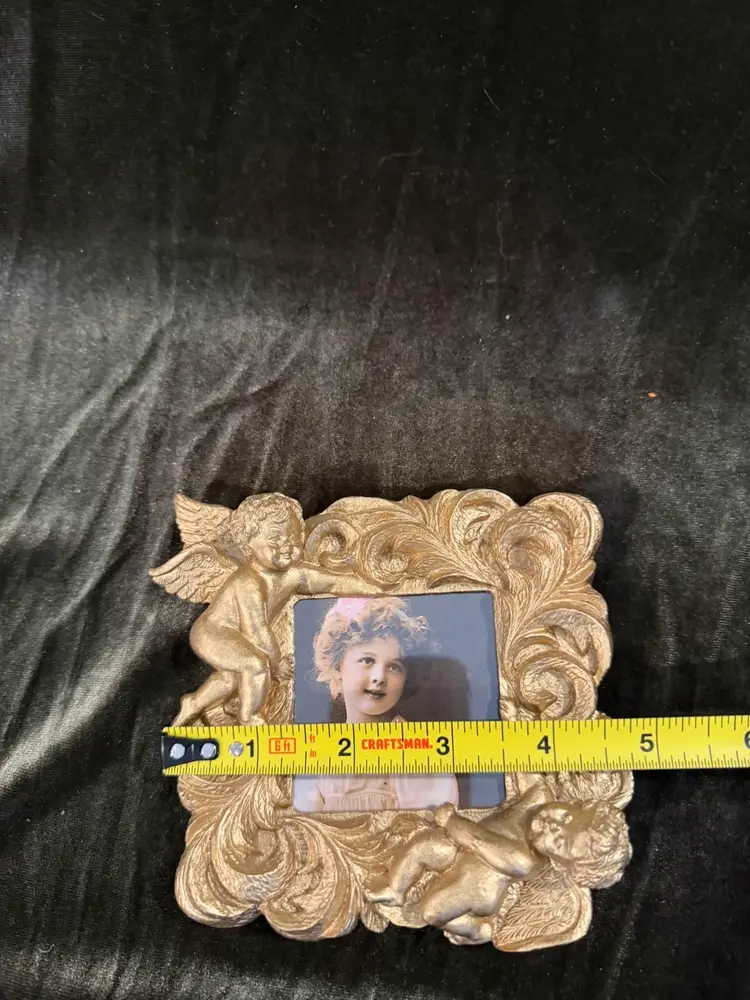 A small, ornate gold-toned resin picture frame featuring two cherubs amidst Rococo-style scrollwork, containing a vintage-style portrait print.
