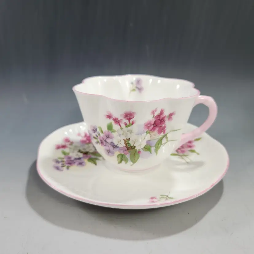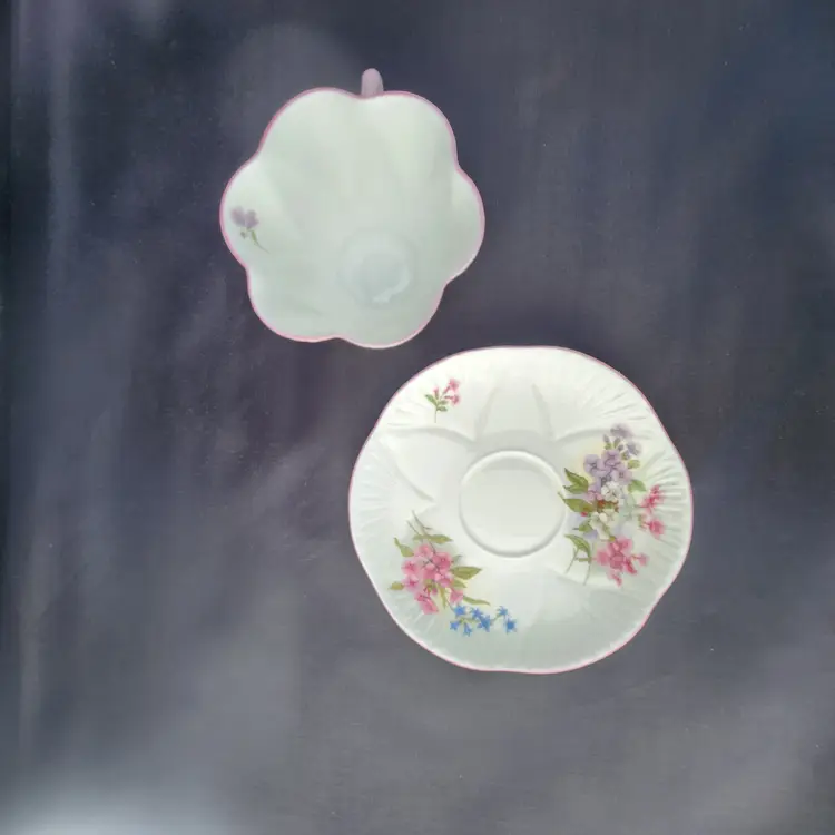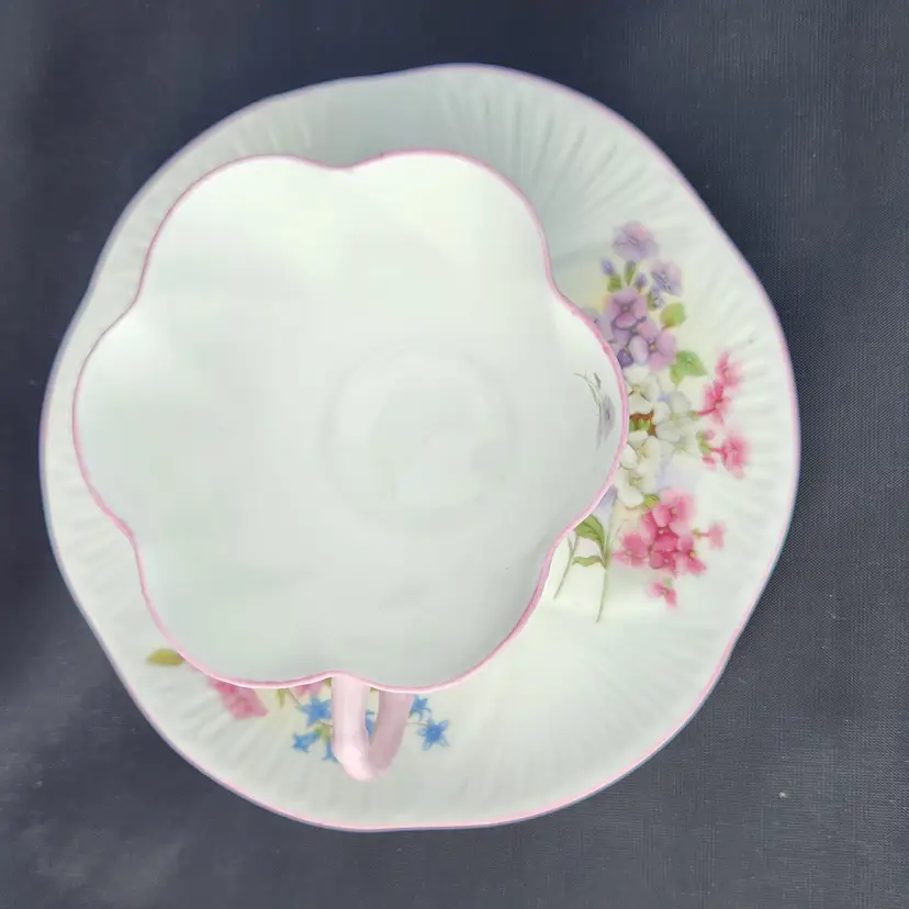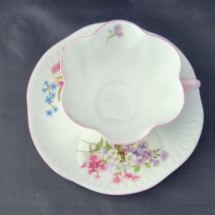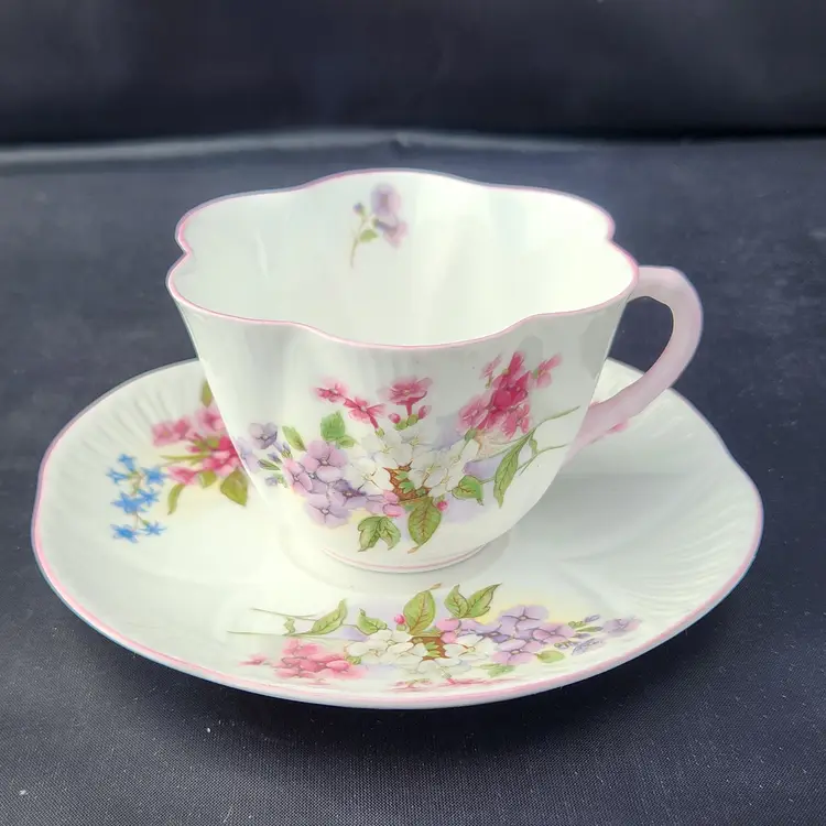 Perfect for spring! This pastel floral Shelley tea cup & saucer in their "Stocks" pattern & famous dainty shape. Pink stocks symbolize happiness and the joy of new beginnings and are frequently associated with weddings. Lovely symbolism for a wedding or shower gift. The mark dates all of these to 1945 - 66.