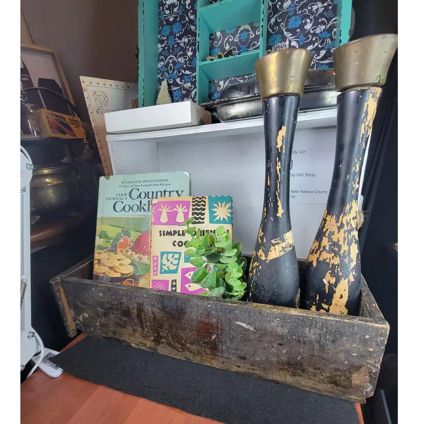 Vintage wooden drawer box with a rustic finish. Perfect for adding a touch of farmhouse style to your decor. Drawers are great for adding items to create a vignette, to store cookbooks, hang and use as a shelf...many uses! Think outside of the drawer!
