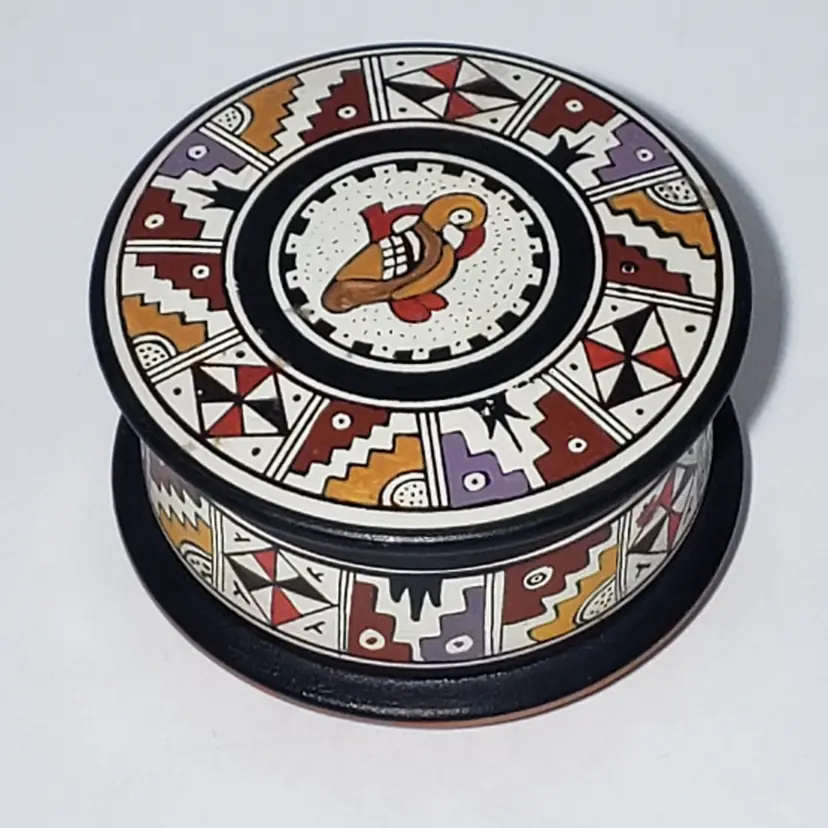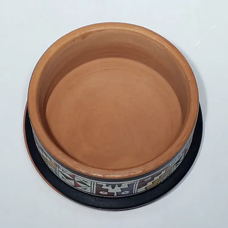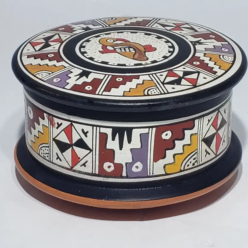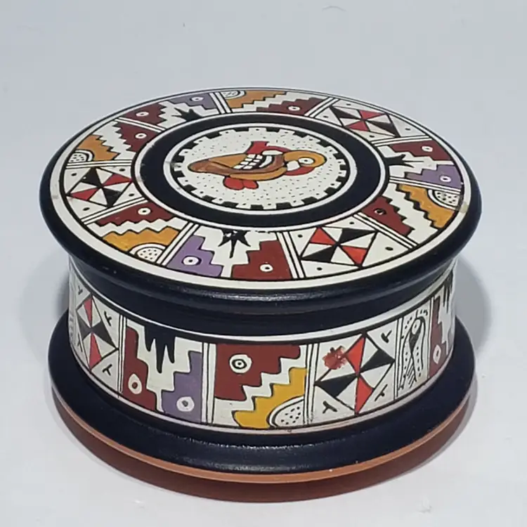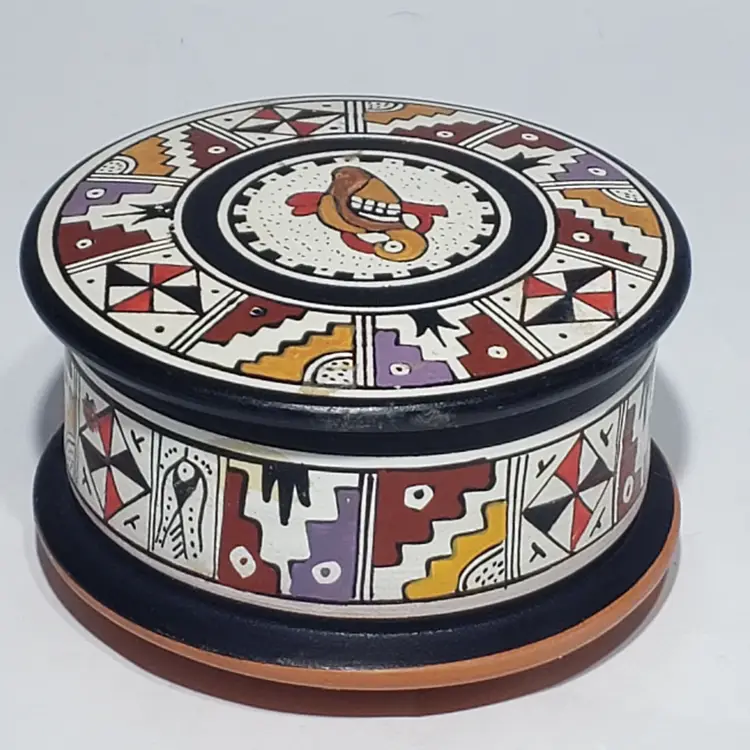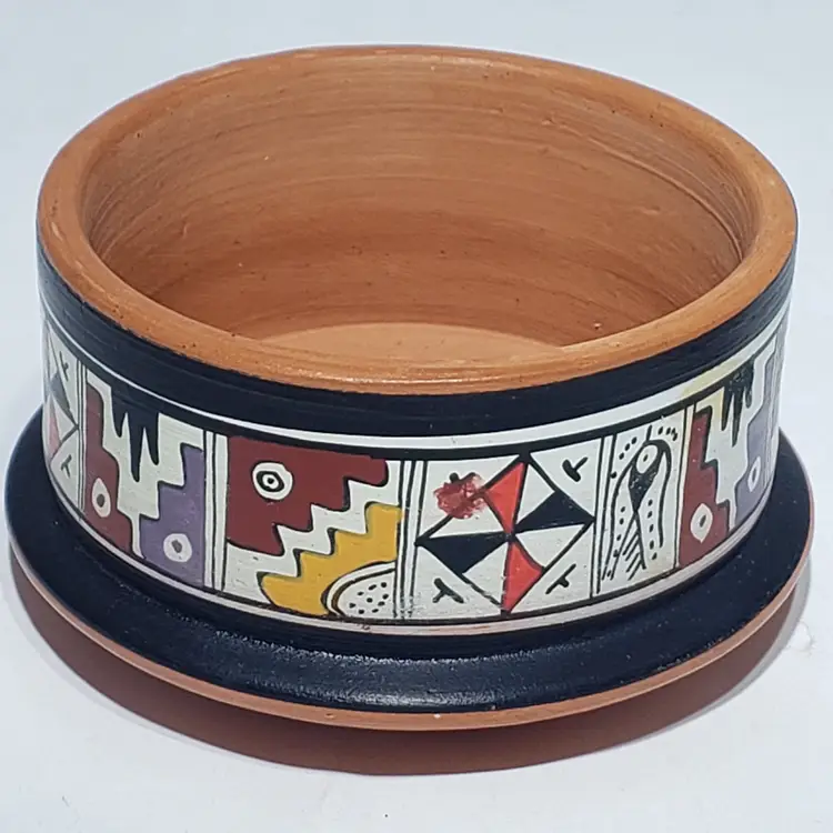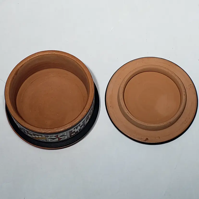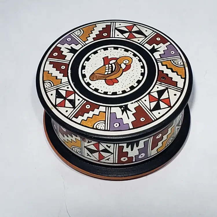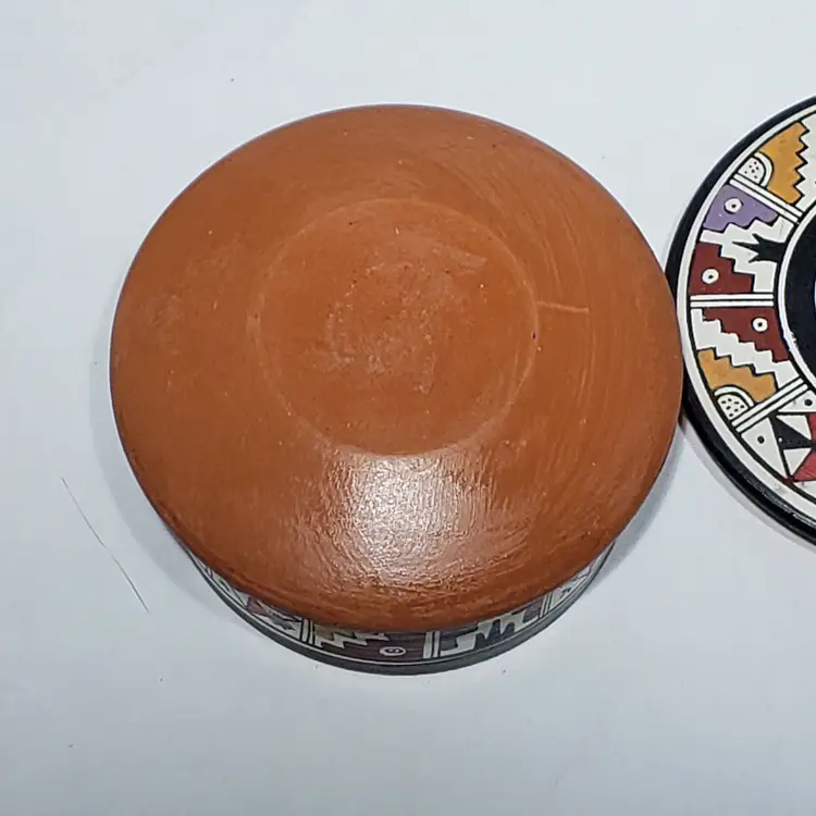 Peruvian Terracotta Clay Redware Hand Painted Round Lidded Trinket Dish Measures: 3" x 3" x 1.5" Pre-owned. No chips or cracks. See Photos.