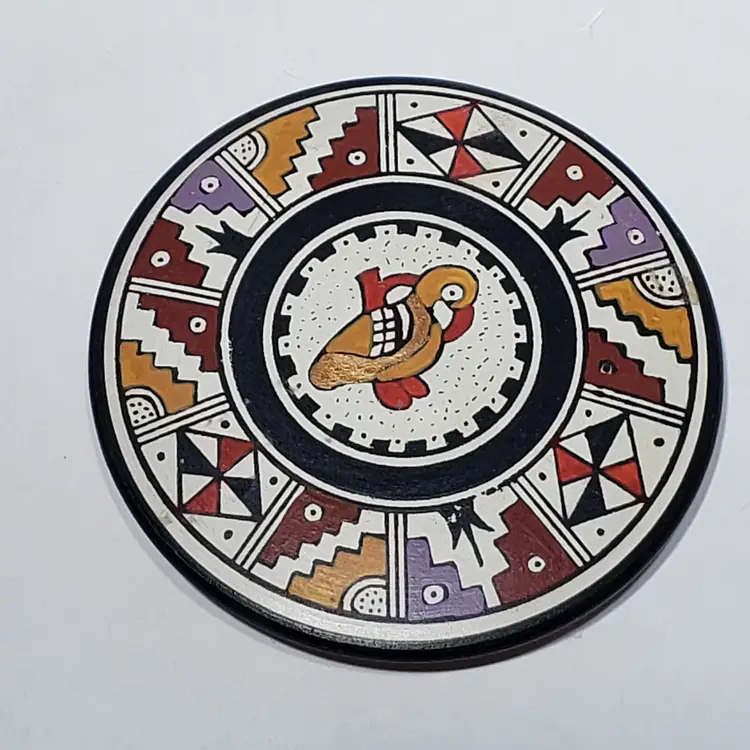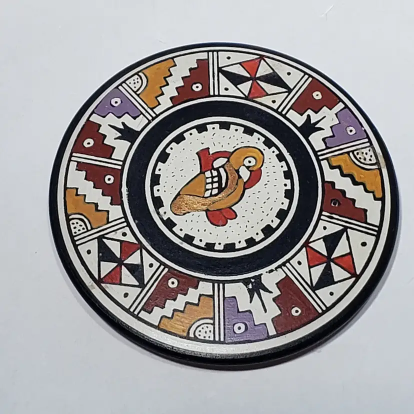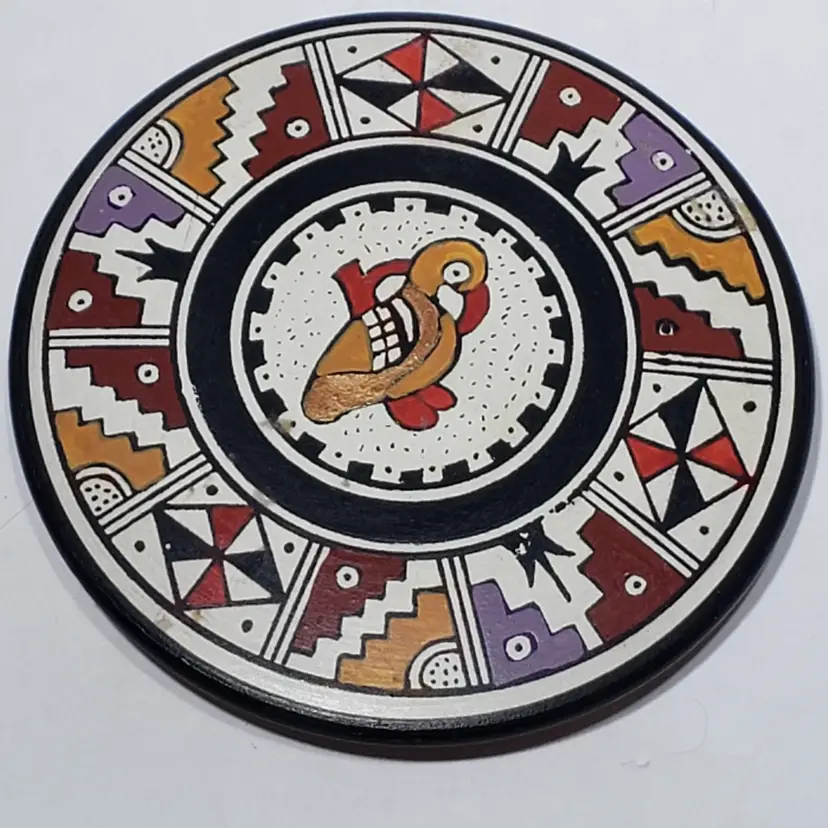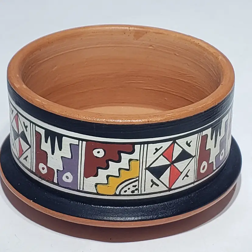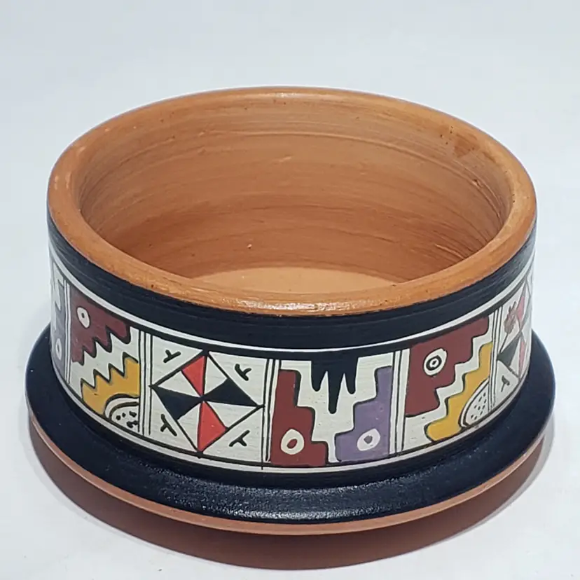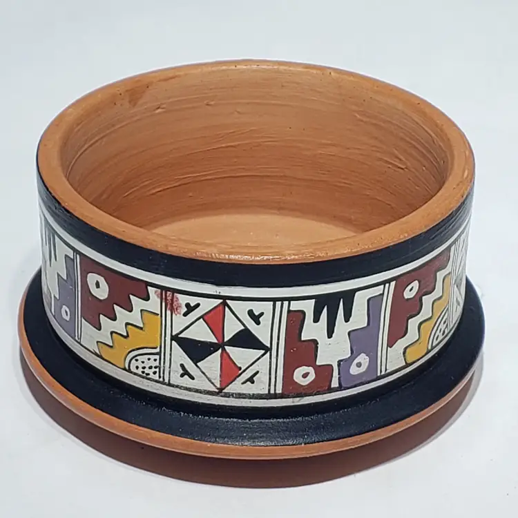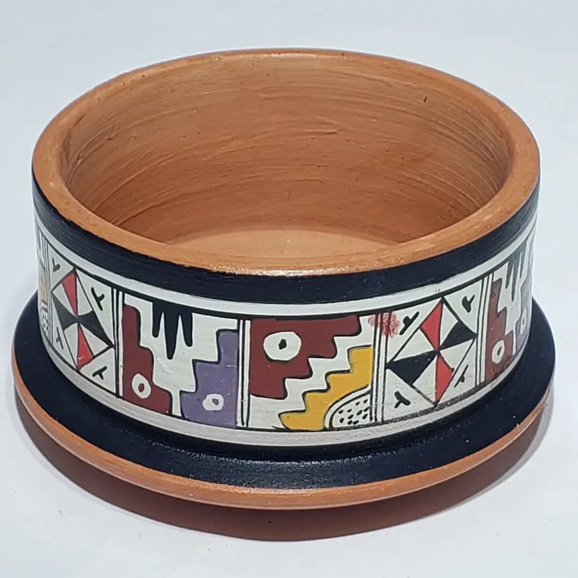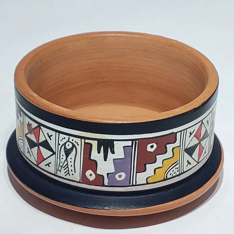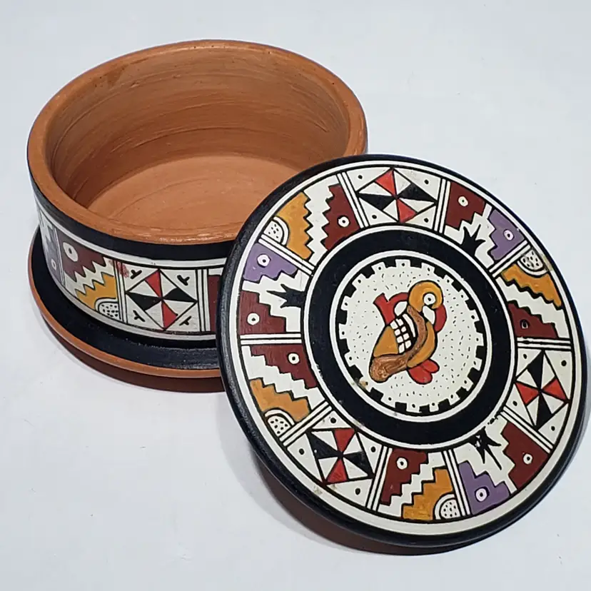 Peruvian Terracotta Clay Redware Hand Painted Round Lidded Trinket Dish Measures: 3" x 3" x 1.5" Pre-owned. No chips or cracks. See Photos.