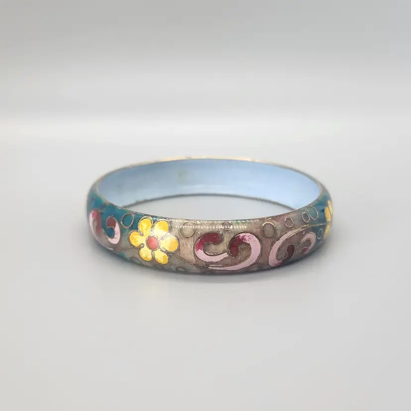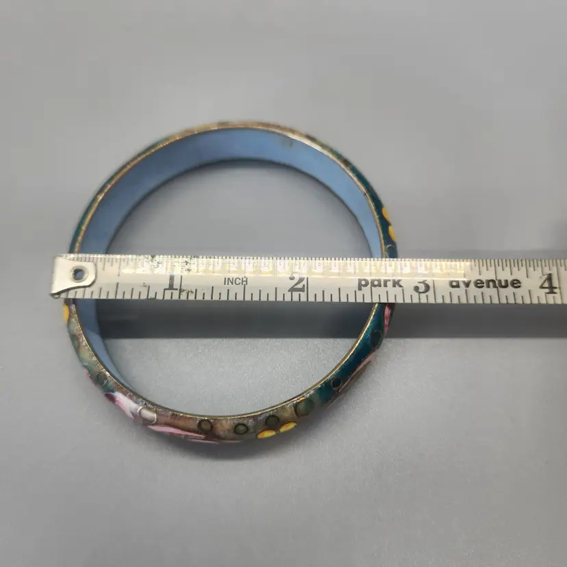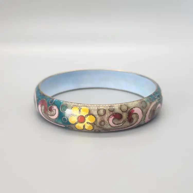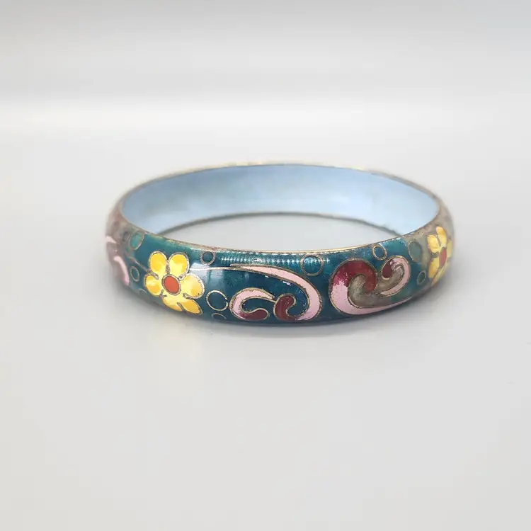 This is an unmarked enamel metal bangle / cuff bracelet. It is fairly heavy and has a cloisonne style floral design which changes from a teal to light brown background. This is possibly by Robert Kuo but it is unmarked. Comes in a new gift box, great for storage or for gifting.