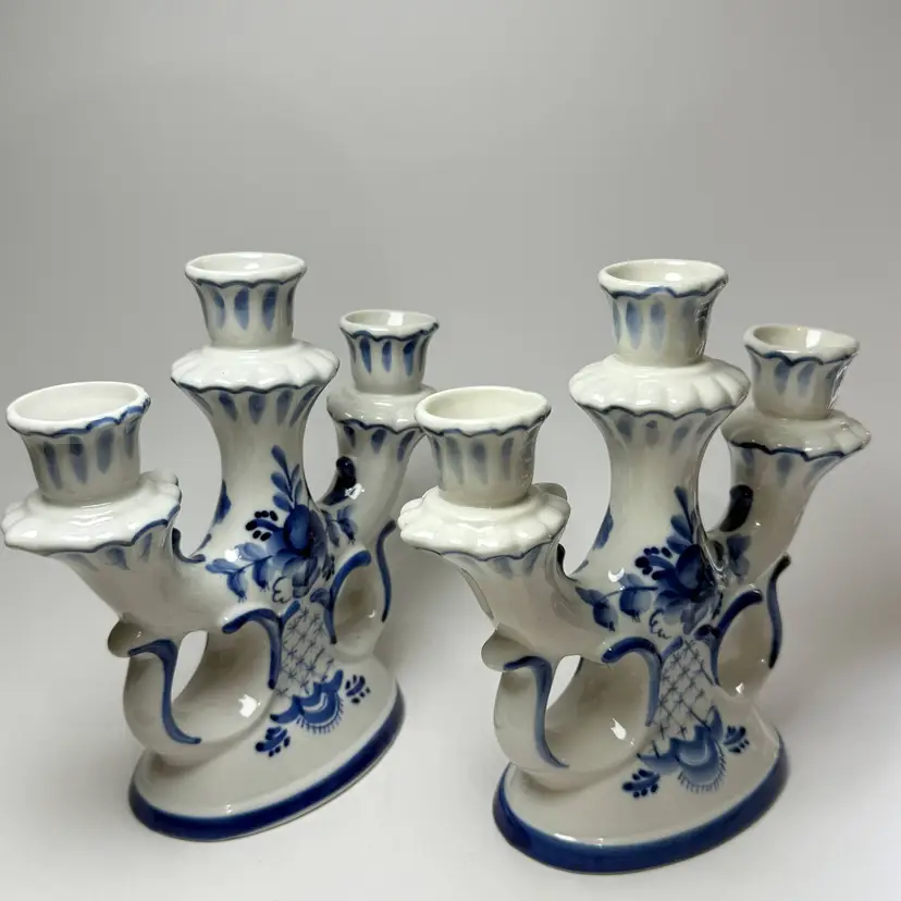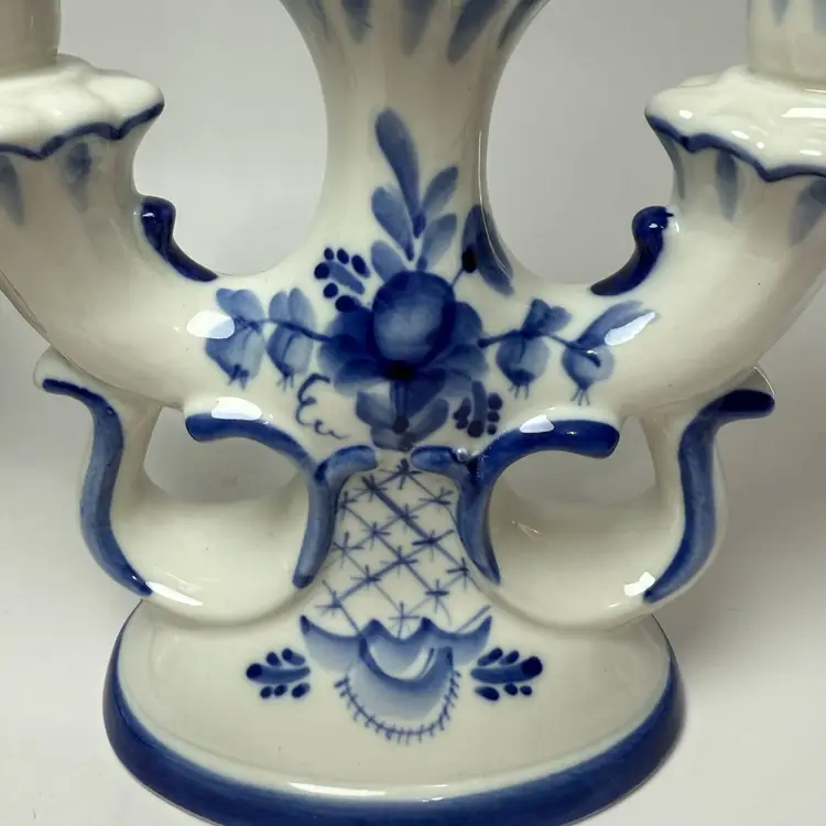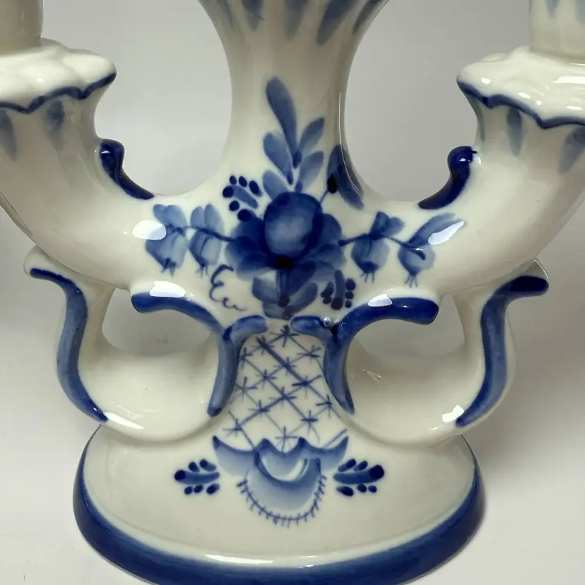 Set of 2 Vintage Gzhel Russian Triple Candle Porcelain Candelabras Blue White Floral Hand Painted. Made in Russia. Folk art. No chips, no cracks. Comes in original box. I do not think these have ever been used. 8" tall x 5" x 3.25" base.