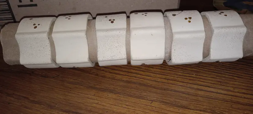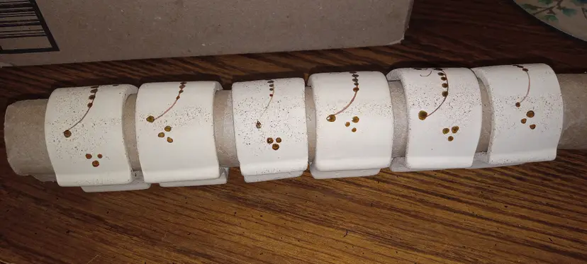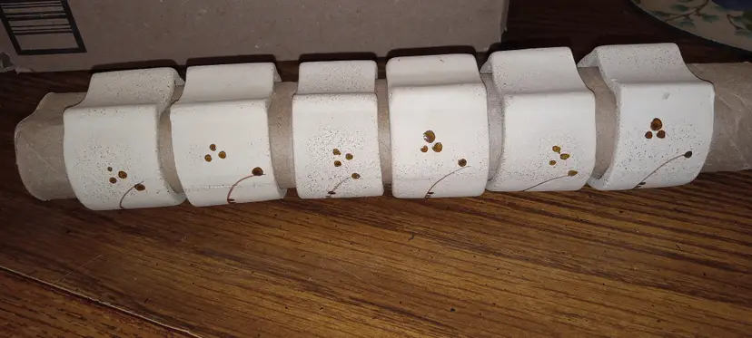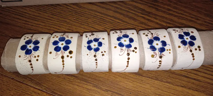 Set of 6 hand made, hand painted Tonala Style Mexican pottery Napkin Rings. Each is constructed of Creamy Colored unglazed Pottery with Glazed flowers in the Traditional Tonala colors of Blue Flowers with Brown leaves and accents. There are no markings or signature. There is no damage. Rustic and Decorative touch to table settings. Each piece is just large enough to slip over a cardboard Paper Towel Roll