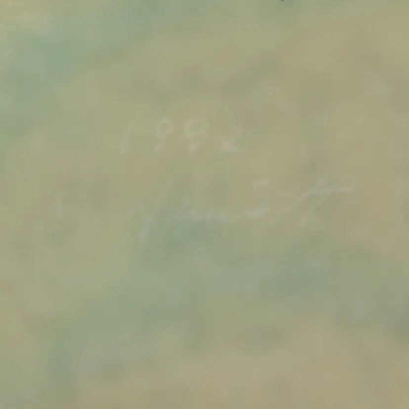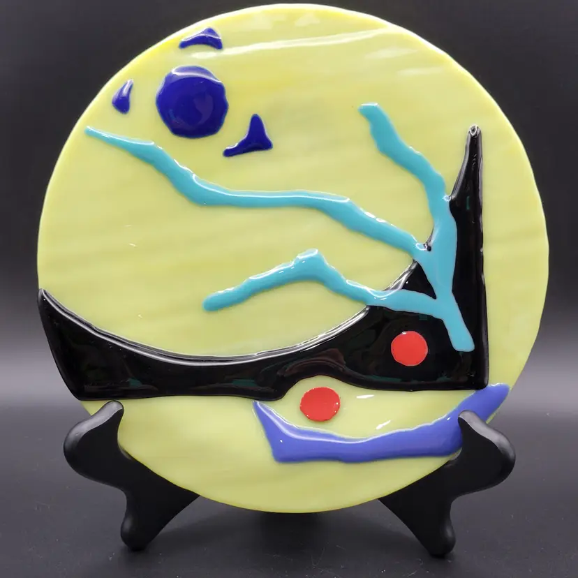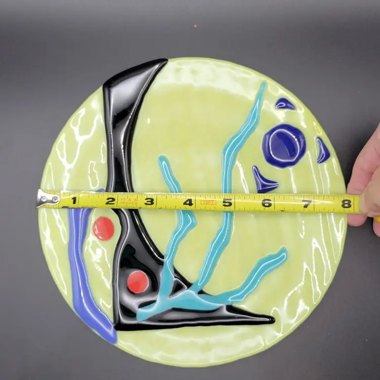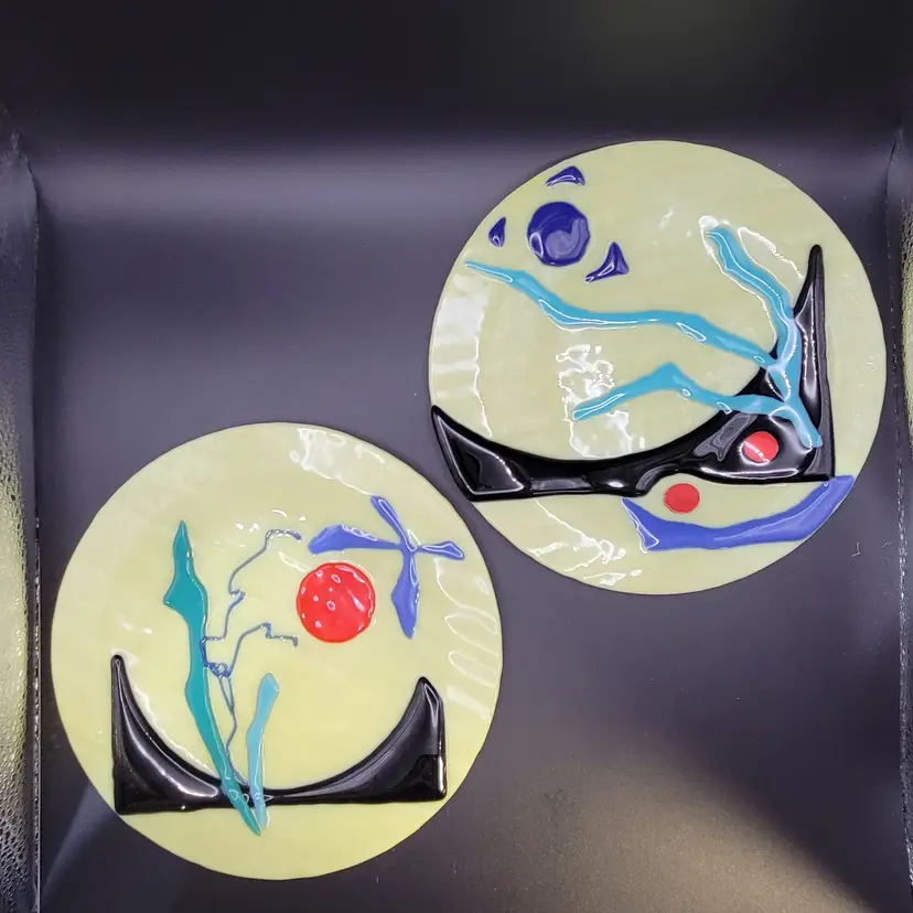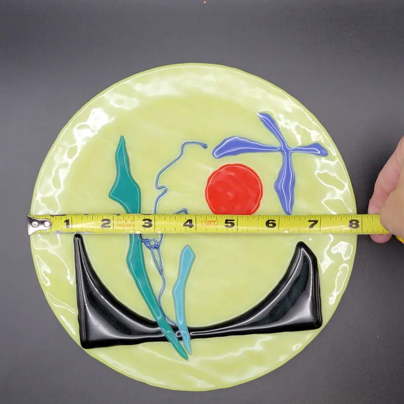A pair of fused glass plates signed and dated by artist. Southwestern vibe featuring abstract shapes and bright colors set against a yellow background. Both are in excellent condition and measure 8 inches in diameter. Thank you for looking and have a great day!