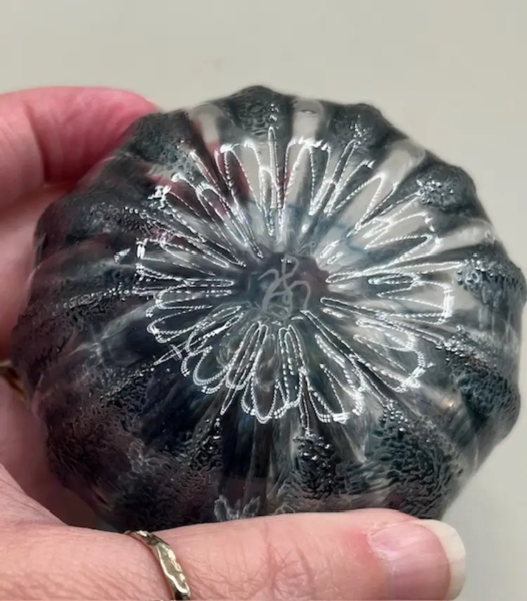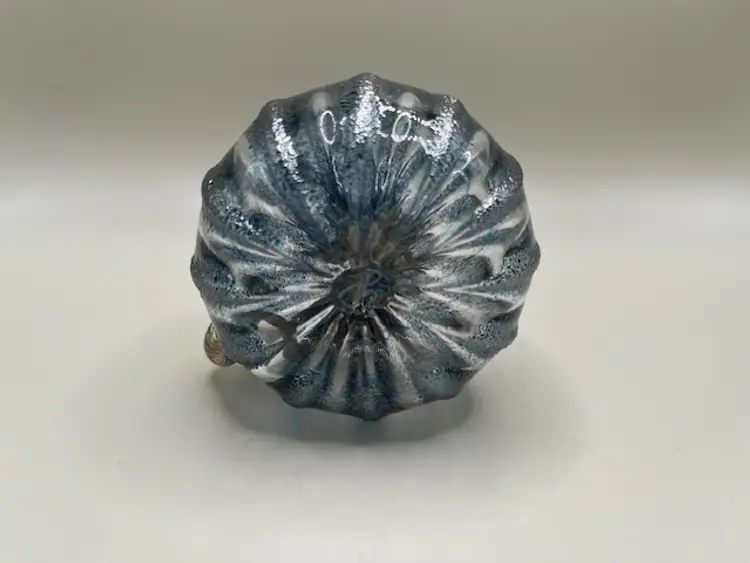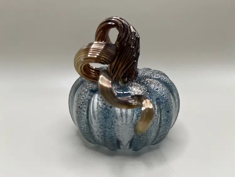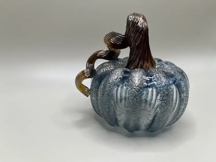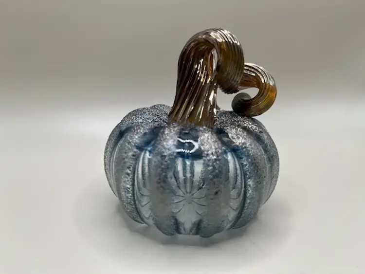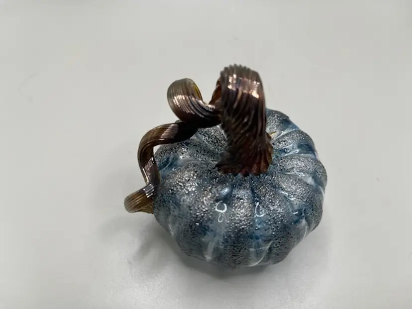 Fairytale inspired, this magical blue glass pumpkin makes a stunning gift for lovers of Fall decor, or even your perfect princess! Stunning metallic glass is sprinkled over the ridges to create a lovely sparkle. Fun and fanciful, it will glitter Happily Ever After!