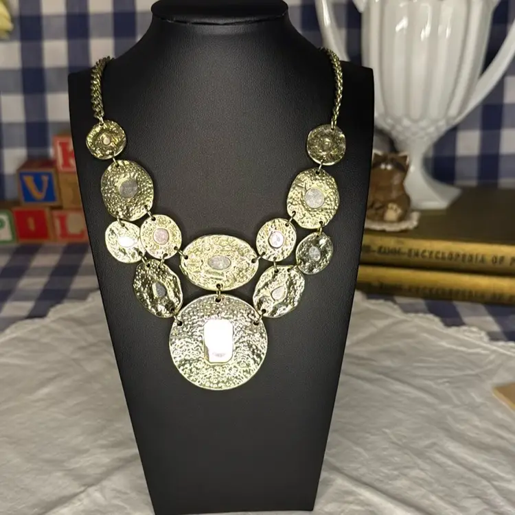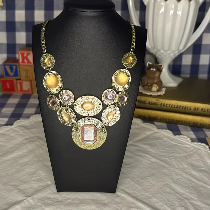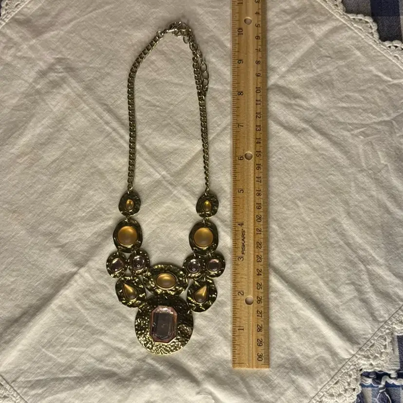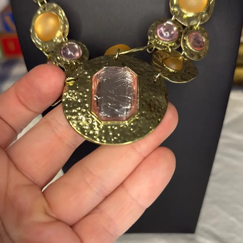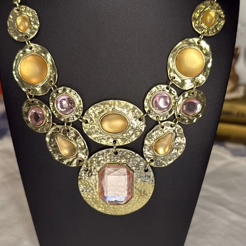 Signed Ruby Road Gold Tone Pink & Matte Gold Rhinestone Bib Necklace. Some scratches on the primary rhinestone - as shown in photos.