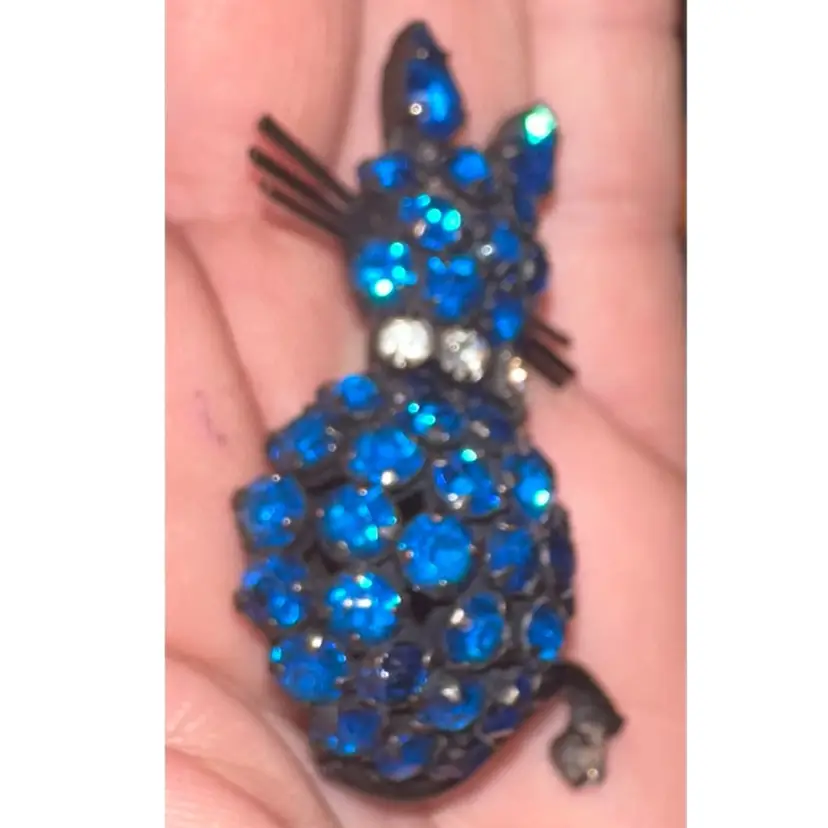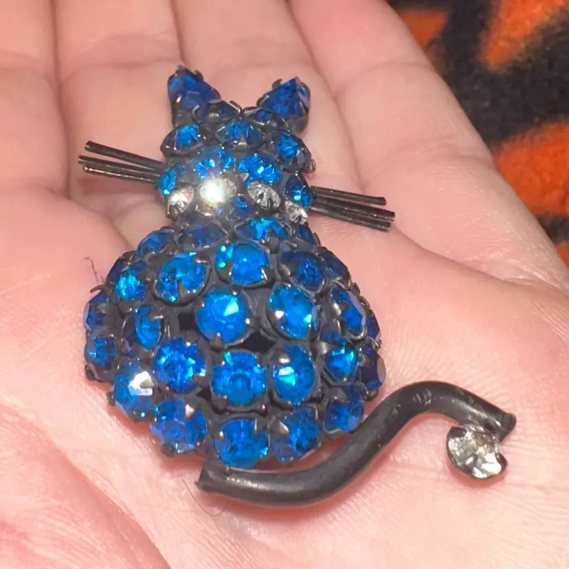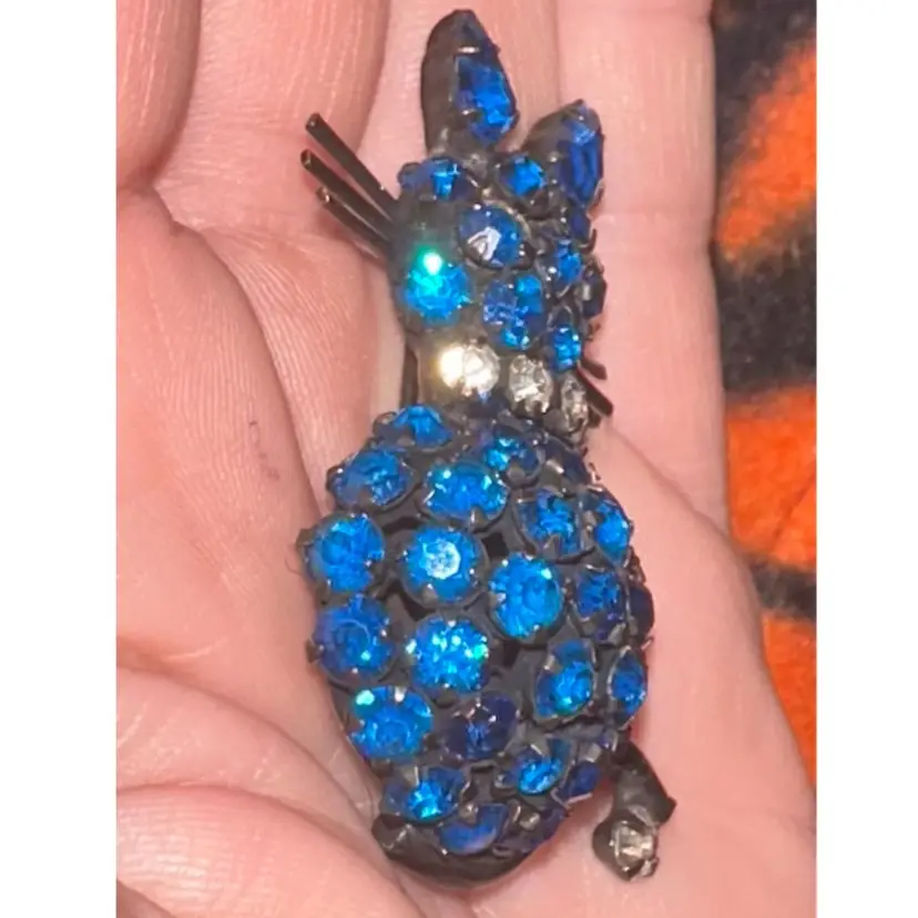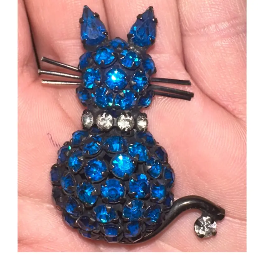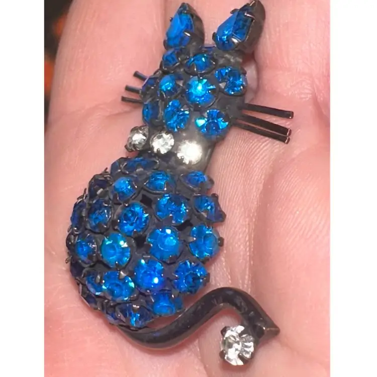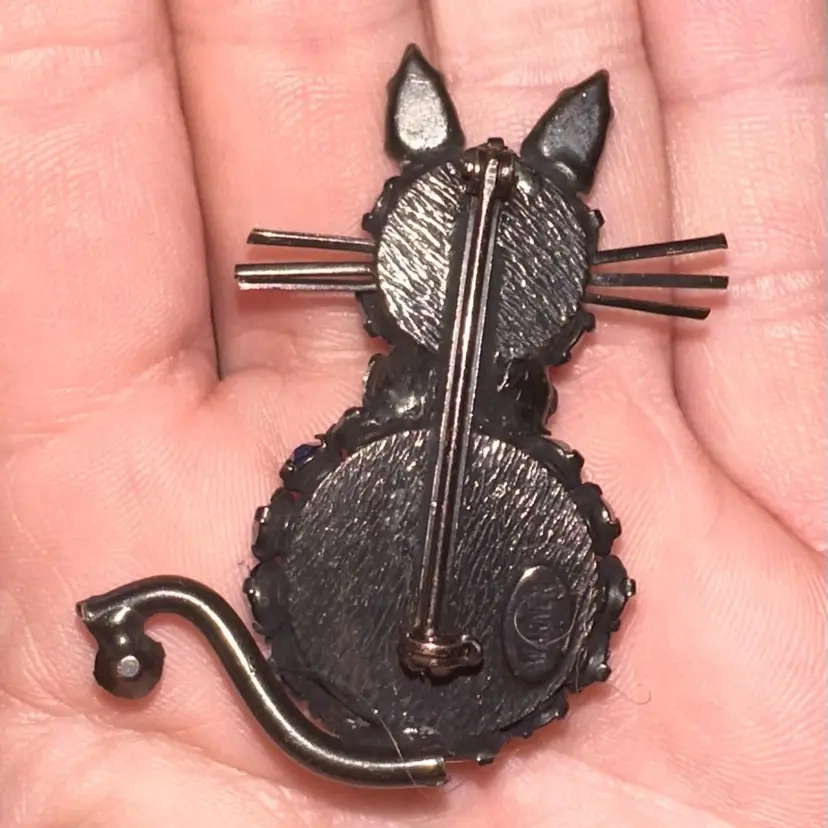 #01 - SIGNED WARNER Vintage Brooch Pin Kitty Cat Black Tone Blue Rhinestone Brooch
