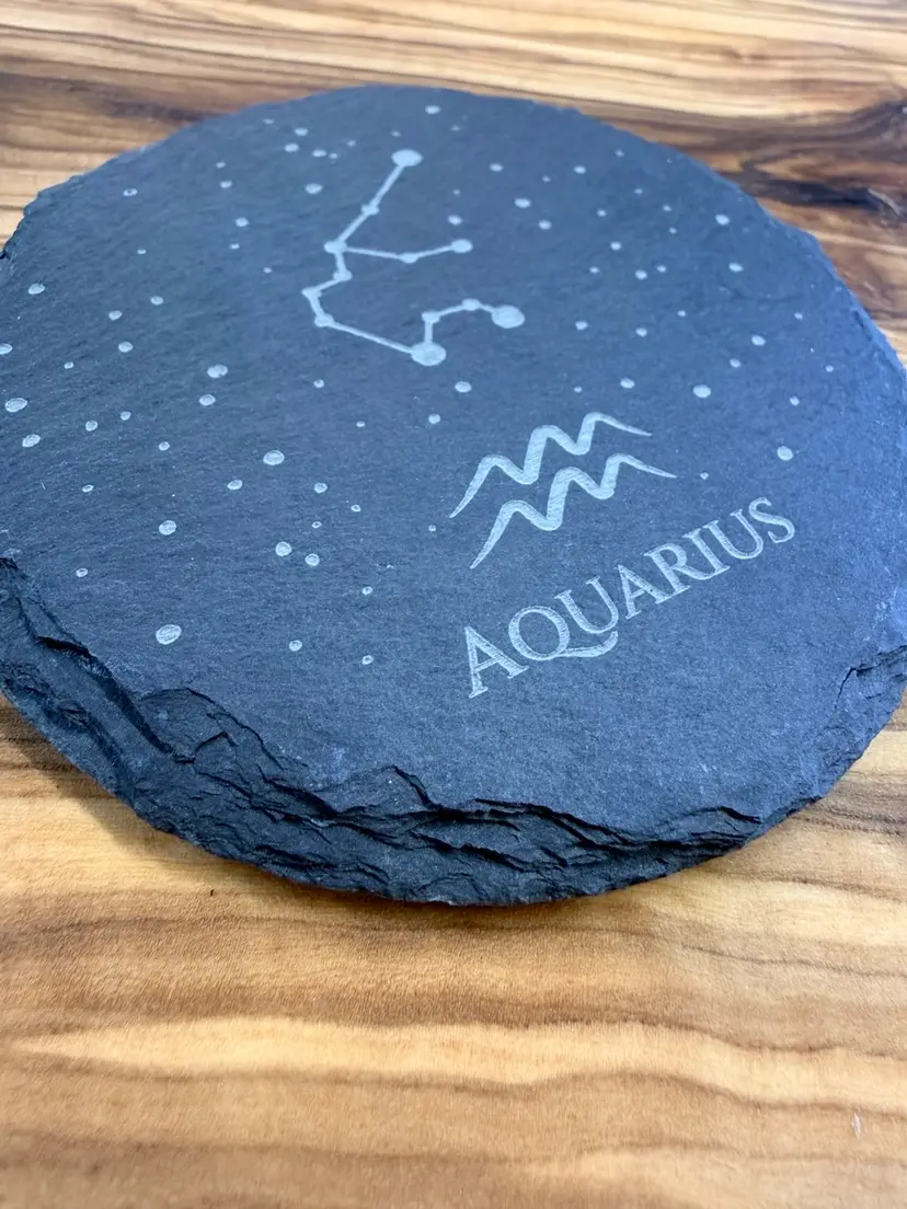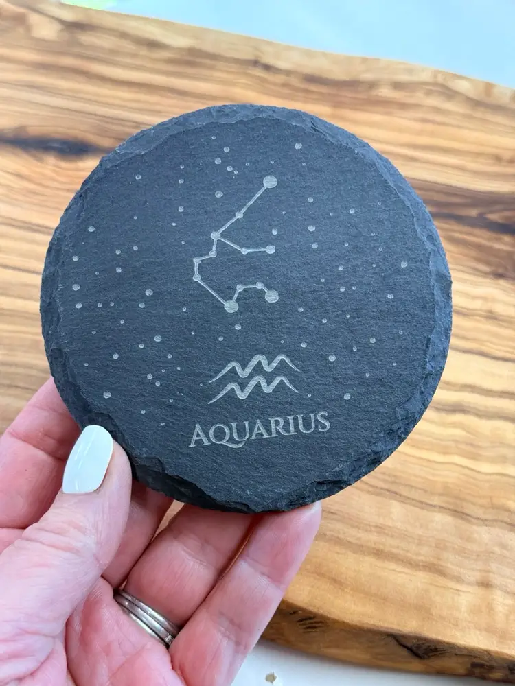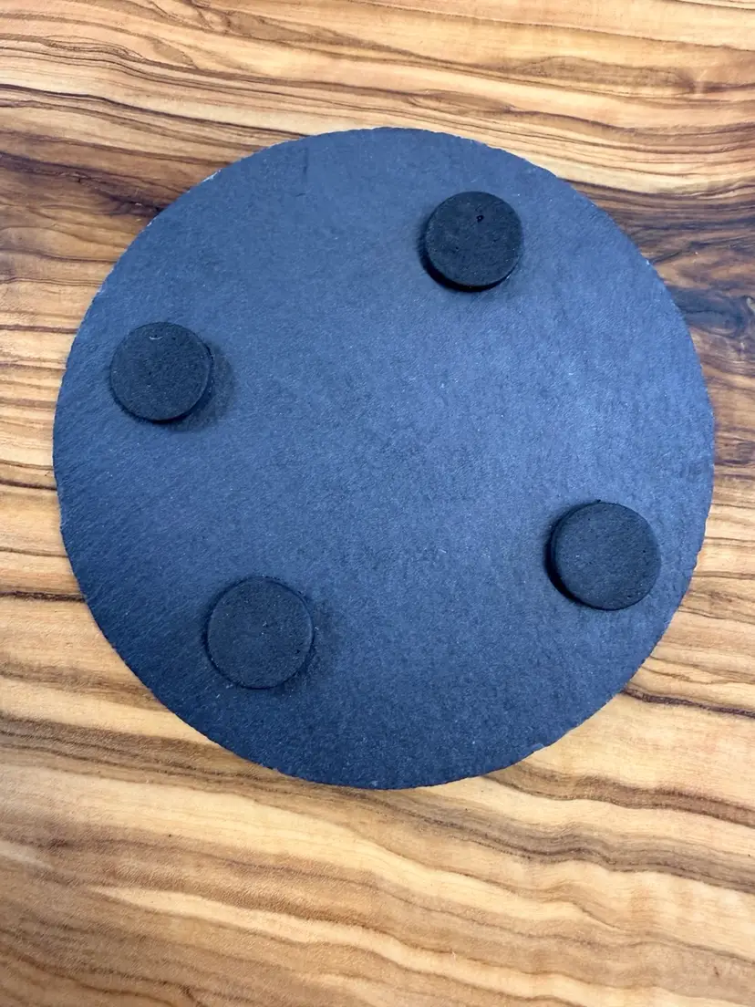These coasters measure 4” in diameter and 1/4” thick. Felt pads on the bottom protect surfaces and keep the coaster in place.