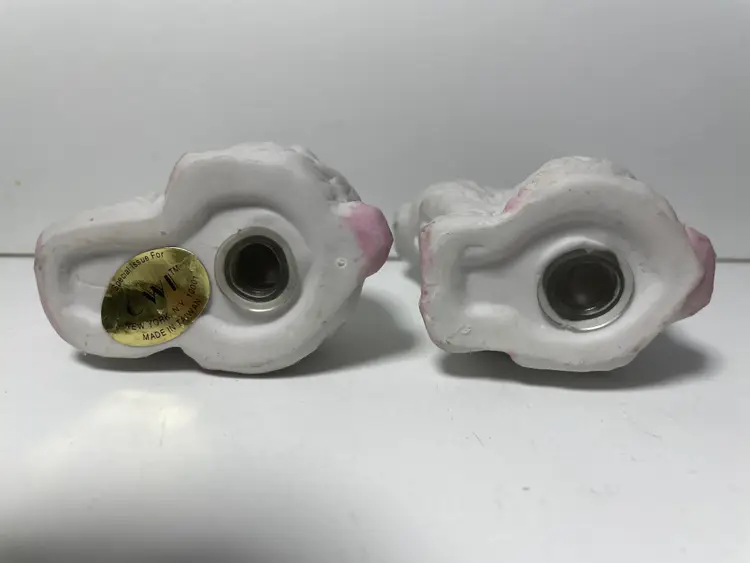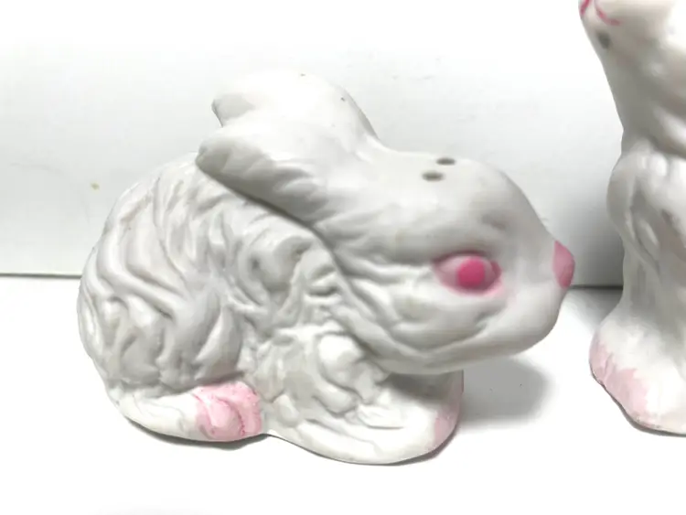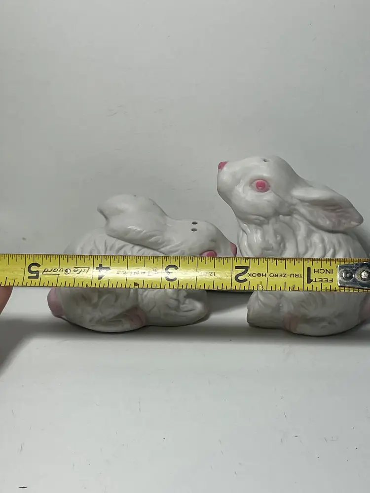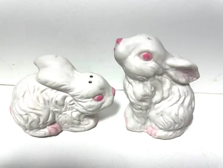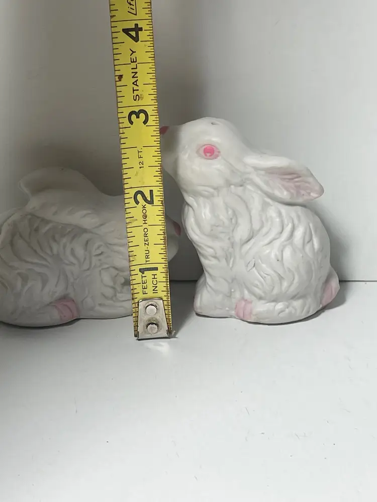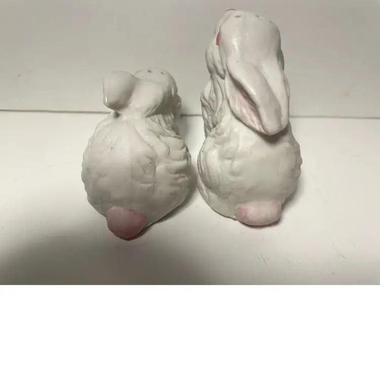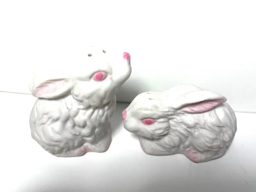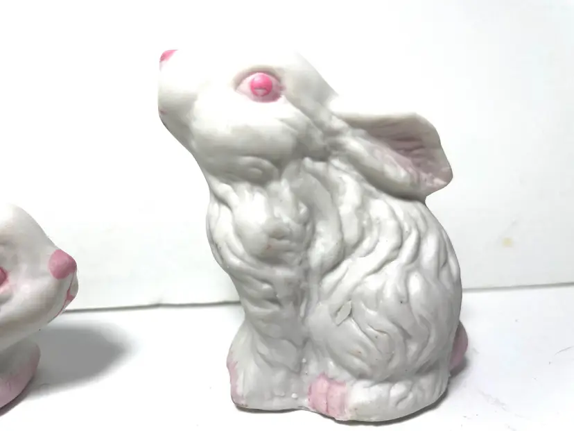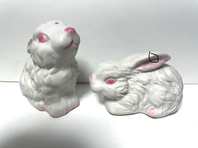 Adorable little spring bunnies to add just the right touch to your Easter dinner or brunch table setting. They would also look so sweet sitting on your kitchen windowsill, counter, stovetop, sideboard, or even a livingroom shelf. In has a small chip in his ear that I have circled in the 5th picture for easier viewing.