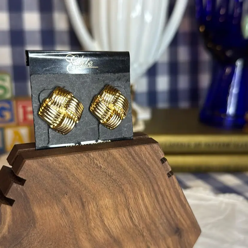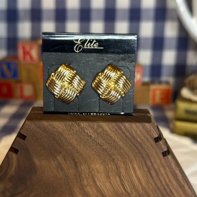 Square Quilted-Patterned Gold-Tone Pierced Earrings. In excellent vintage condition.