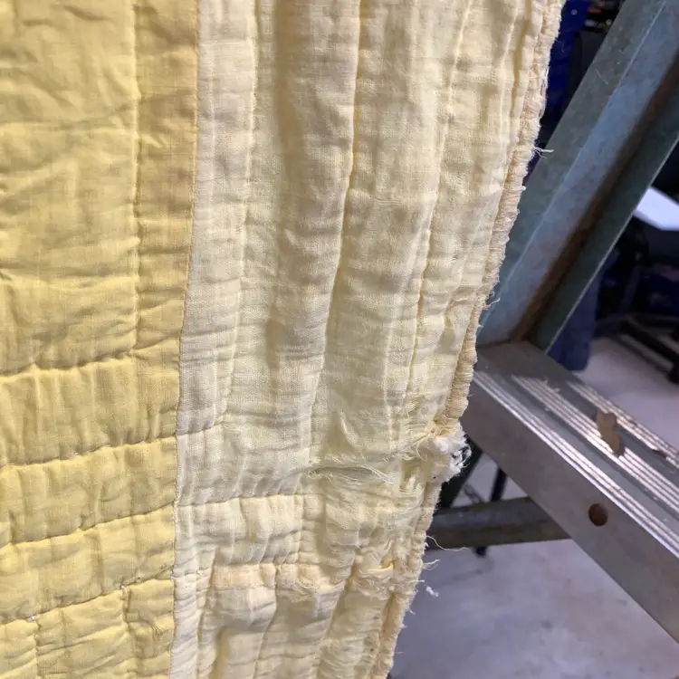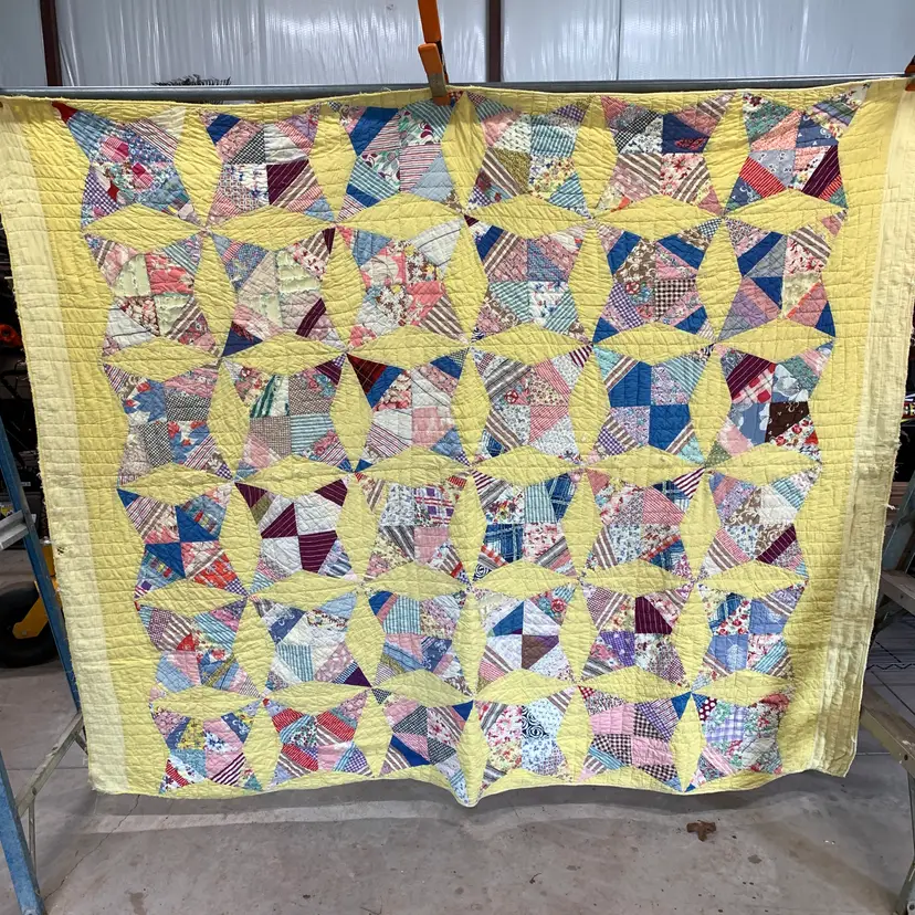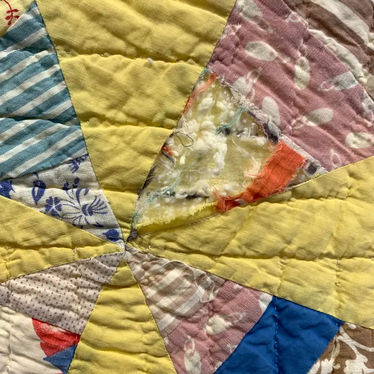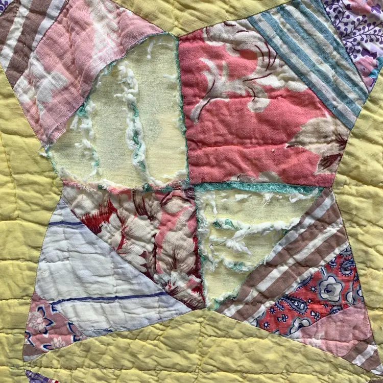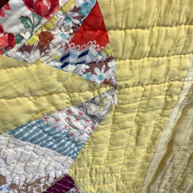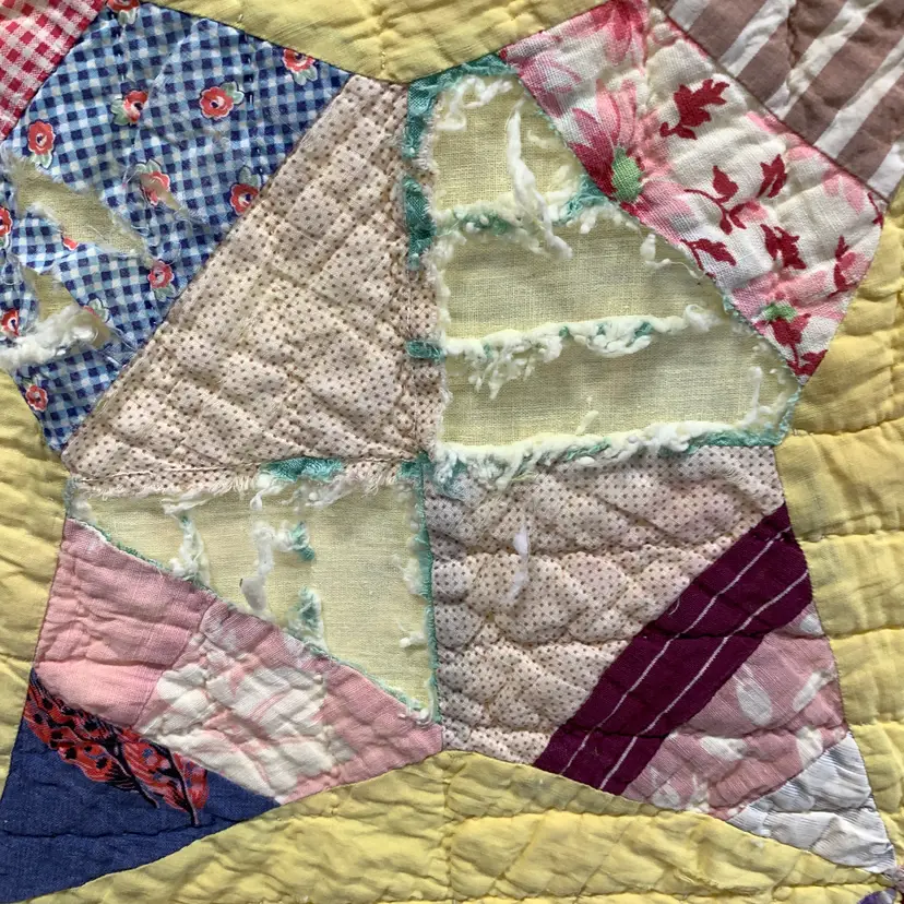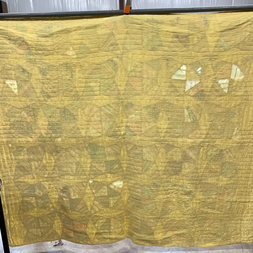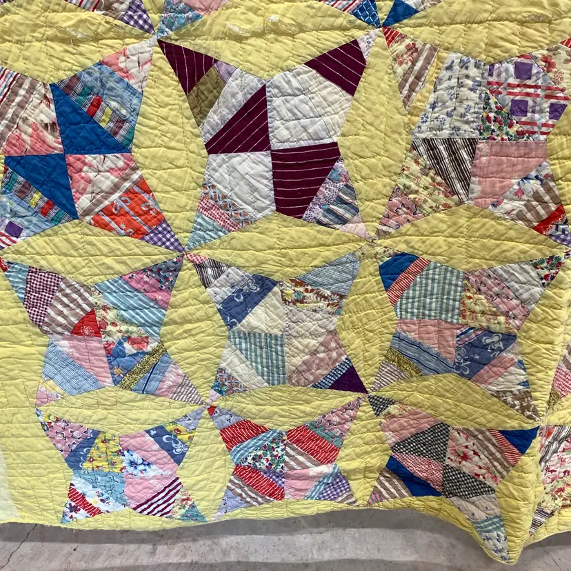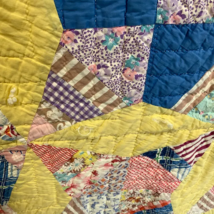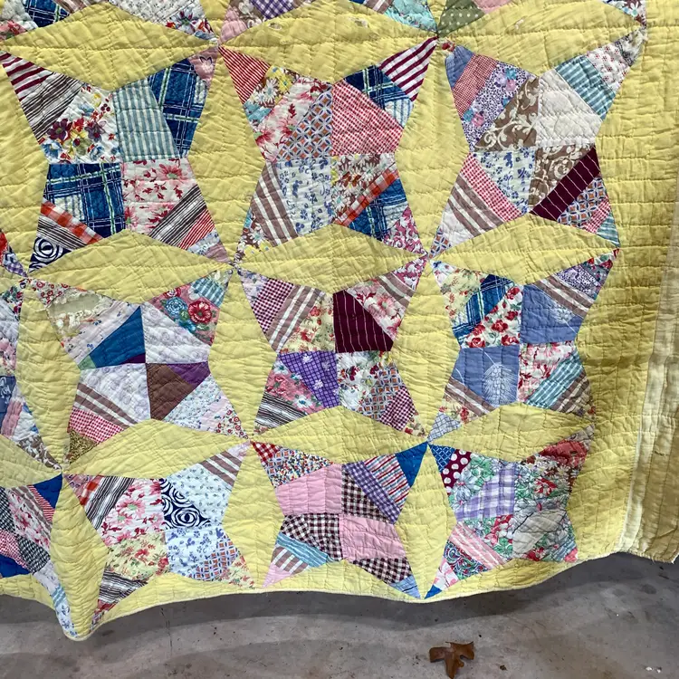 This is a very old quilt. It smelled bad when I purchased it. I worked very hard and was able to remove the smell and most of the stains. I am showing photos of all of the problem areas. Measures 65 inches by 80 inches. Weighs 3 pounds 4 ounces. If the actual postage ends up being less than what you paid, you will be refunded for anything over one dollar.