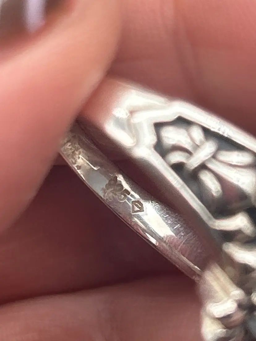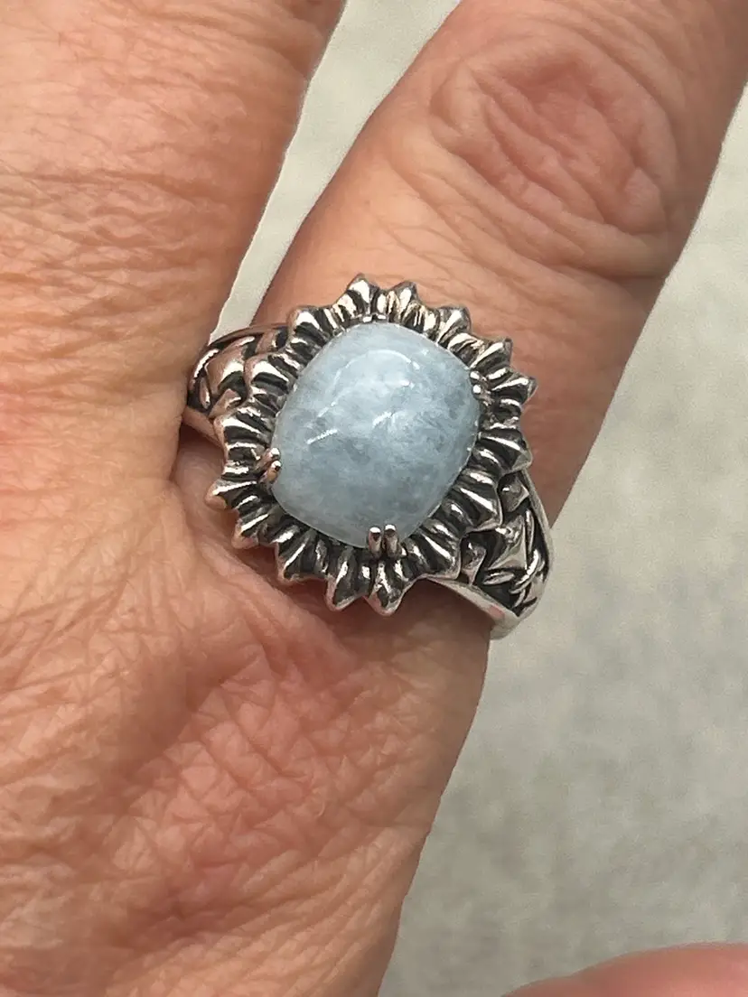 A gorgeous nature-inspired statement ring featuring a soft blue aquamarine cabochon set in solid sterling silver. The gem’s tranquil sky-blue hue is beautifully framed by a bold, hand-crafted floral and leaf motif that wraps elegantly around the band. Substantial in size and presence, this piece blends artisan craftsmanship with timeless bohemian charm — perfect for collectors who love unique gemstone designs and organic silverwork.