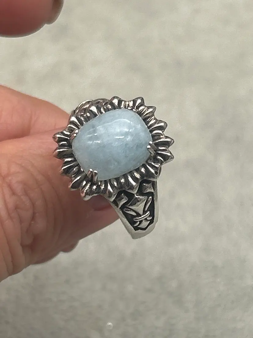 Notable Details • Metal: Sterling Silver, marked 925 • Gemstone: Aquamarine cabochon (tested) • Stone Cut: Smooth domed oval cabochon • Setting: Secure prong setting with raised petal frame • Design Details: Leaf and floral pattern shoulders • Ring Size: 11 • Band Width: Approx. 4 mm at back, 15 mm face height • Style: Artisan / Boho / Statement / Nature-inspired • Condition: Excellent — clean silver, smooth polish, natural stone inclusions visible