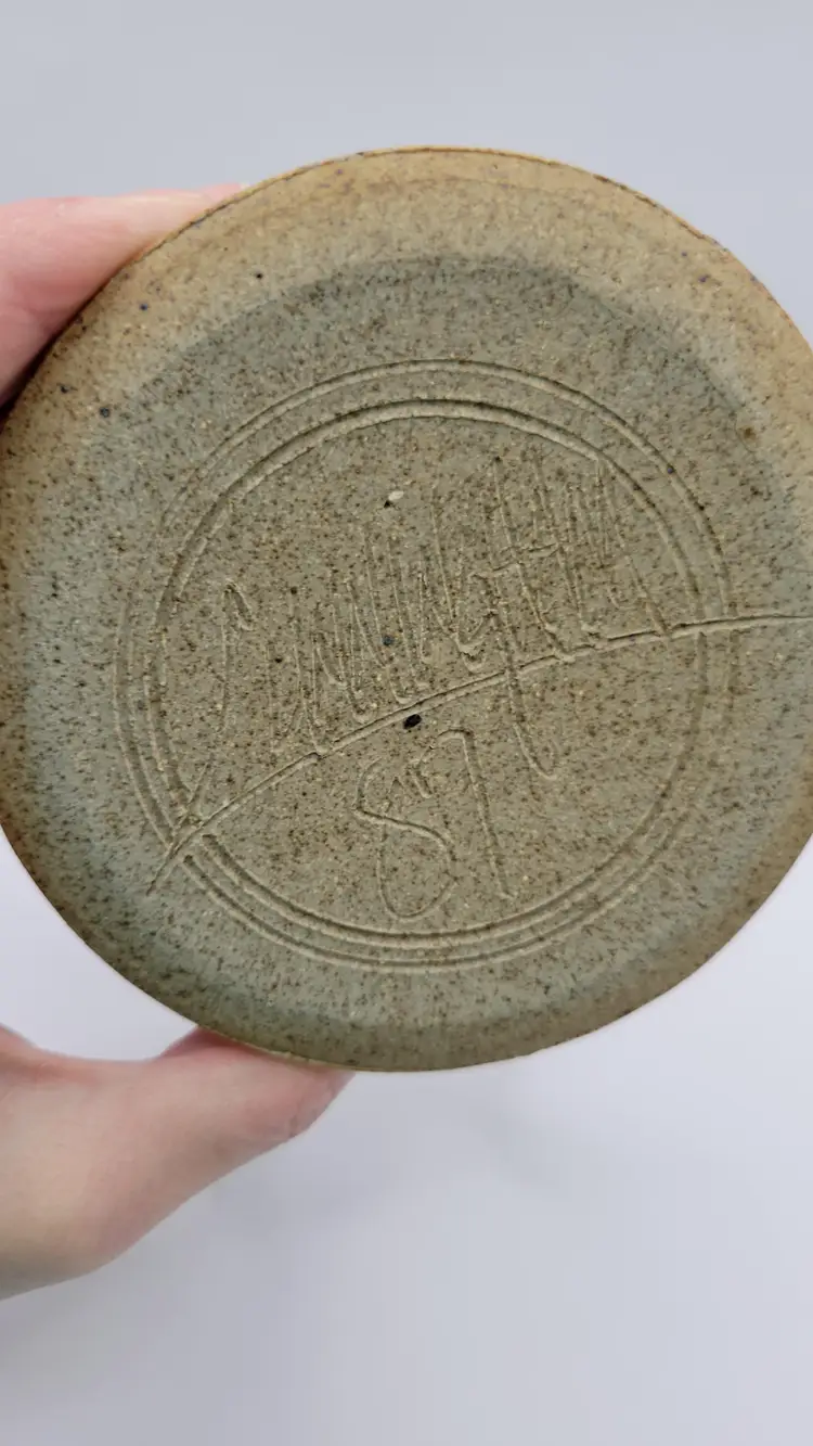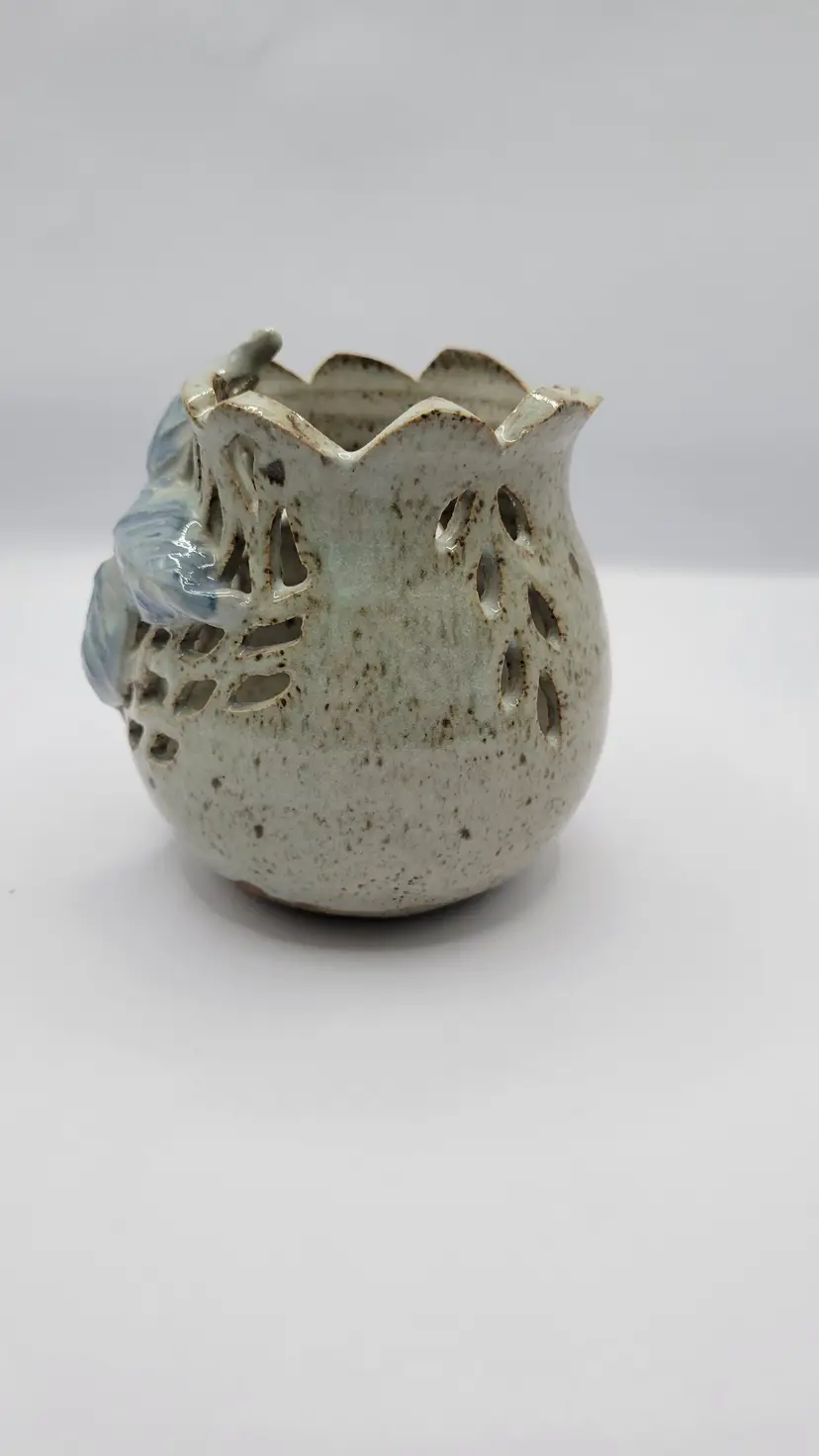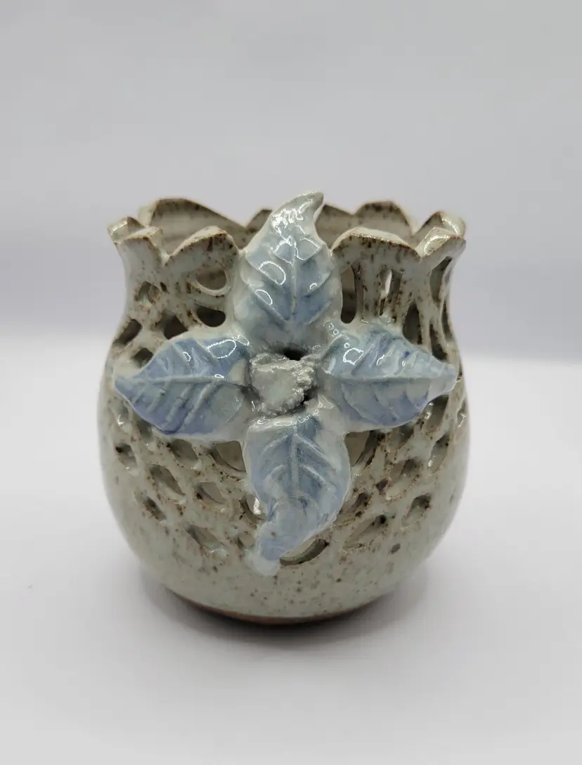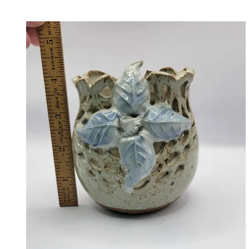 Reticulated stoneware studio art pottery votive candle holder with blue poinsettia. 4" tall x 4.25" at its widest. Excellent condition, no chips or cracks. A piece of punched out clay looks to have been glazed and fired still on the inside. Signed by artist but hard to make out the name. Thank you for looking and have a great day!