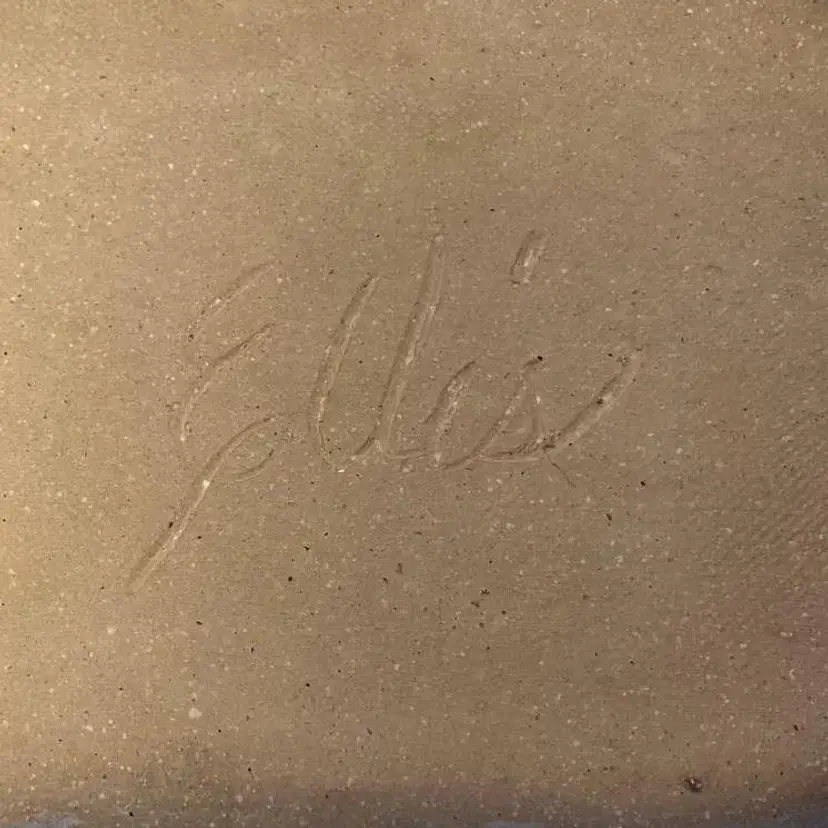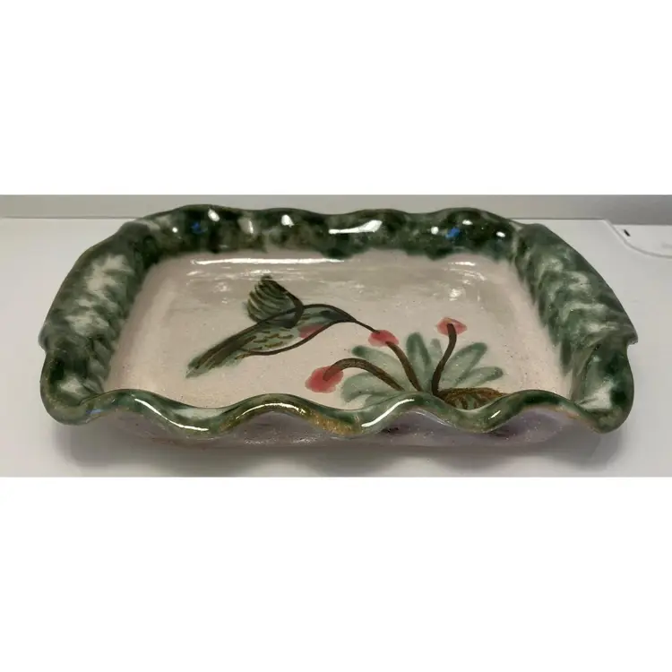 Handmade Dish with Ruffled edges made by Ellis - hummingbird and flowers. 7 3/4" long, 5 1/2" wide and 1" tall. No chips or cracks.