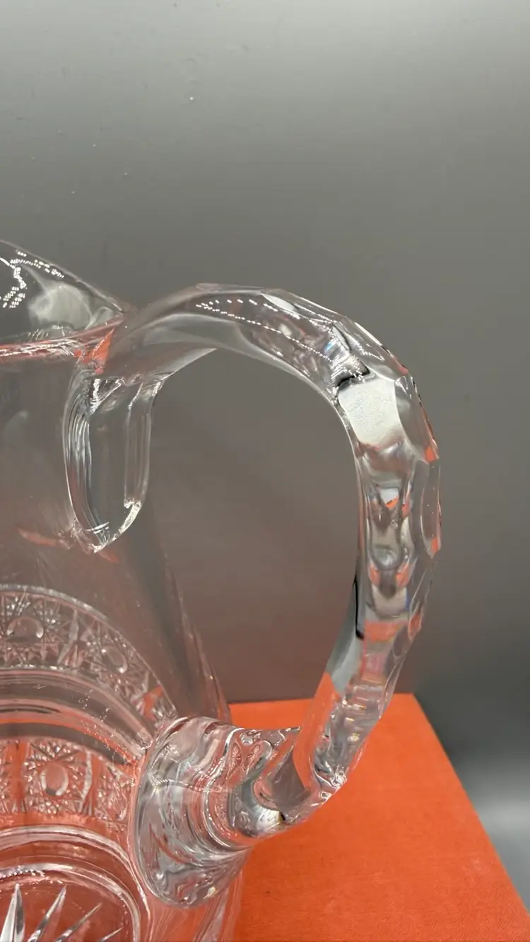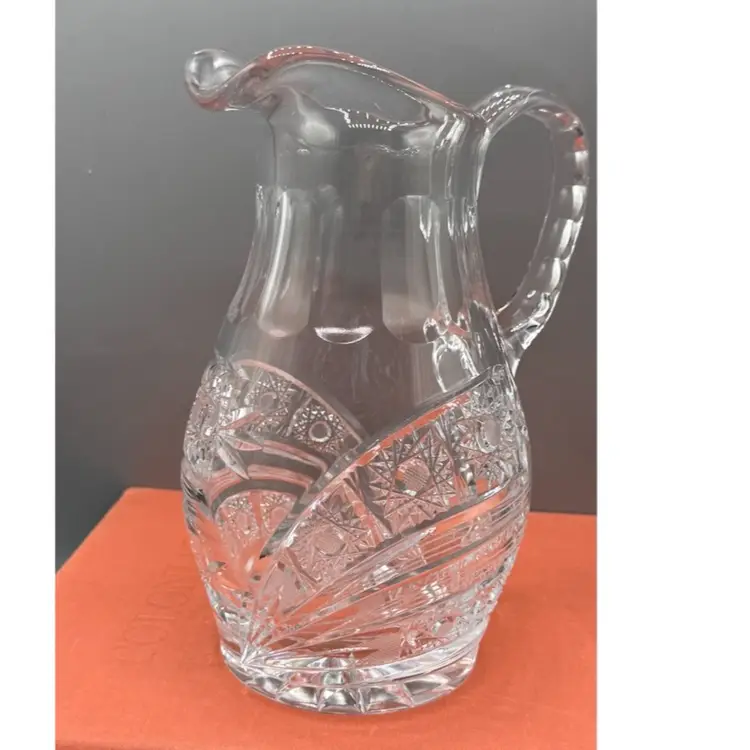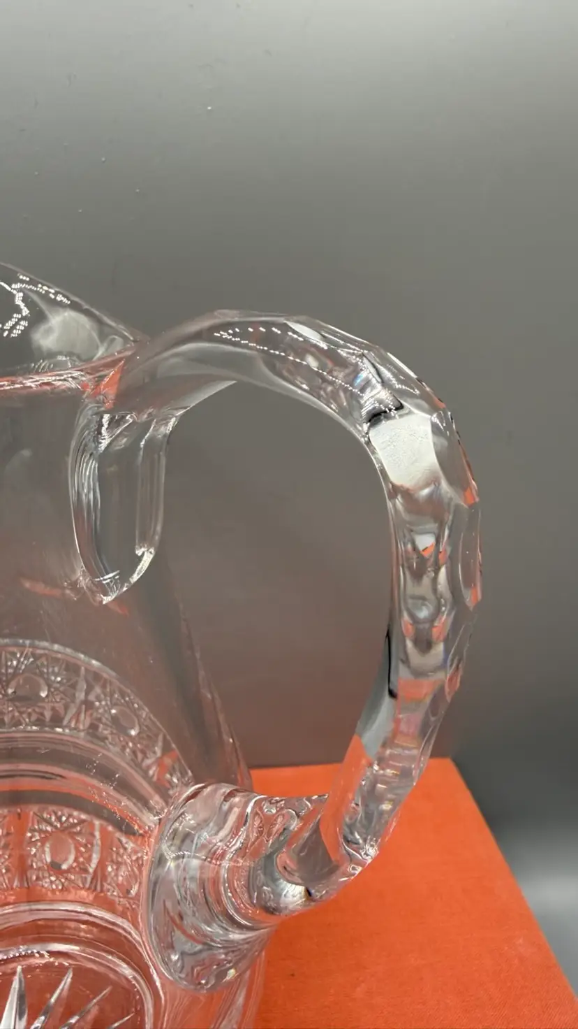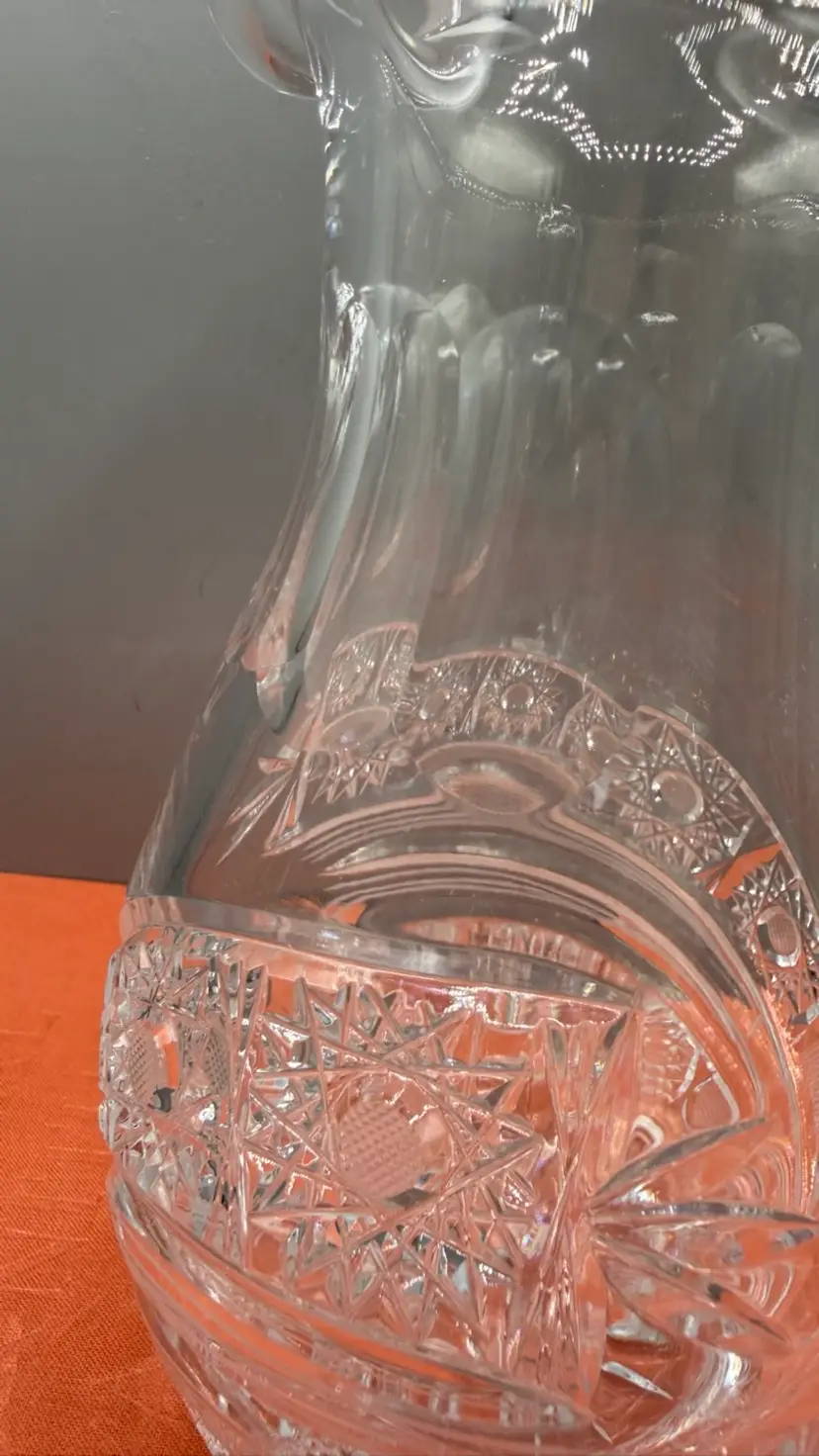 Features deeply hand-cut Hobstars surrounded by intricate geometric miter cuts and diamond-point fields. The top of the pitcher is finished with a rare, elegant smooth rim, leading into a body rich with sharp, crisp texture that confirms its hand-cut (not molded) origin. The underside is finished with a traditional rayed starburst (star bottom), a hallmark of fine antique crystal that adds to its visual depth.Includes a thick, applied-glass handle designed to support the pitcher’s significant weight. excellent conditions, no chips, cracks or repairs.