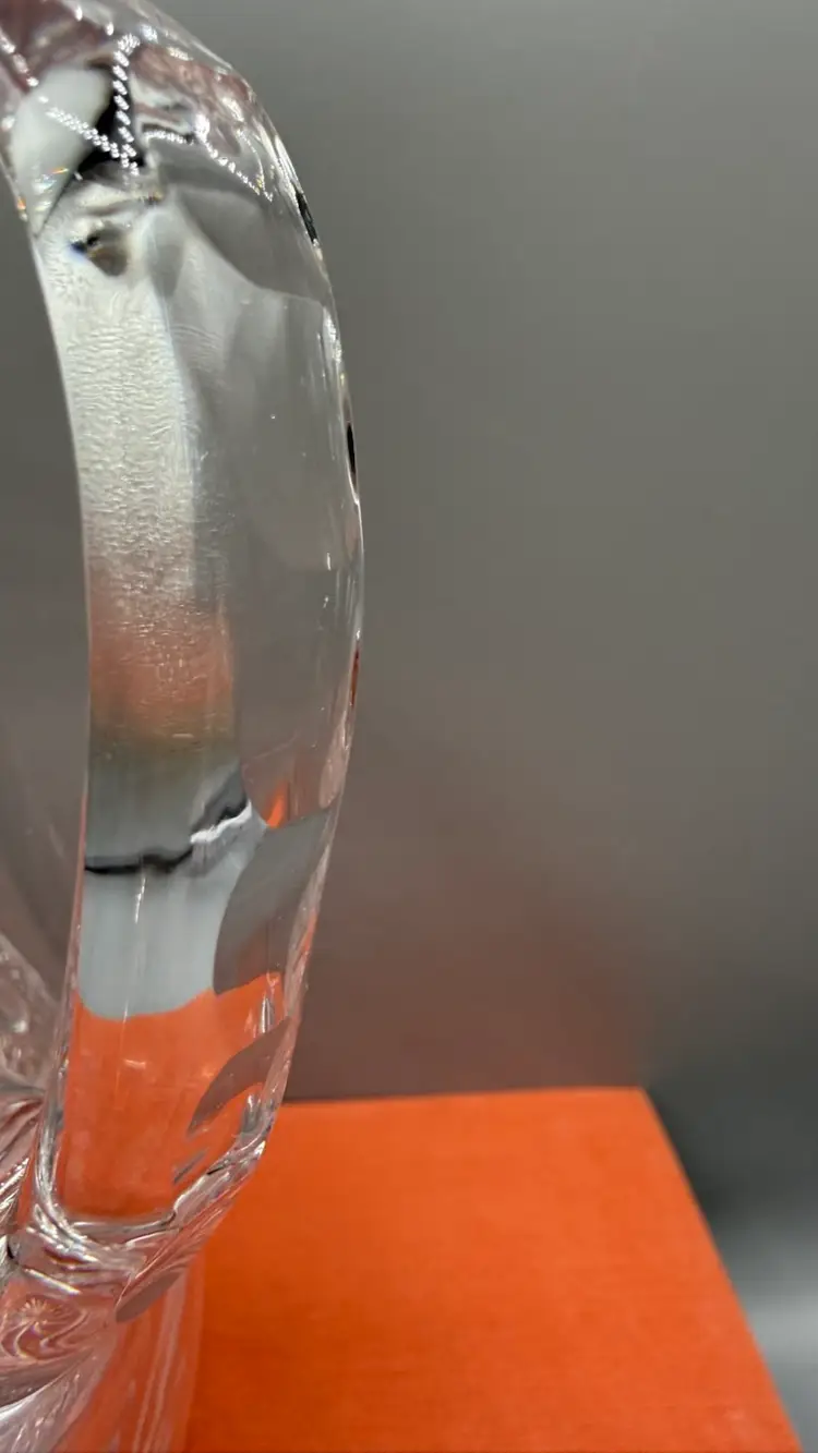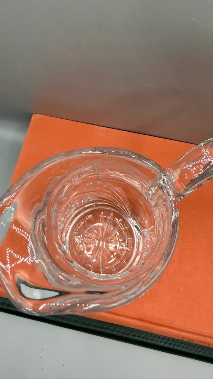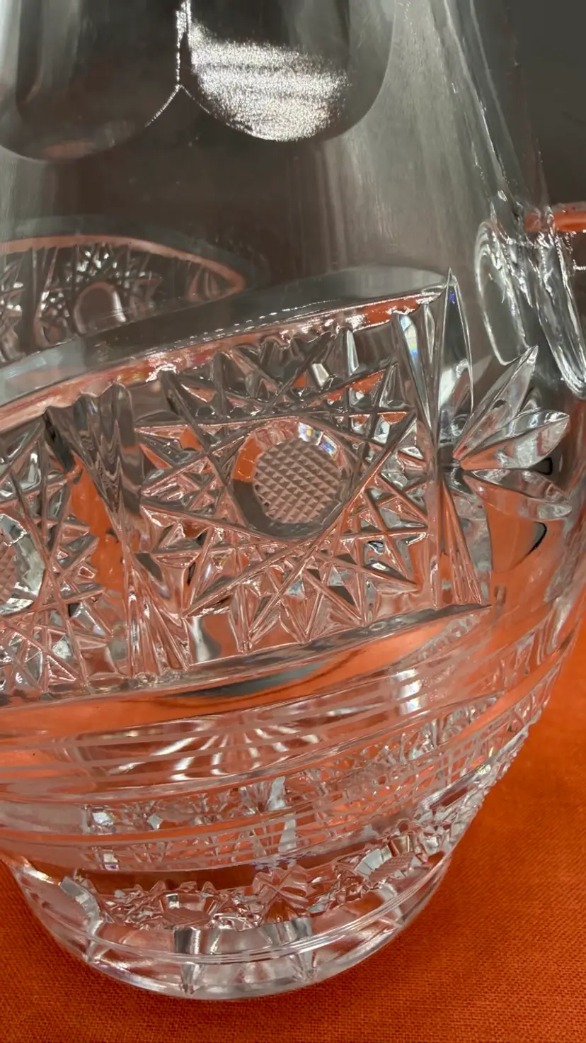 Features deeply hand-cut Hobstars surrounded by intricate geometric miter cuts and diamond-point fields. The top of the pitcher is finished with a rare, elegant smooth rim, leading into a body rich with sharp, crisp texture that confirms its hand-cut (not molded) origin. The underside is finished with a traditional rayed starburst (star bottom), a hallmark of fine antique crystal that adds to its visual depth.Includes a thick, applied-glass handle designed to support the pitcher’s significant weight. excellent conditions, no chips, cracks or repairs.