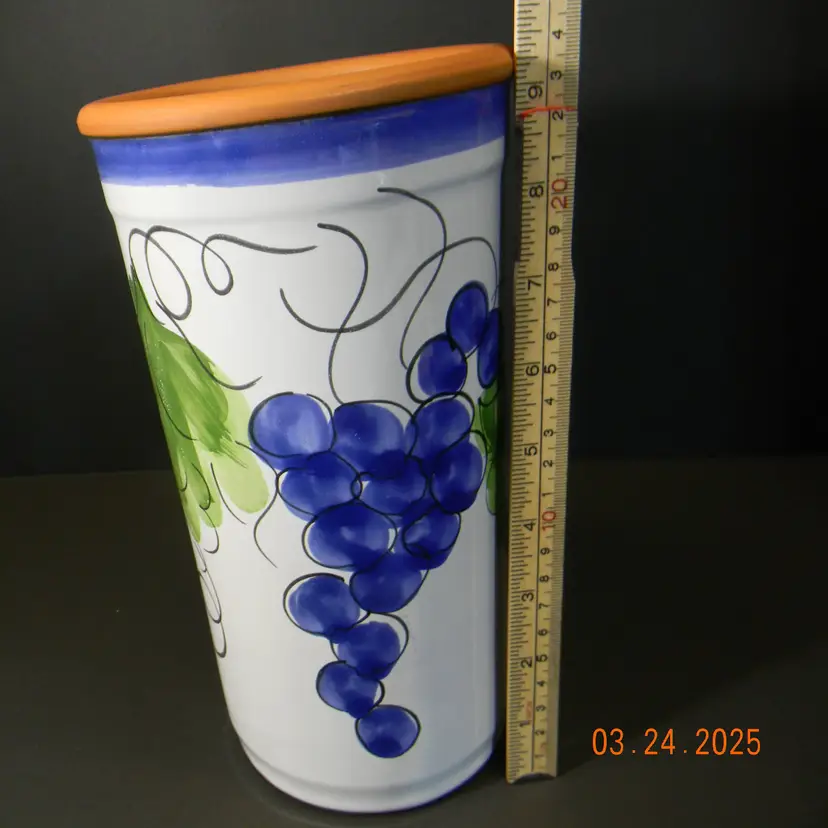 Multi-Colored Grape Vine Vase. Stamped Made in Portugal. Red Ware Pottery. Used Condition Measurements approximately 9 1/4 Inches tall without base and 4 3/4 inches wide. Beautiful Heavy Piece. The pictures don't show how beautiful this vase really is. No chips or cracks see photos The difference in computer monitors actual colors may vary slightly from those shown