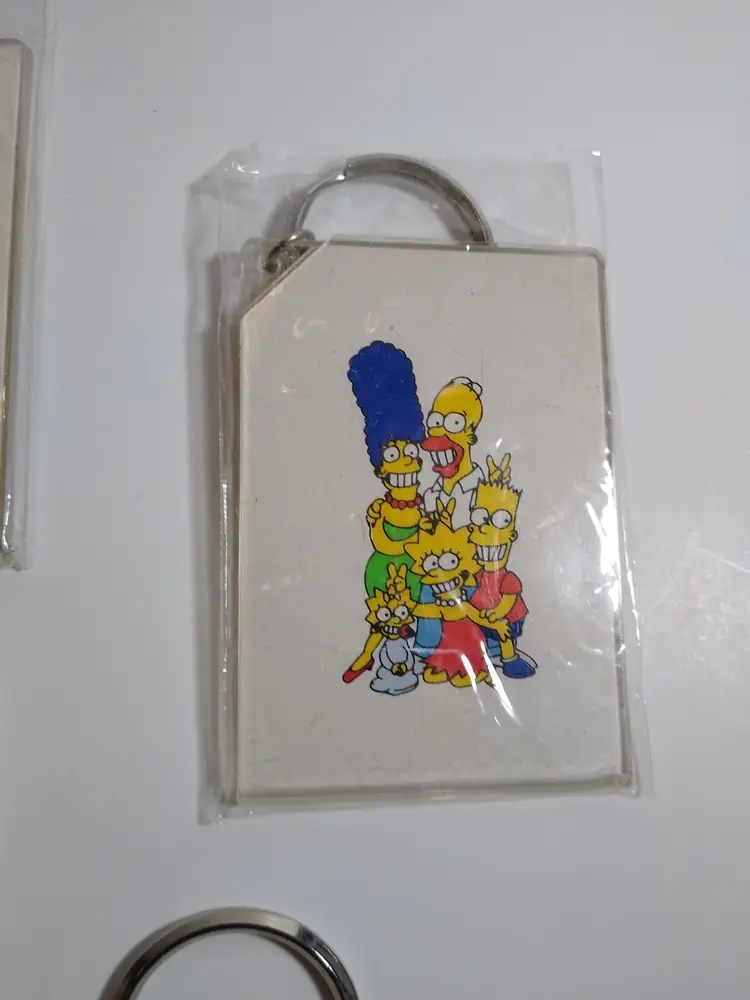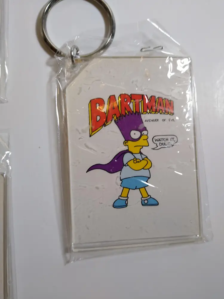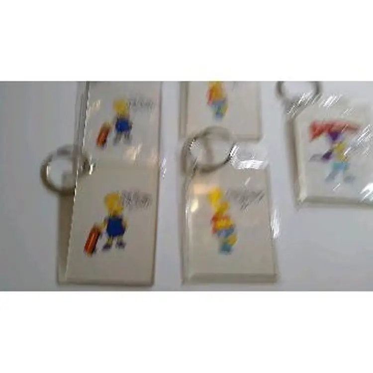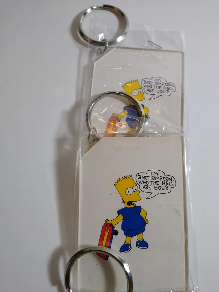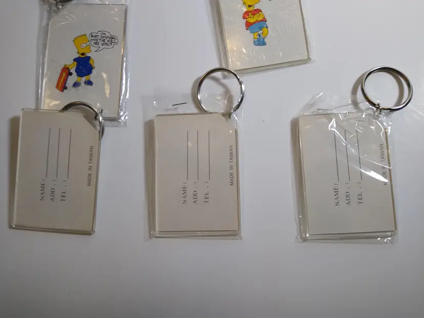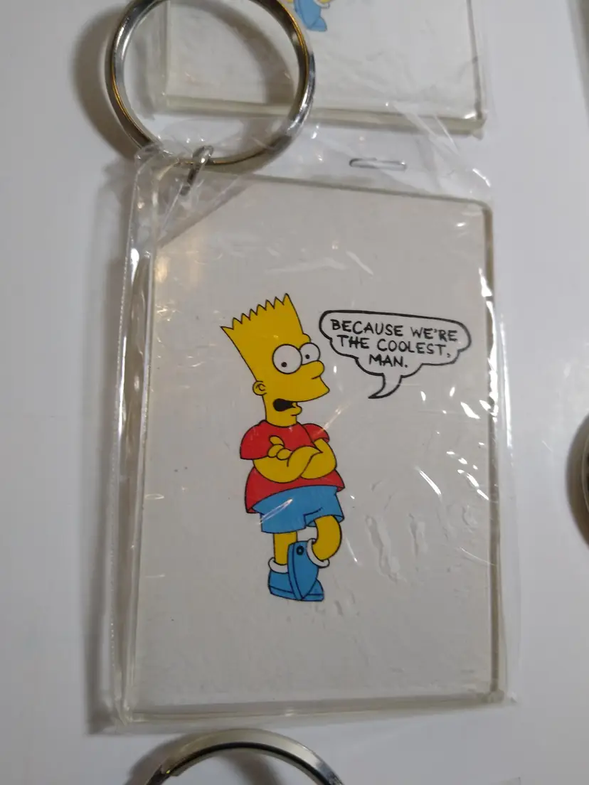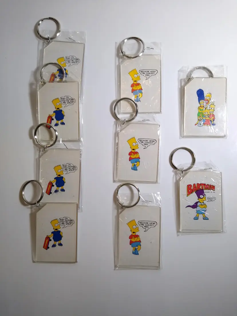 See video. Nice lot of (9) vintage The Simpsons key chains. They are plastic acrylic on the outsides with paper inserts. 4 different styles with some duplicates. They have metal keyrings attached. All but one are in the plastic bags. Size is 2.75" x 2" not including the metal ring.