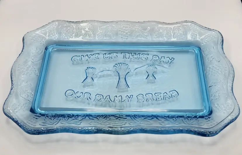 Vintage Tiara Indiana Glass bread tray plate in ice blue with the "Give Us This Day Our Daily Bread" design. Has a very tiny flea bite on the bottom - not visible when on display. 11"x7"