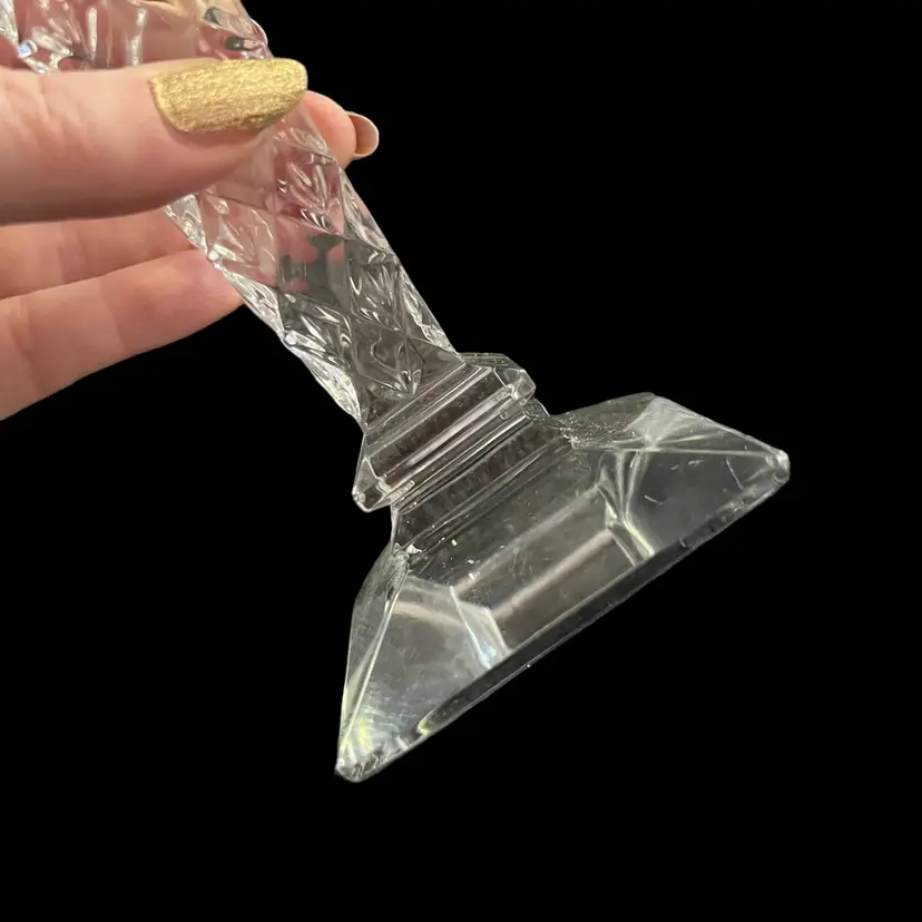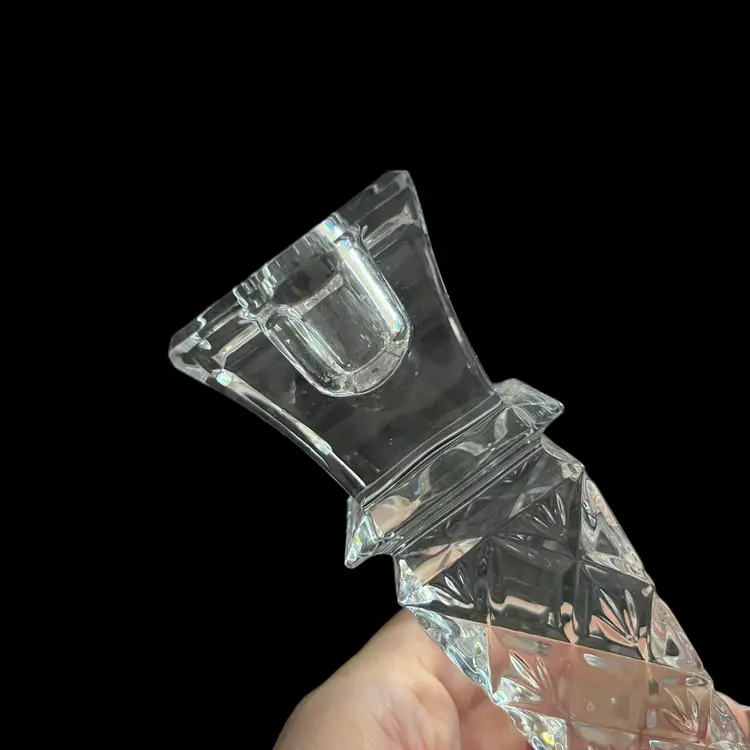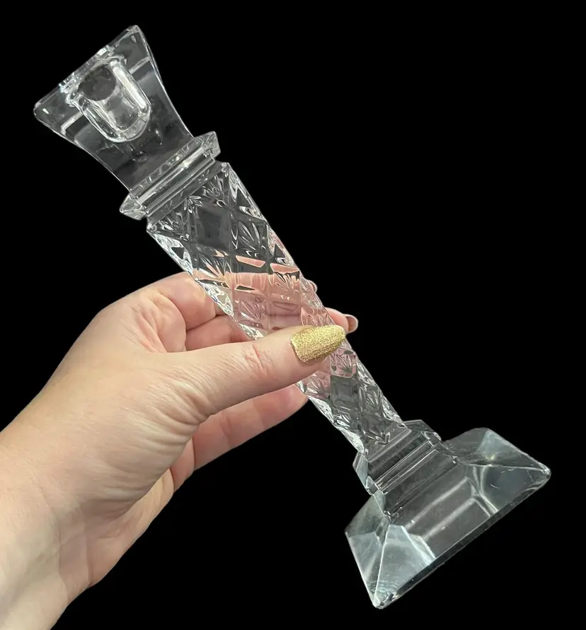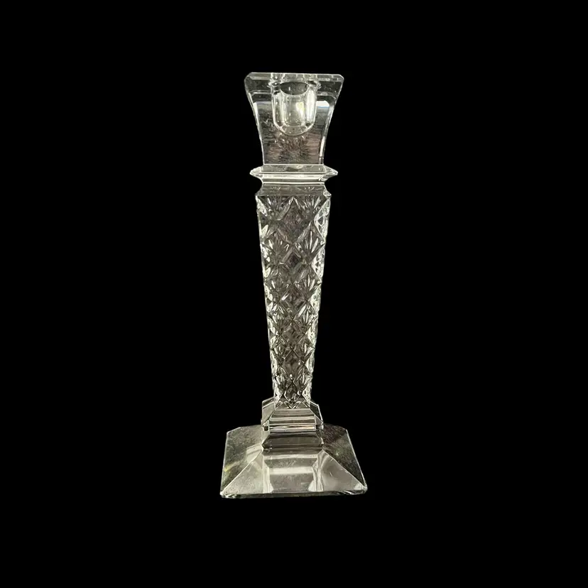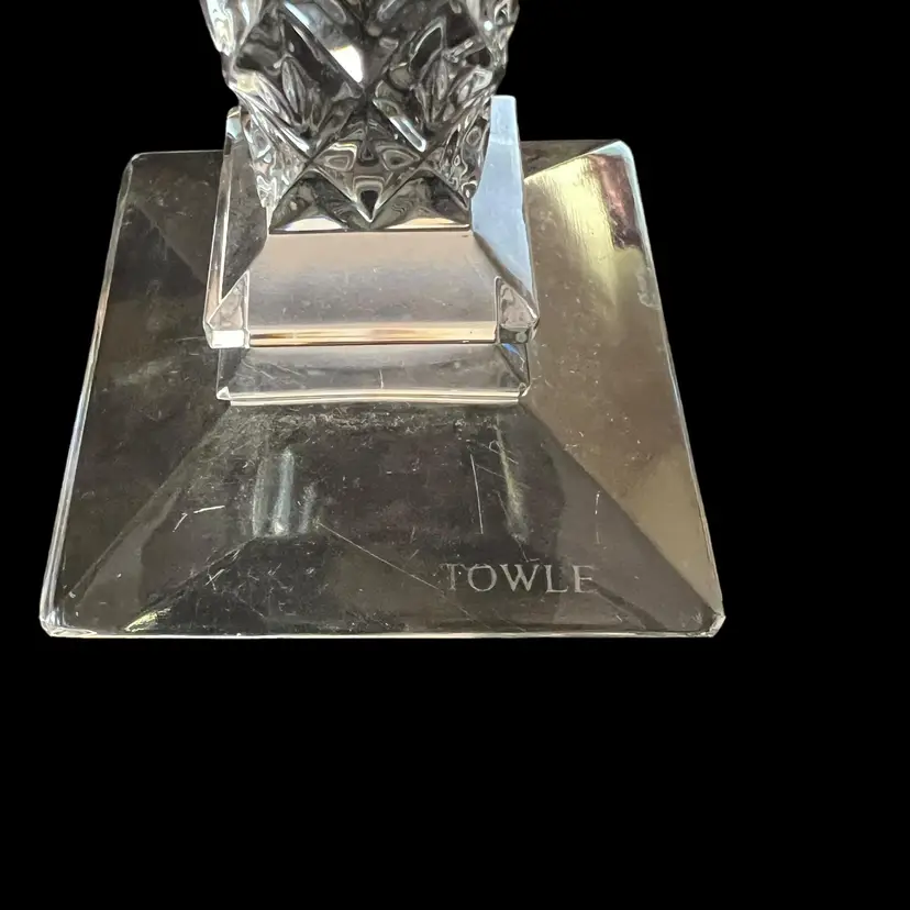 Here we have a clear, 24% lead crystal glass candlestick holder made by Towle. Wonderful quality. Nice and heavy. The glass has an elegant, criss cross, diamond pattern. The base is signed "Towle". It was made in the Czech Republic.