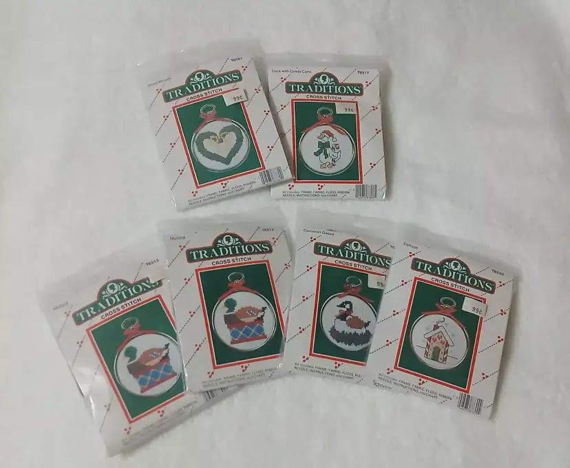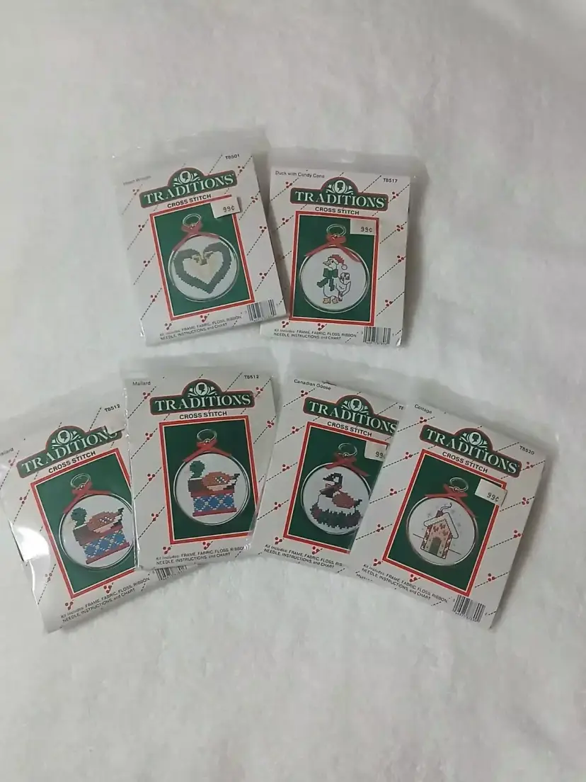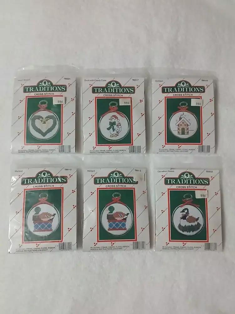 Add some vintage charm to your holiday decor with this lot of 6 Christmas ornament kits from Traditions. Each kit includes a frame and everything you need to create beautiful cross stitch ornaments, including ribbon, needle, fabric/cloth, and thread/floss. The kits feature a variety of holiday and Christmas themes, making them perfect for adding a festive touch to your home.