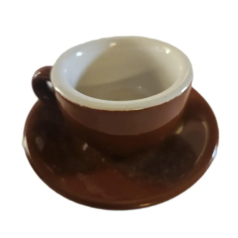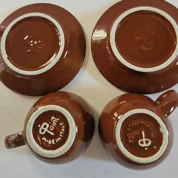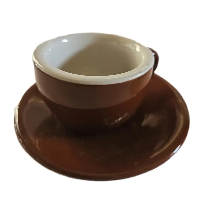 For sale are two vintage Espresso cups and saucers made in Italy by Nuevo Point Ceramics. All are in very good condition, no cracks or chips, Cups are approximately 2"x2"x3" and saucers approximately 3.5" diameter.