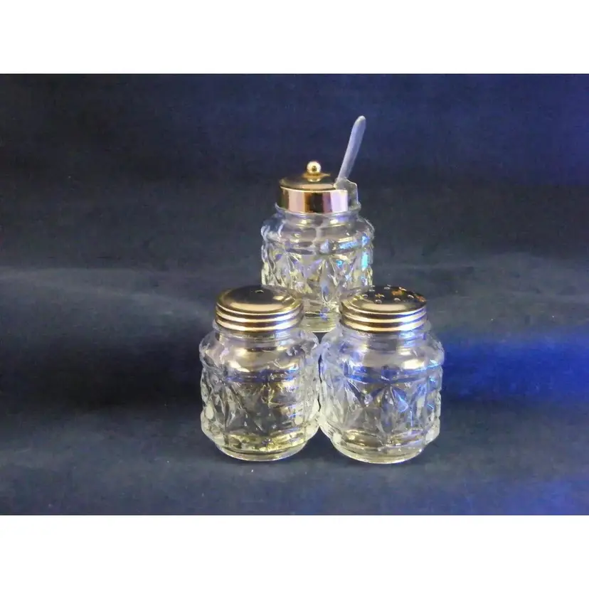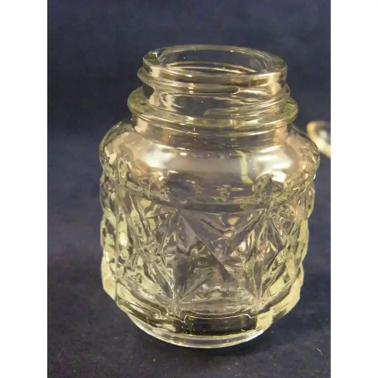 8 Pieces Pressed Star Pattern All Occasions Small Clear Mustard Pot, 3 lids, Cart, Lucite Original spoon Glass and Metal Anchor Hocking Salt & Pepper Shakers 3 containers, spoon and cart and lids M331, Wheelbarrow Mid-Century Modern 1950-1959 Taiwan Container, Cart, Spoon, Lids