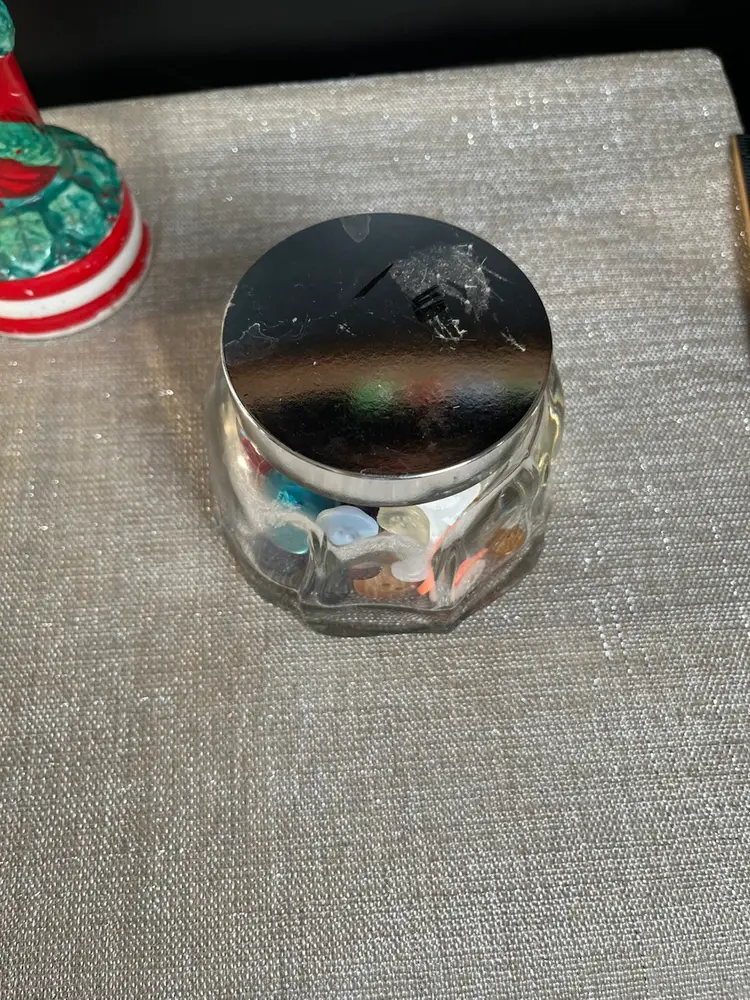 Just a few ounces short of one pound. They are contained in a heavier jar w/ lid. The jar is kinda cool, too. The jar measures approx 2.5"H, 3.75" diameter at widest point. 15 Oz. Lid is silver toned. Has some silver missing.