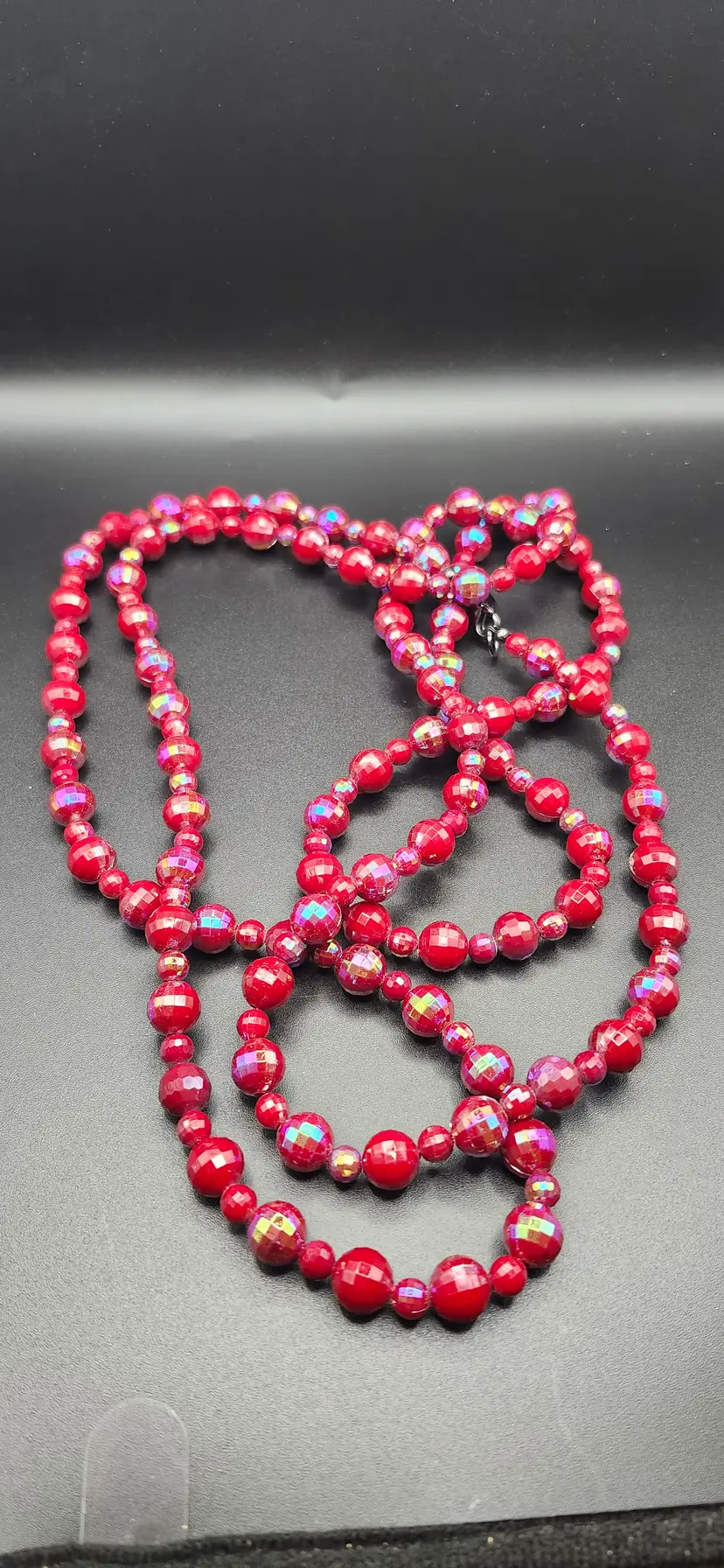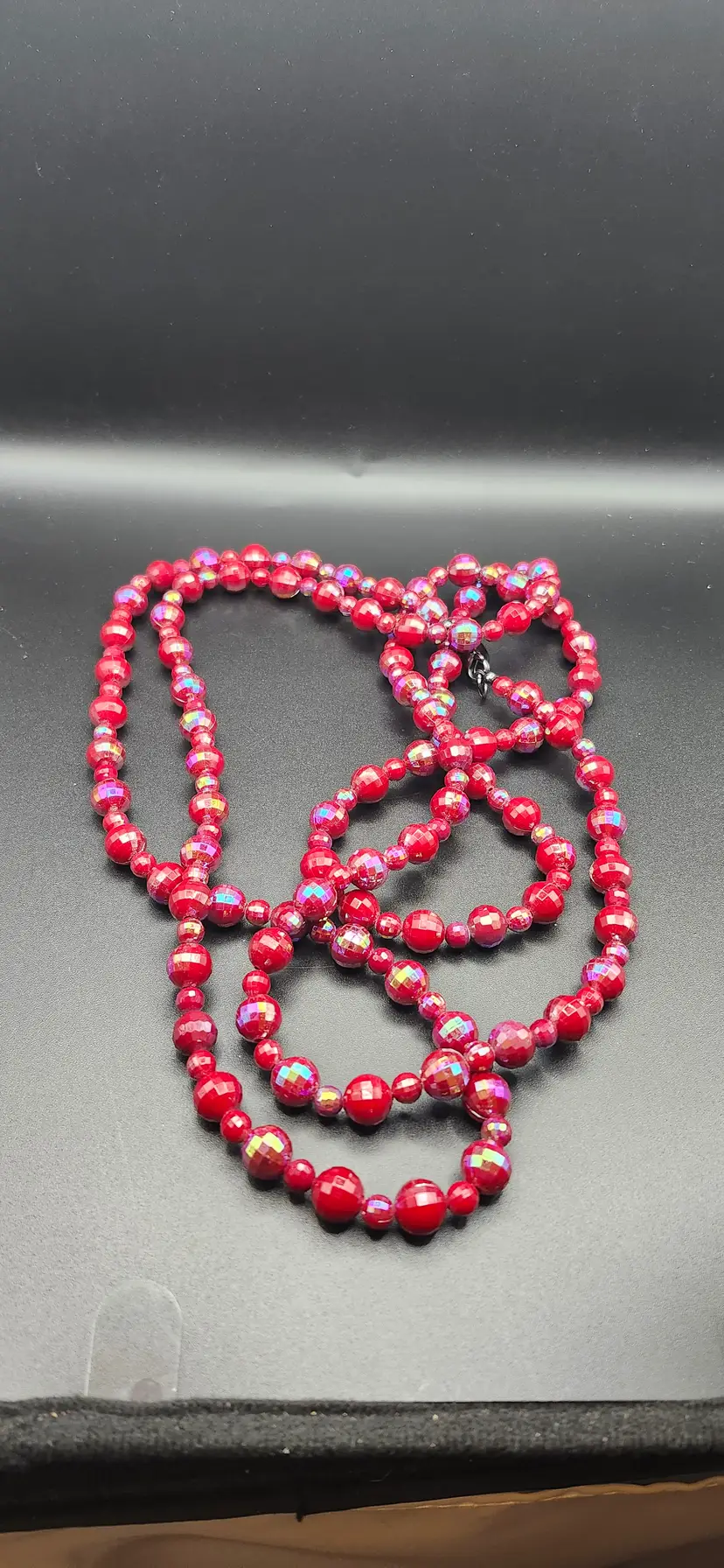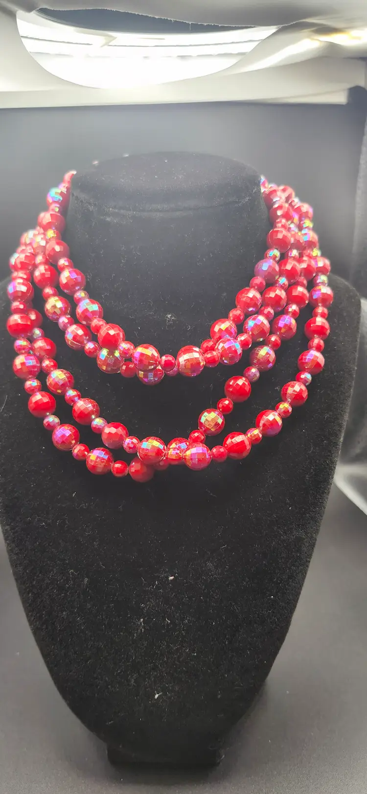 Add a pop of color to your outfit with this vibrant red multi-strand beaded necklace. Featuring glossy red beads with a hint of iridescence, this piece is perfect for making a bold statement. Whether you're dressing up for a special occasion or adding flair to your everyday look, this necklace is a must-have accessory.