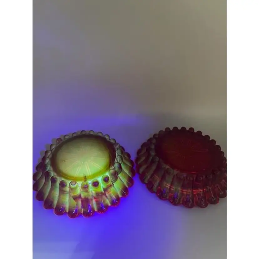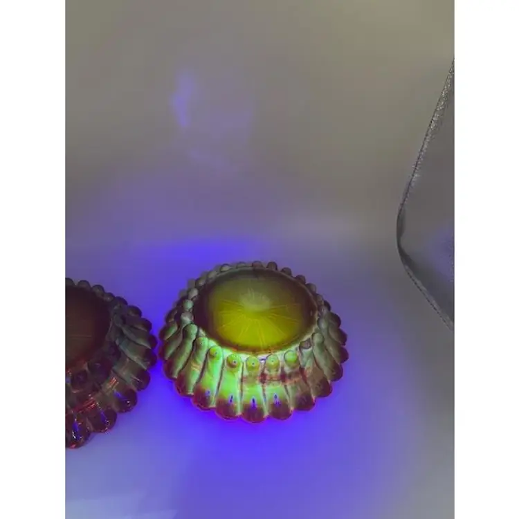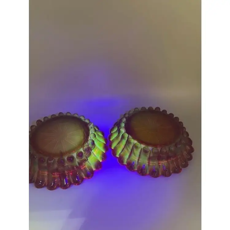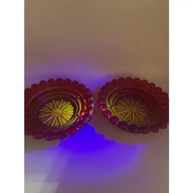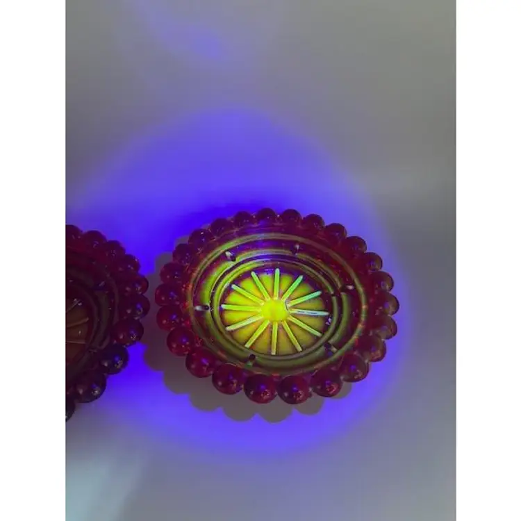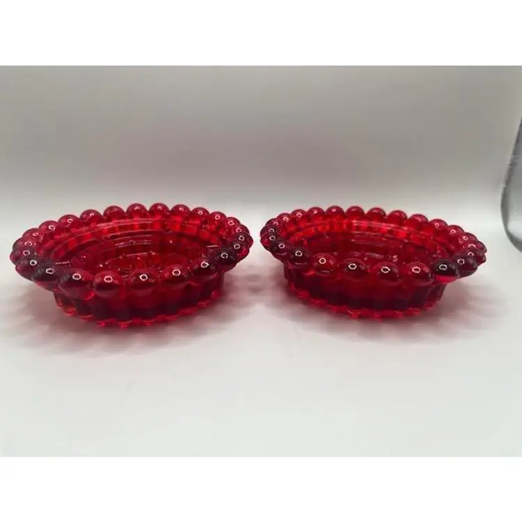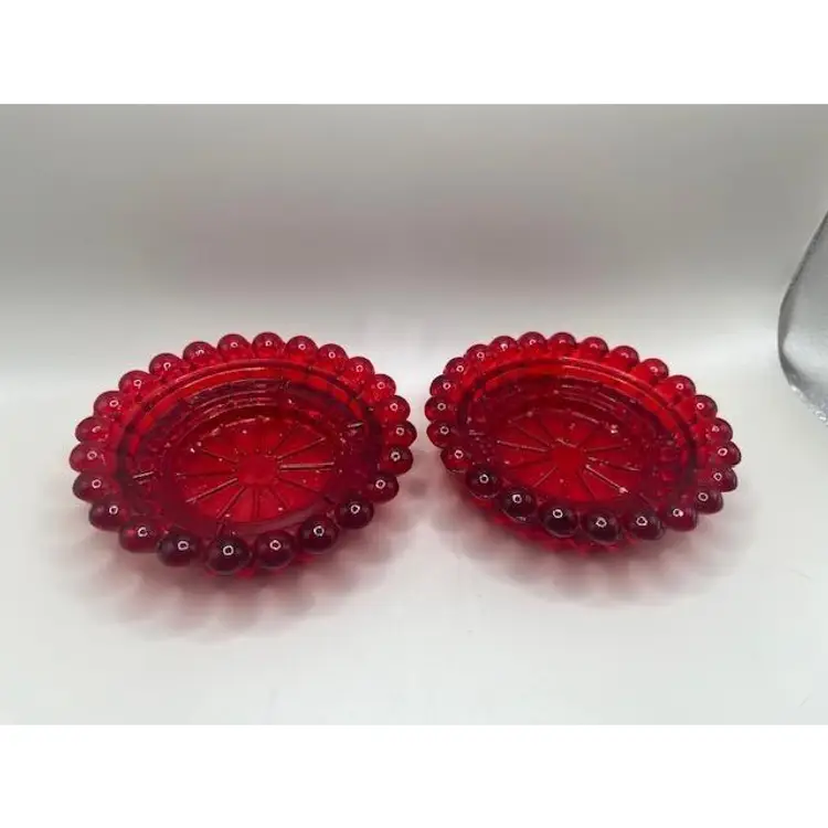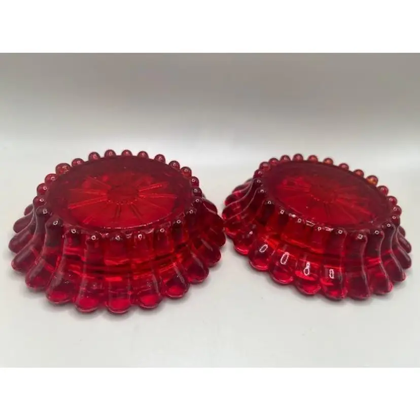 Add a pop of color to your table with this set of two vintage ruby red glass dishes. Featuring a charming beaded edge design, these dishes are perfect for serving or display. Excellent condition and ready to enhance your decor.
