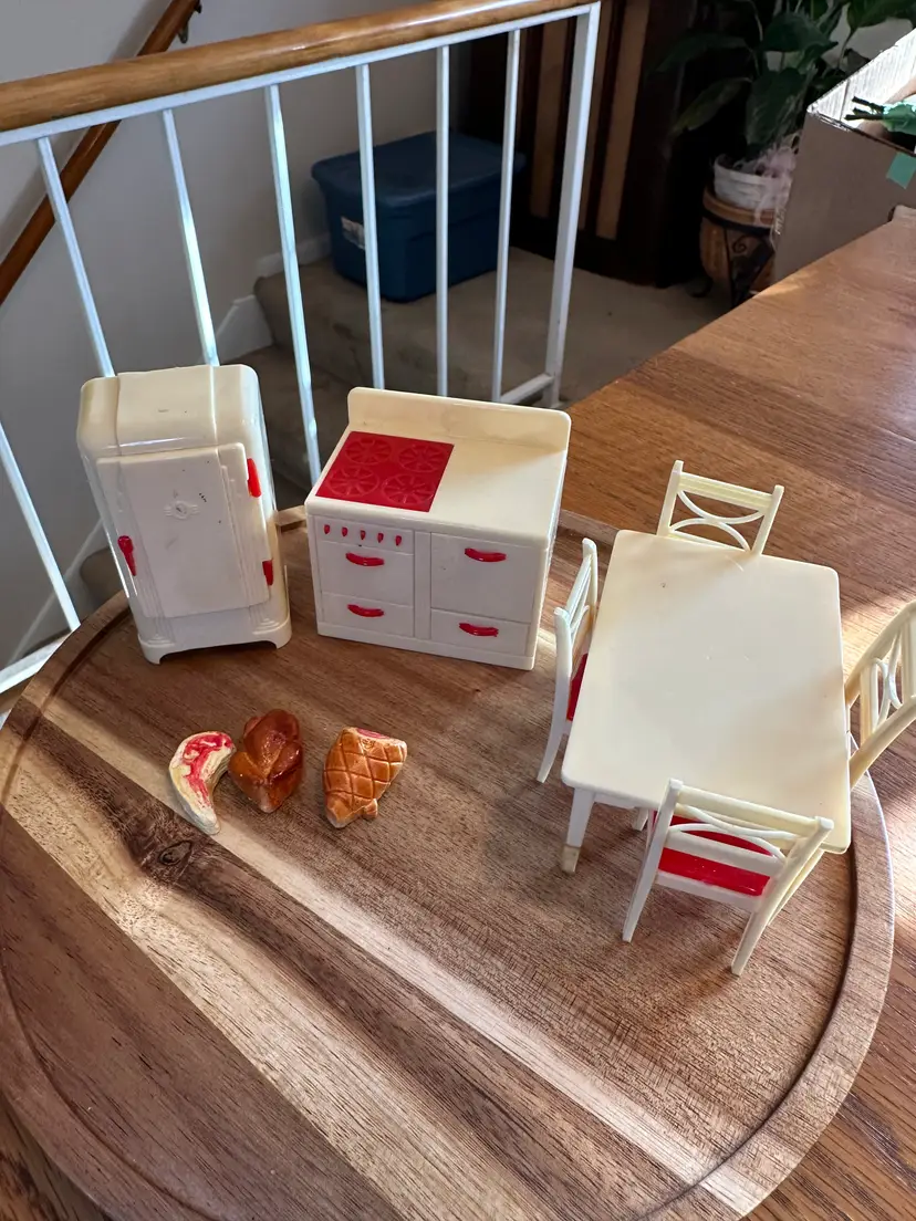 Vintage A Renwal Product Dollhouse Furniture. Set includes a table with four chairs, refridgerator with door and shelves, stove with working oven door, a ham, turkey and steak, and one small stool (not shown). These were popular in the 1940s to 1960s.