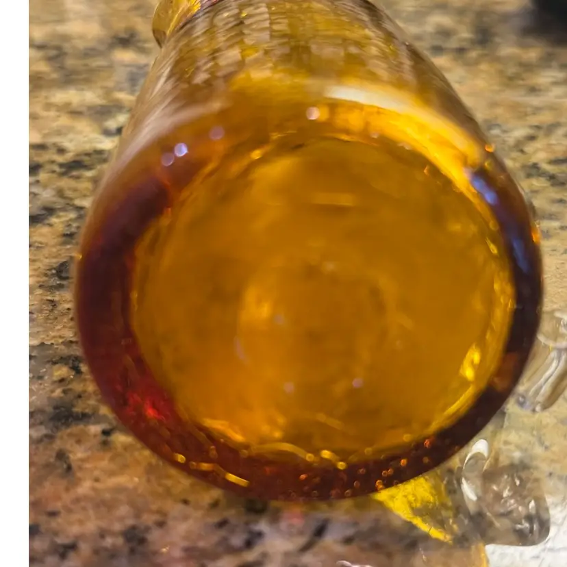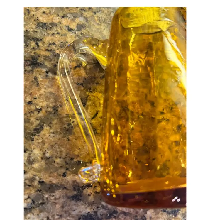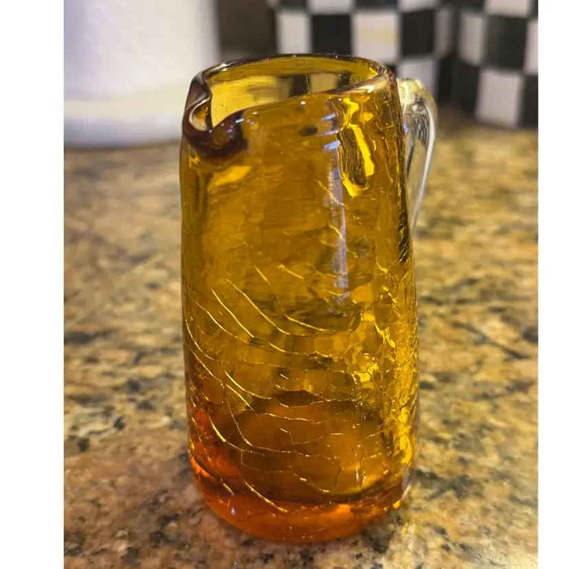 Beautiful blown crackle glass pitcher with applied clear glass handle. Would make for a lovely decor piece or filled with some wildflowers! Measures 3 3/4” tall.