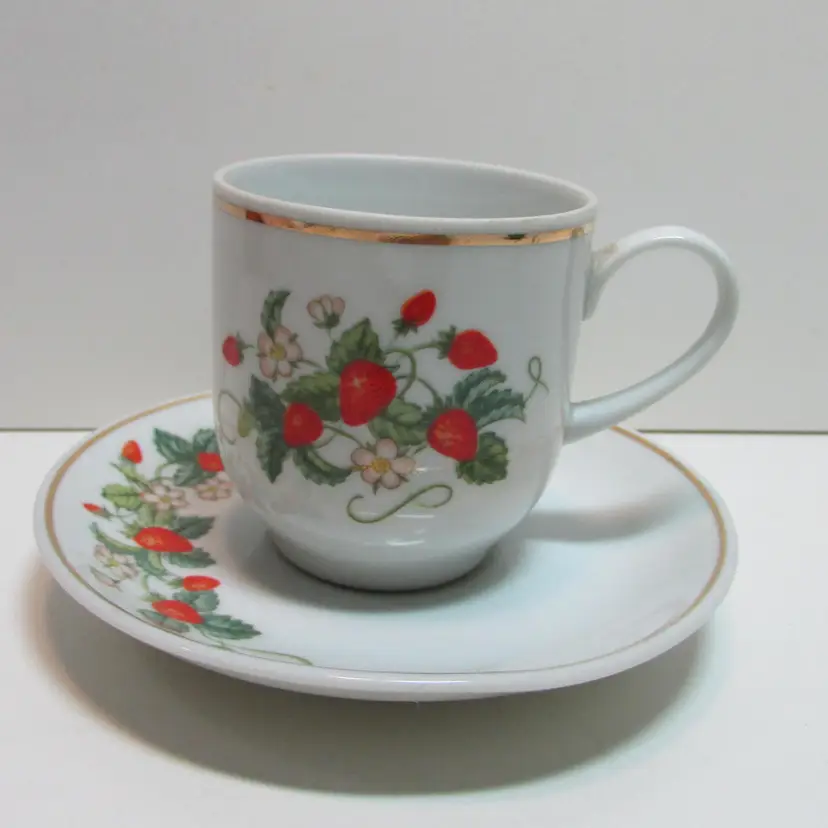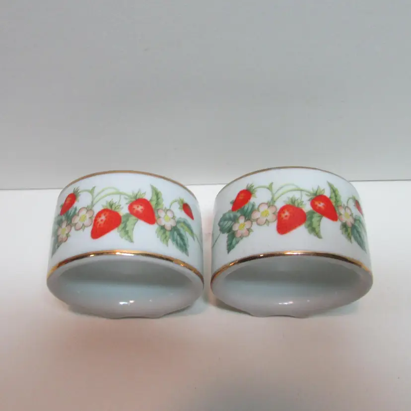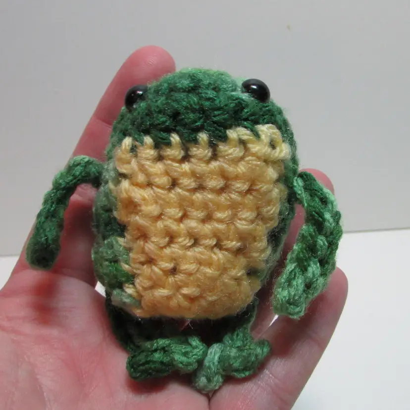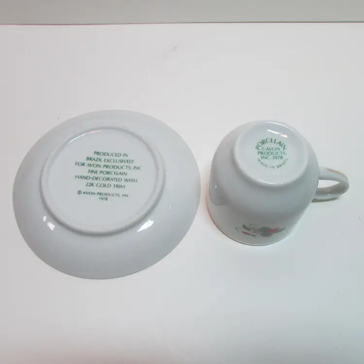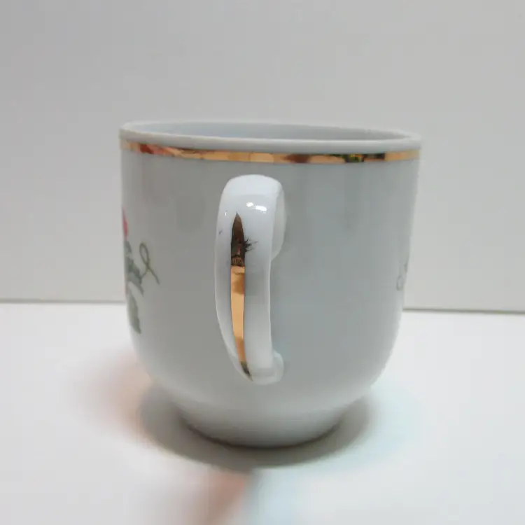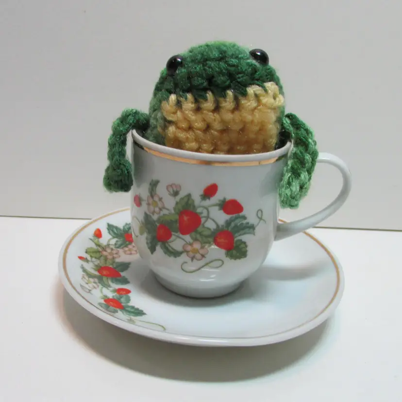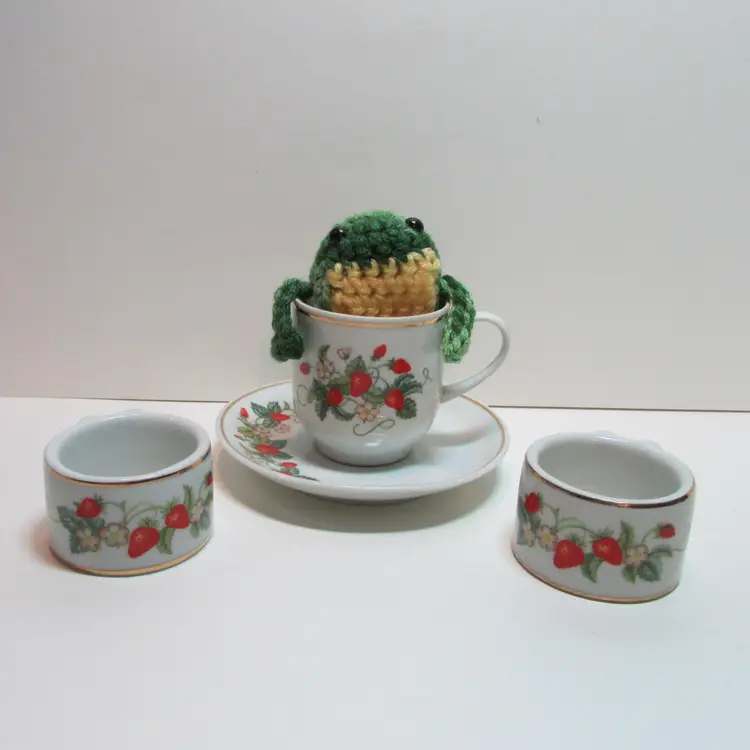 This lovely demitasse cup, saucer and napkin ring set is in good condition. The cup is about 2 1/2" x 2" x 3", saucer is about 4 1/2" round and the napkin rings are each about 2" x 2" x 1 1/4". I crocheted the frog, I am just learning crochet so he has some imperfections, but still cute to sit by the cup. His eyes are glued in, so I would not give this to a child as a toy, just to display. He is about 3". This is shipped from a smoke free home. Thanks for looking! locfb10