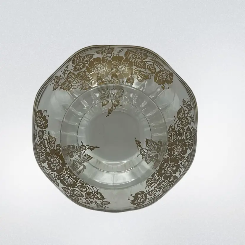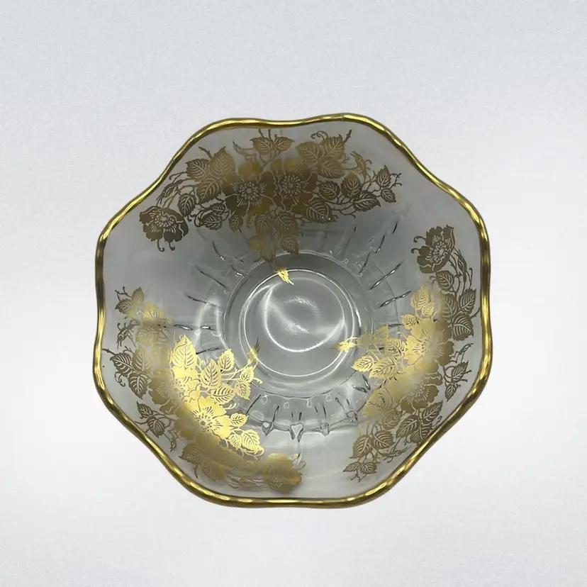 Featuring a stunning gold overlay and footed with a scalloped edge with gold trim, mint condition!