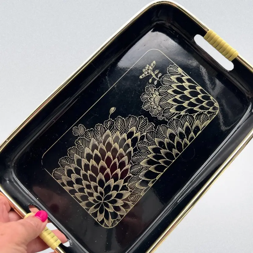 This tray is marked Made in Japan, a hallmark of mid-century export décor and serving pieces. It’s perfect as a vanity tray for perfume and jewelry, a bar cart accent, coffee table catchall, or a decorative piece layered into a vignette. The bold black and gold palette gives it timeless glamour with a touch of Hollywood Regency style.