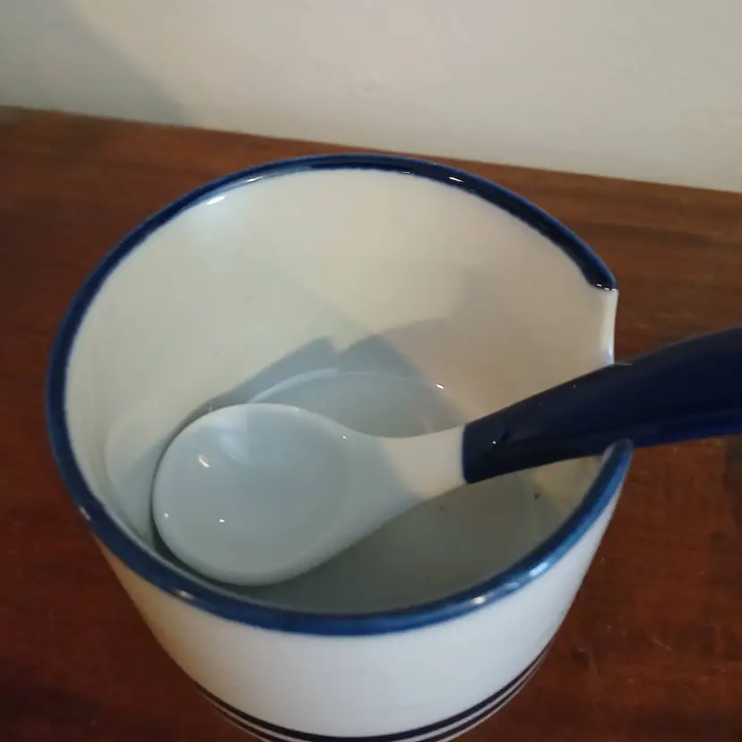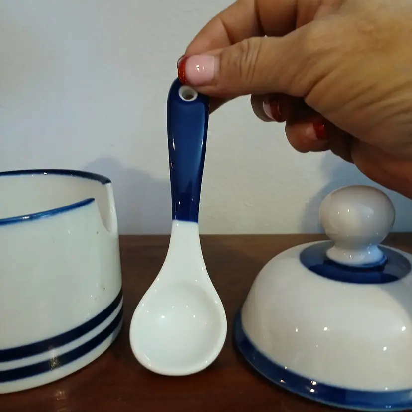 It's rare to find them with their original spoons - but this one does have the original blue and white ceramic spoon.
