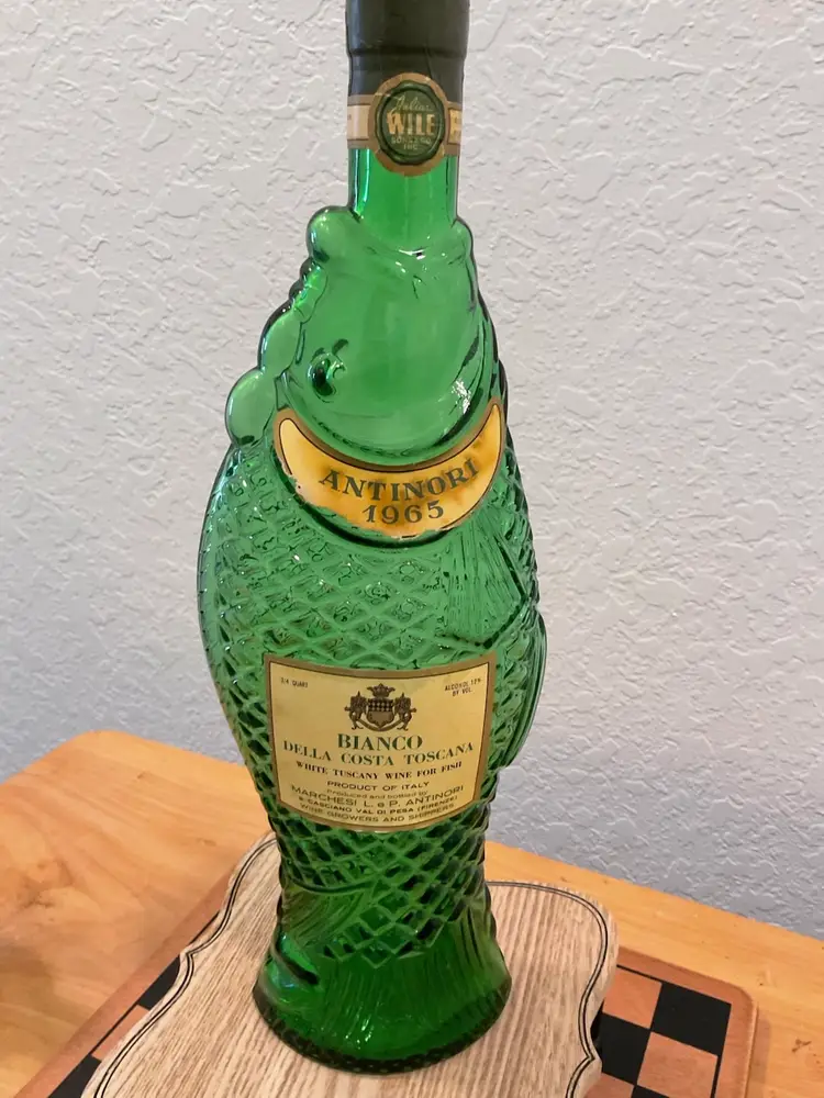 Buyer’s CHOICE of unique vintage bottles: 1965 Antinori Bianco della Costa Toscana green glass wine bottle shaped like a fish.