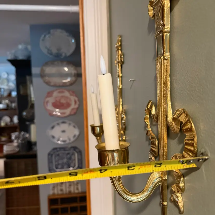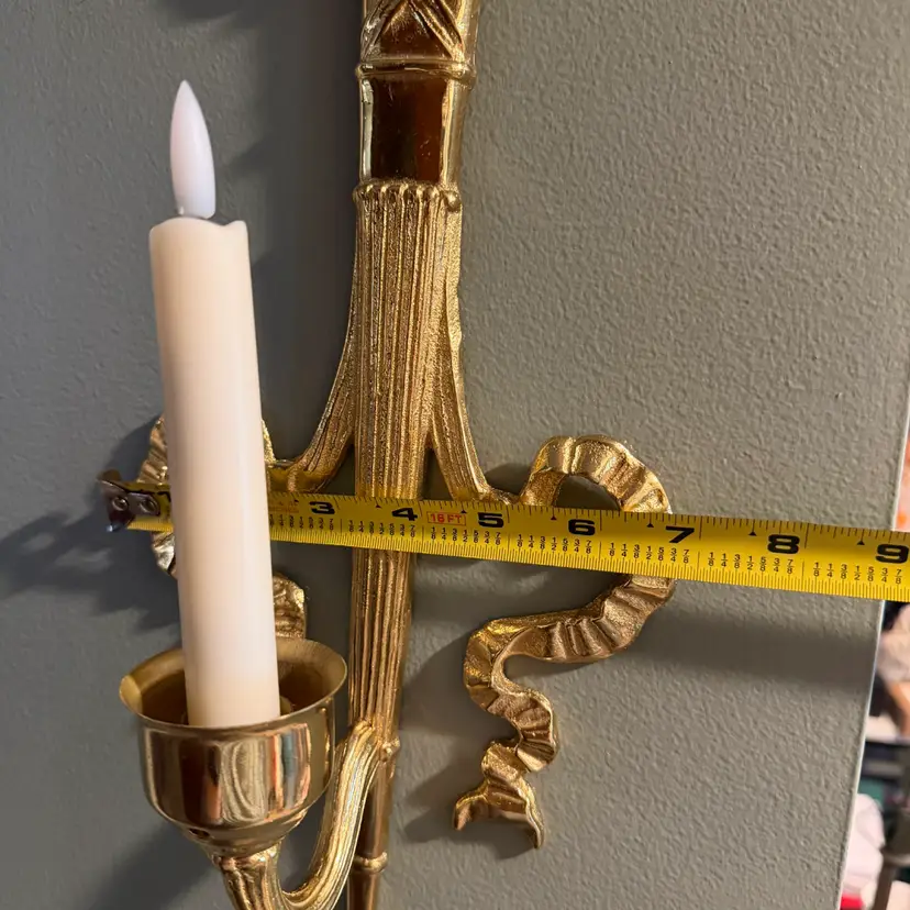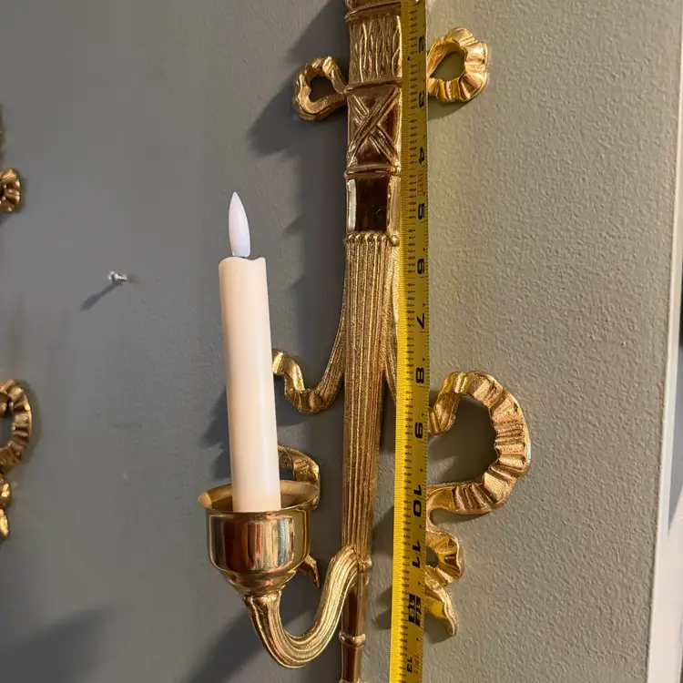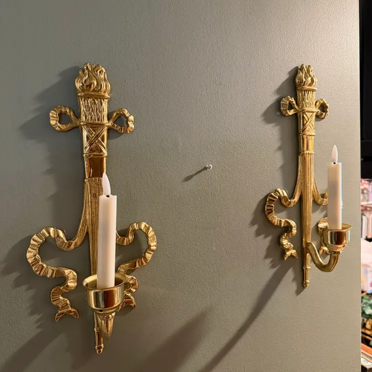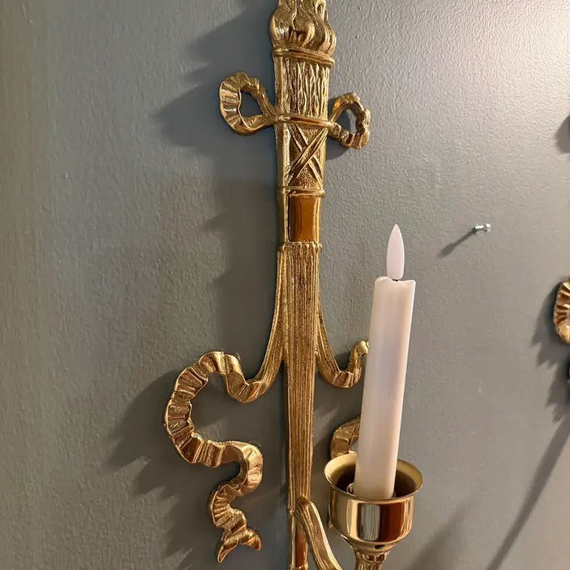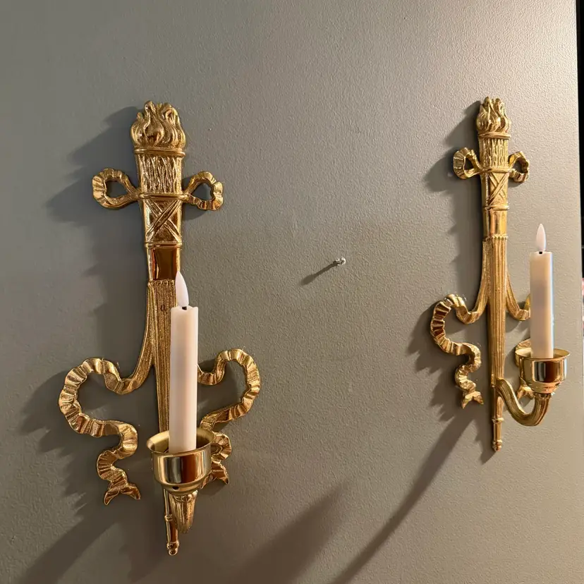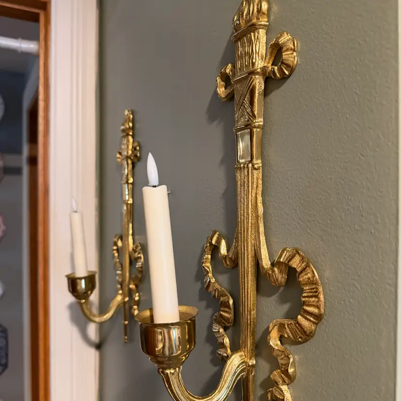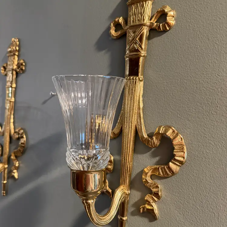 Vintage brass wall sconce Pair, often referred to as a "torch and ribbon" style candle holder. These were made by The Bombay Company, dated 1992. Elevate your home decor with these stunning vintage Bombay brass wall sconces. The intricate carvings and antique brass finish add a touch of Hollywood Regency style to any room.