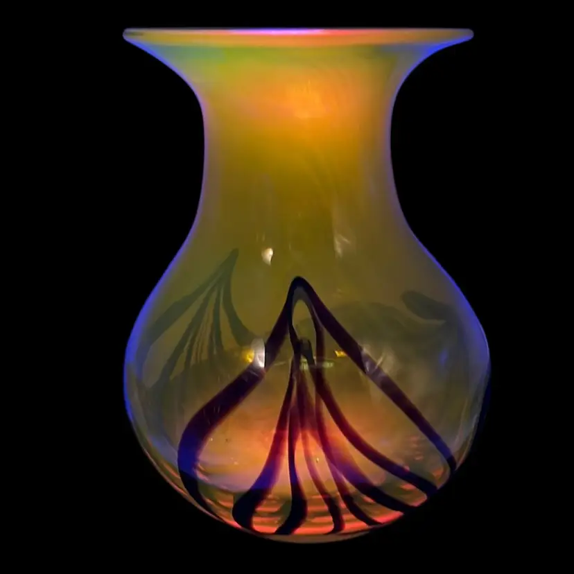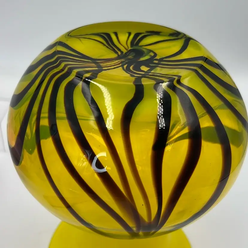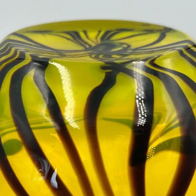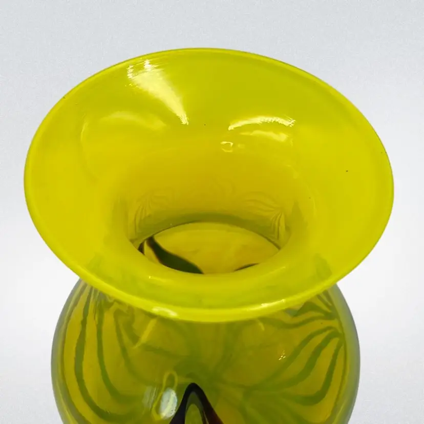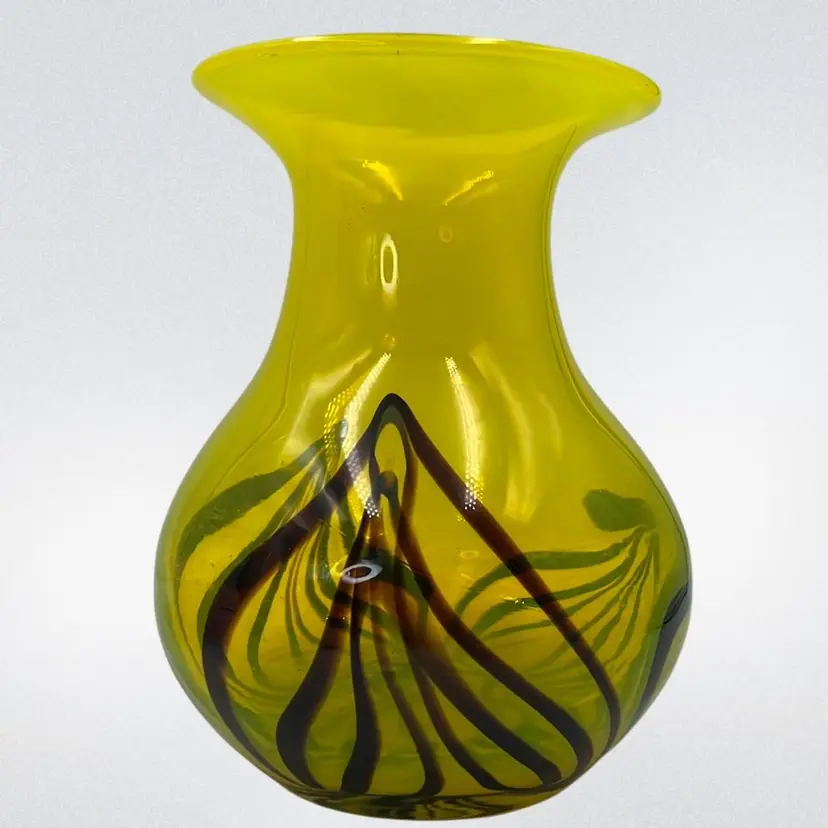 Mid century sun bright milky yellow glass vase with brown swirls. Awesome groovy color!