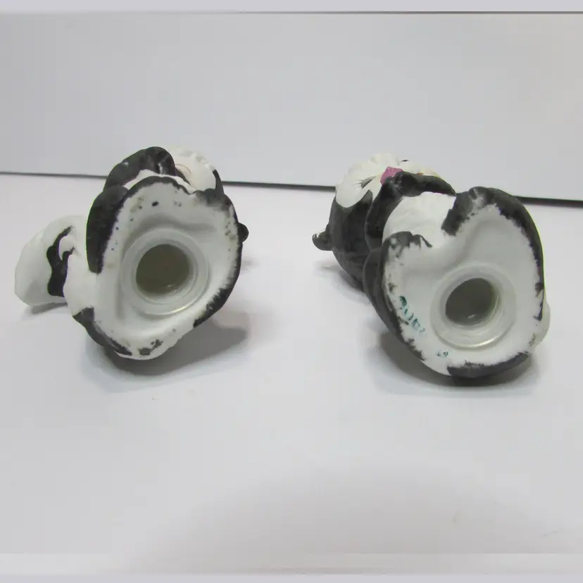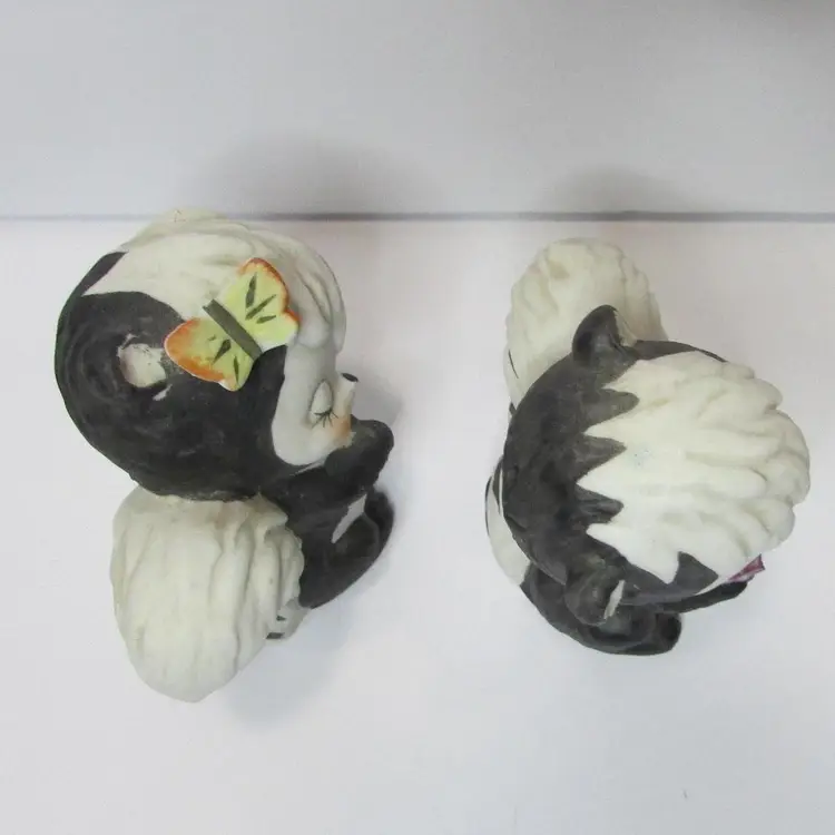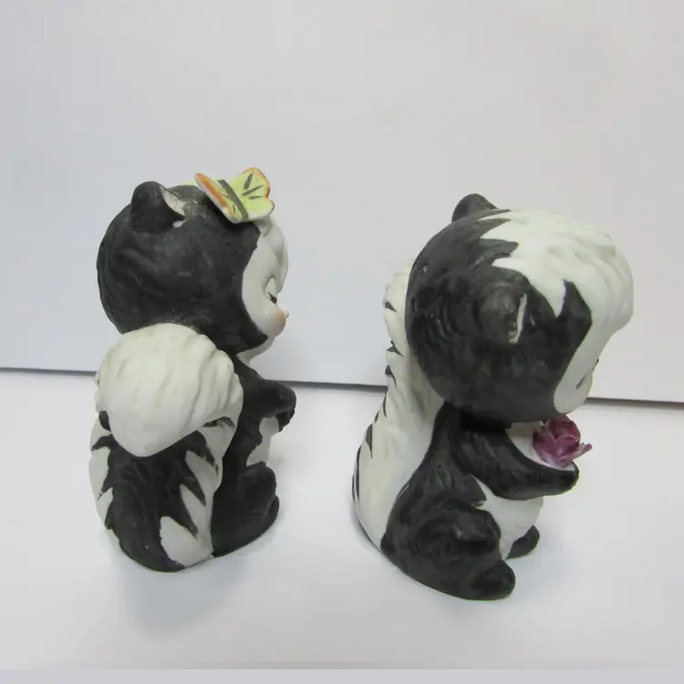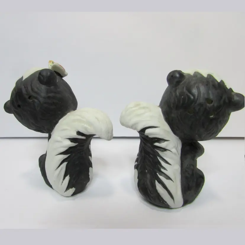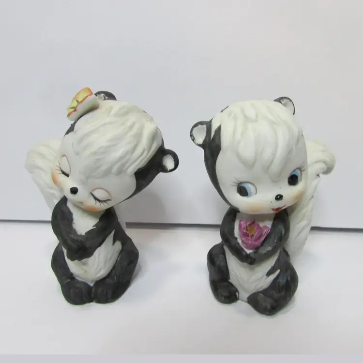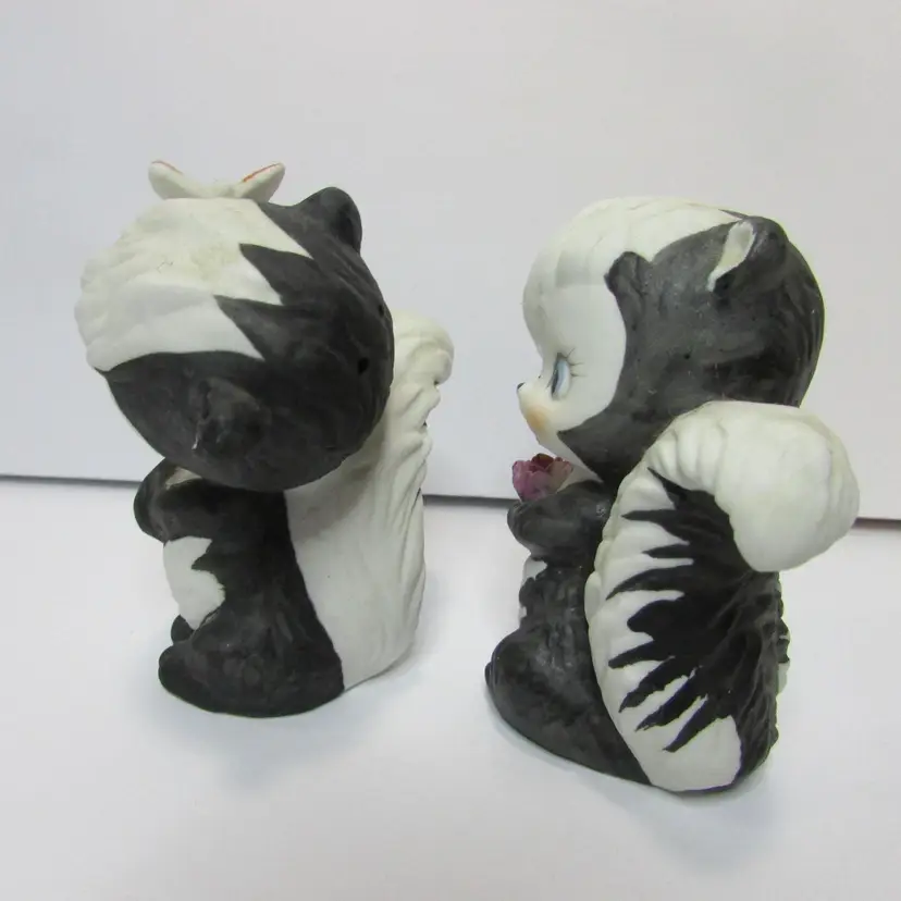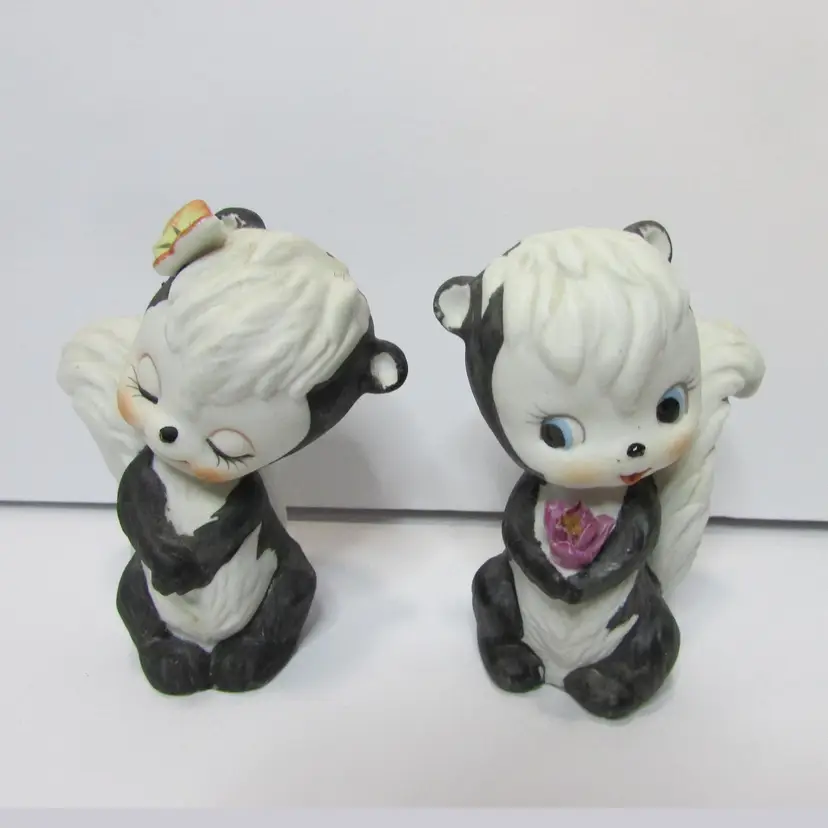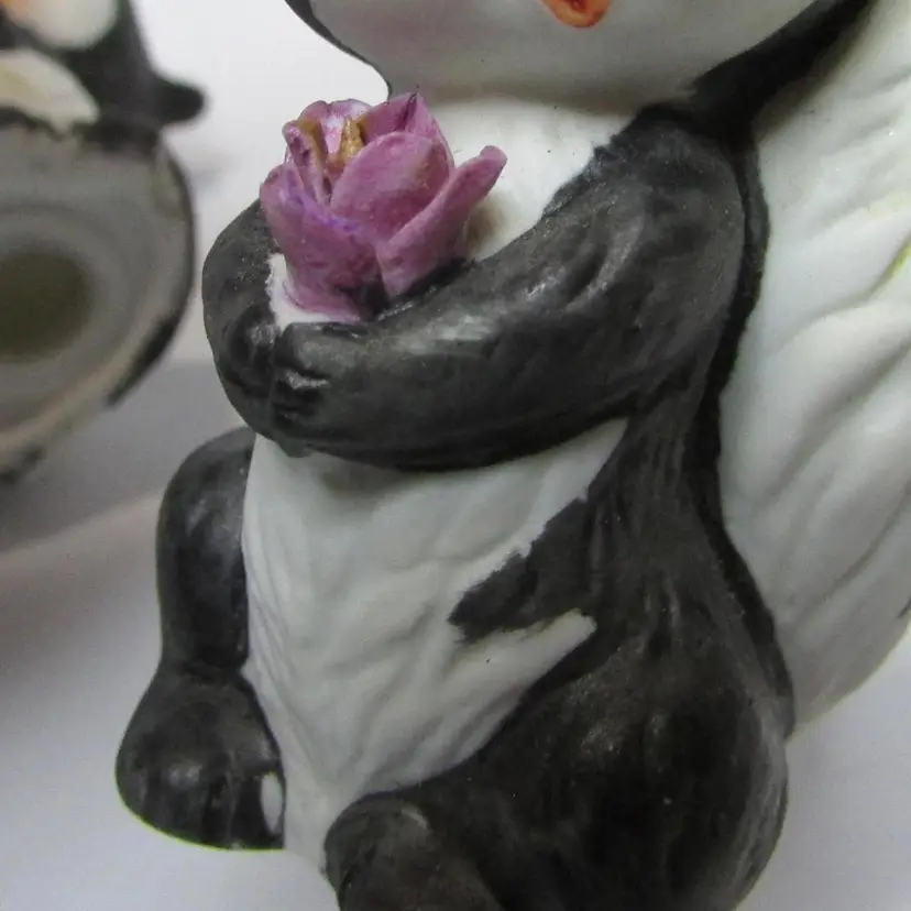 This adorable set has some some wear, there is a small chip on the skunk's flower. Still a lovely set to use and display.