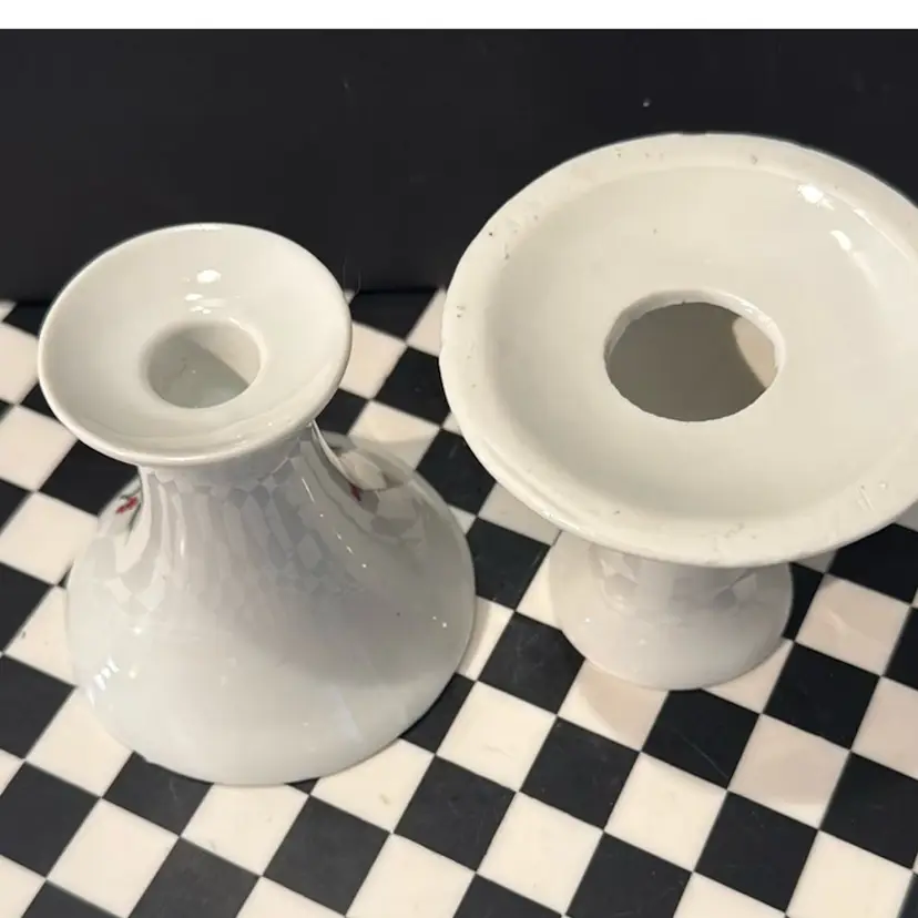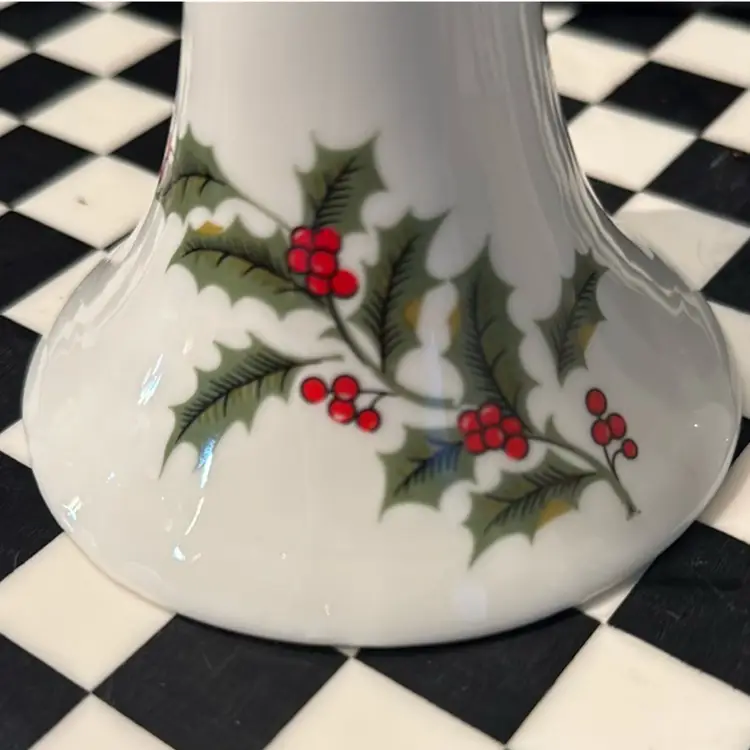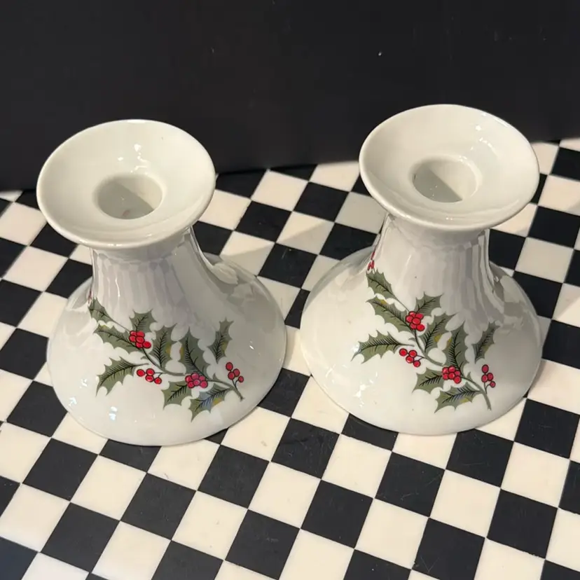 Super cute and versatile candle holder set. Christmas Holly with berries on one side and solid white on the other. Beautiful condition. Measures about 3 3/4 inches tall.