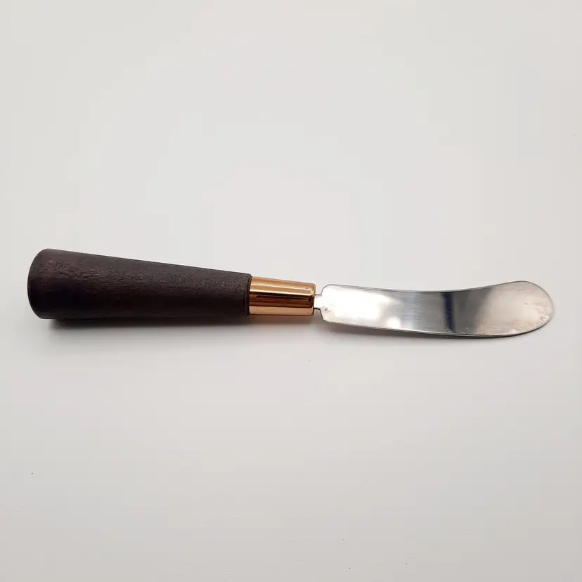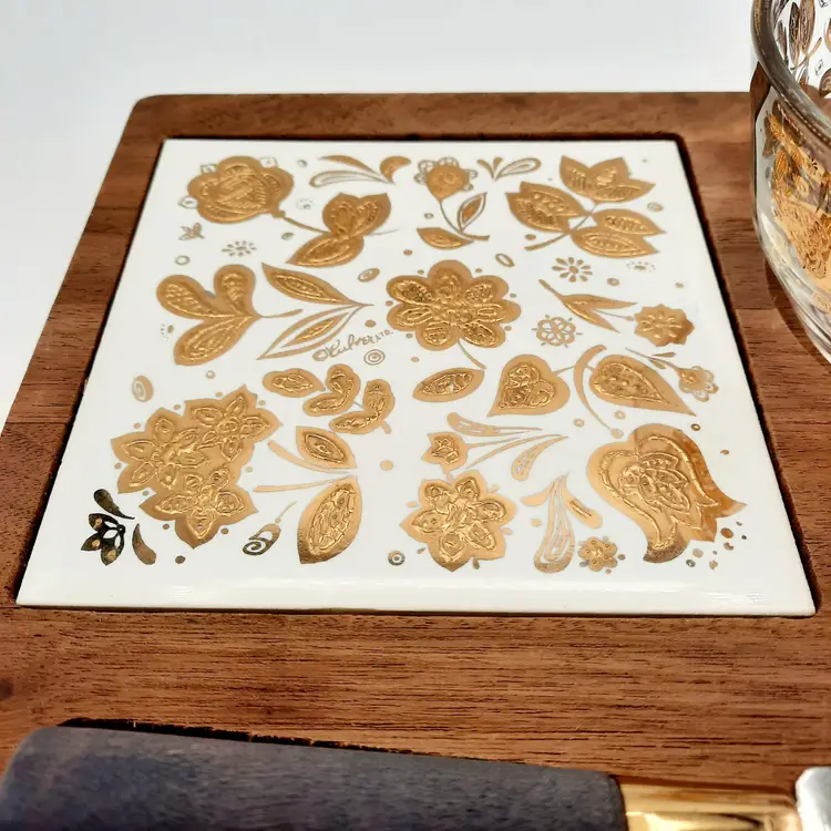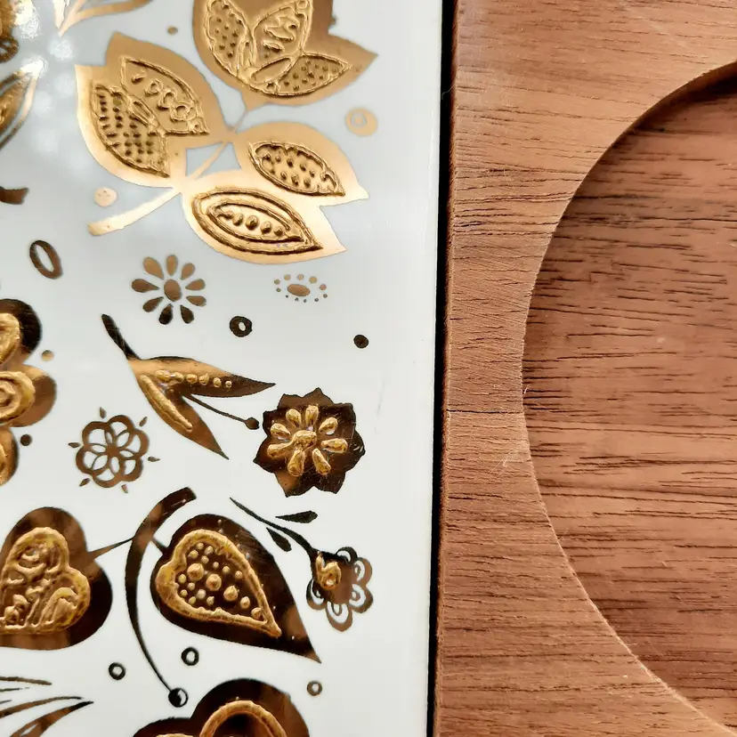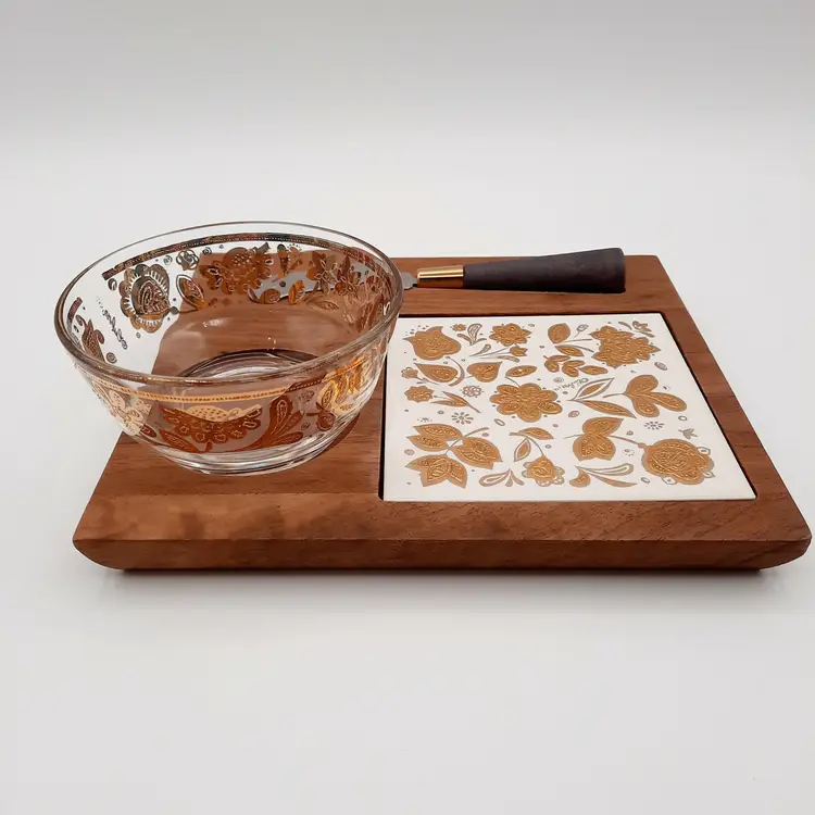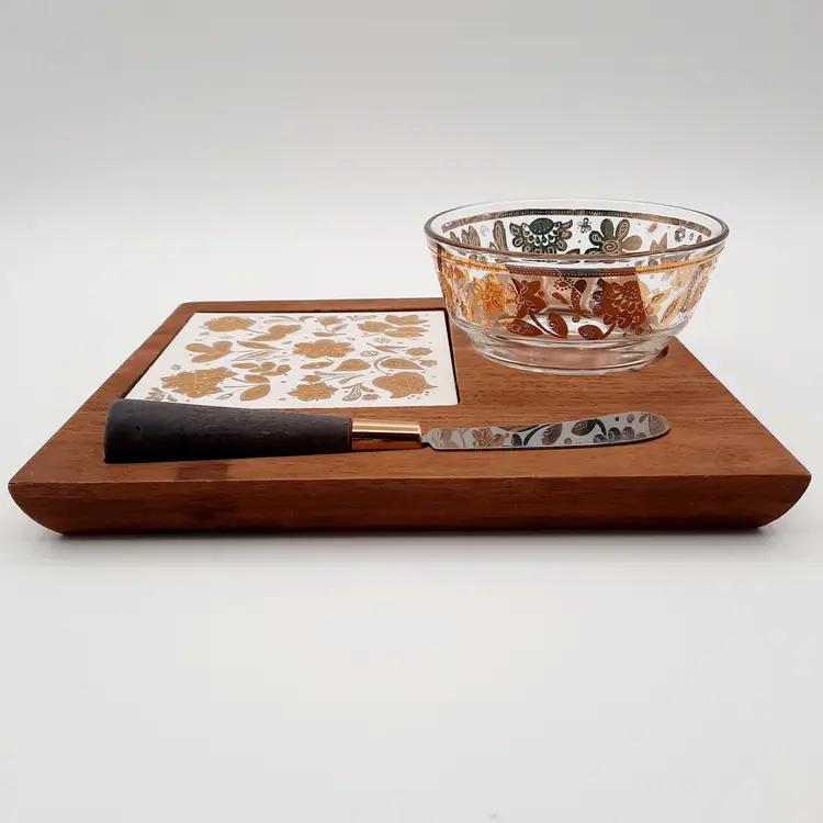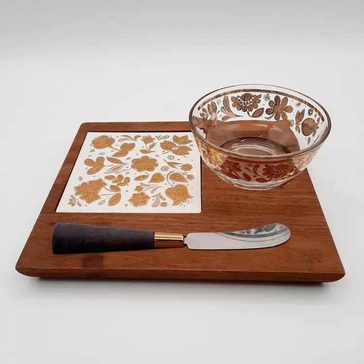 Fantastic vintage piece in great condition with some light wear to gold, blade on spreader is a bit loose so I would suggest gluing it if you intend to actually use it. Board is 8" x 7", bowl is 4"
