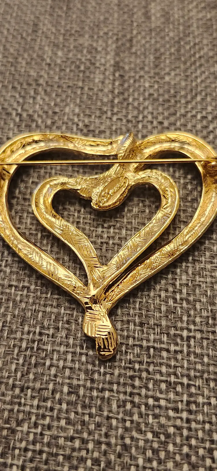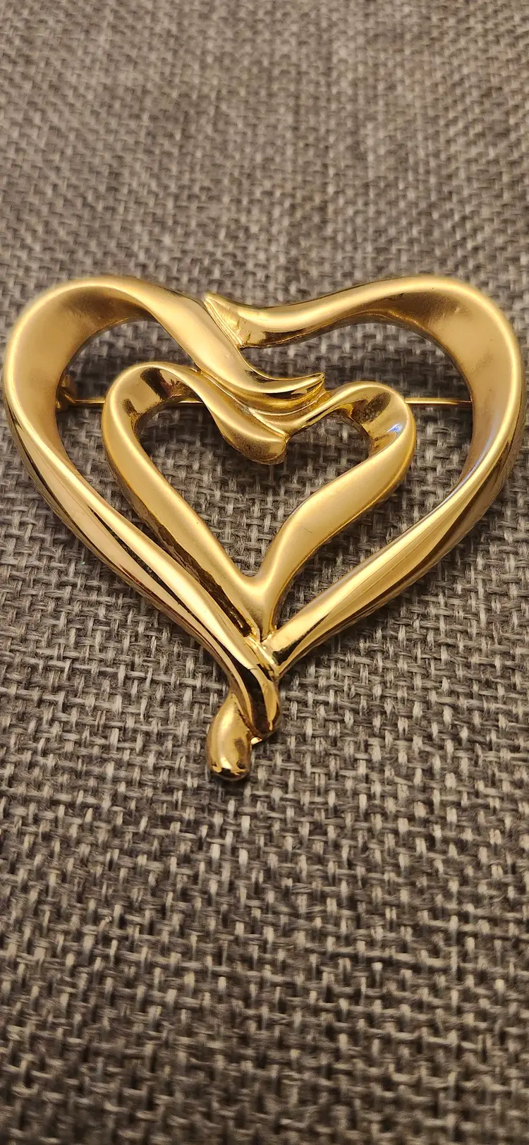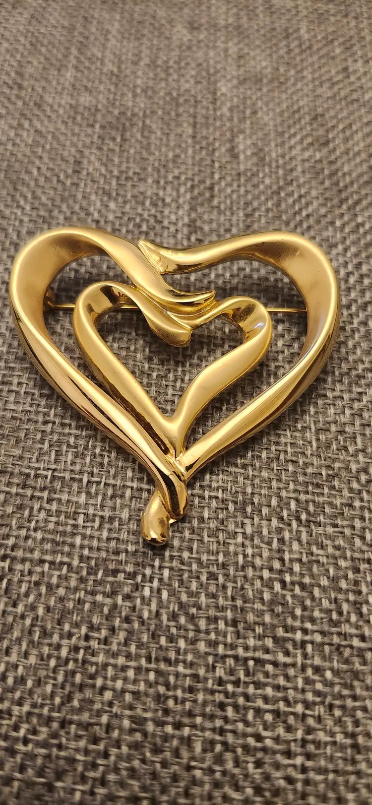 Brand: The brooch is identified as being made by Danecraft, a known American jewelry maker founded in 1934. Design: t features a distinctive double heart design, often with one heart nested within the other, and can be found in various finishes like gold tone or silver tone. Type: The item is a brooch, intended to be worn as an accessory, commonly used to adorn clothing, scarves, or hats.