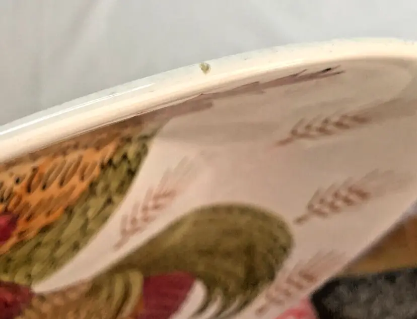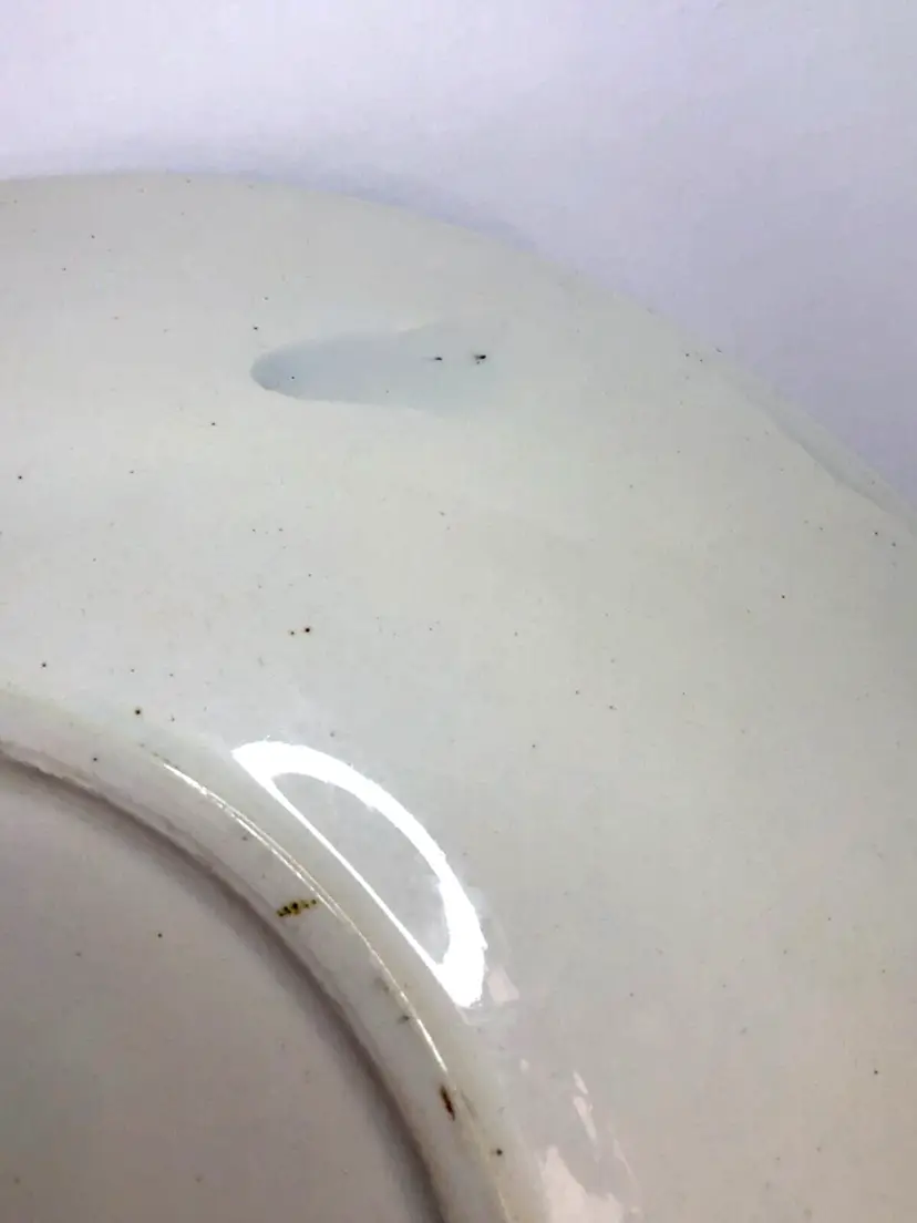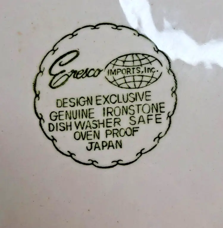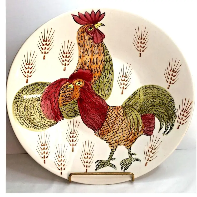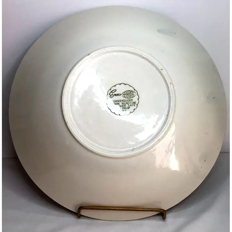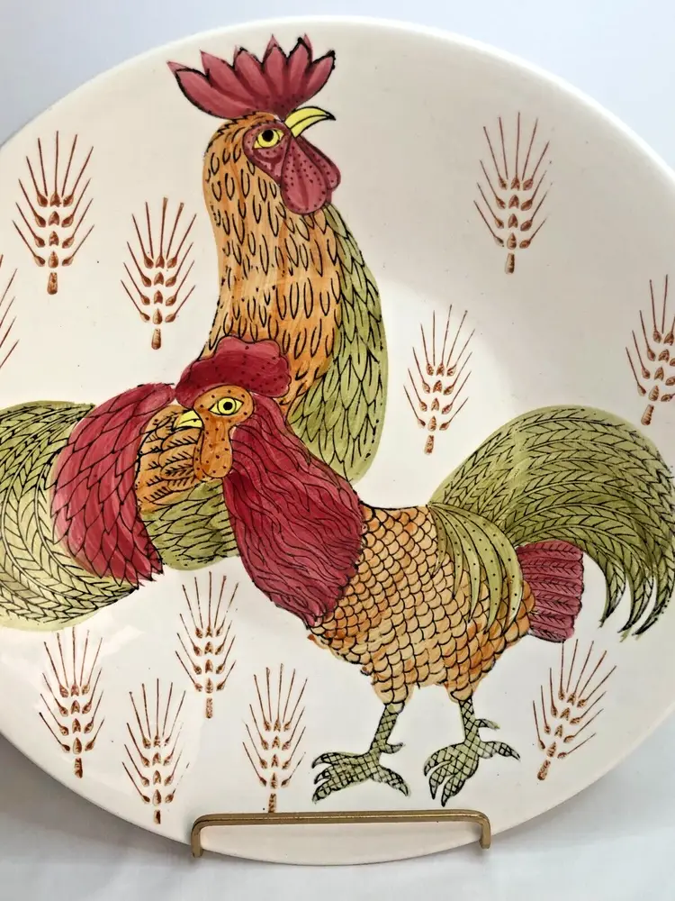 Vintage Enesco Japan 14" Platter Bowl Roosters Chickens Wheat Ironstone MCM Mid Century Mod. Good used condition. No cracks. One little glaze pop on rim as shown. Some glaze drip on back. Please see photos. Design Exclusive. Genuine Ironstone. Dishwasher safe, ovenproof. Made in Japan. Centerpiece Bowl. Heavy and Large.